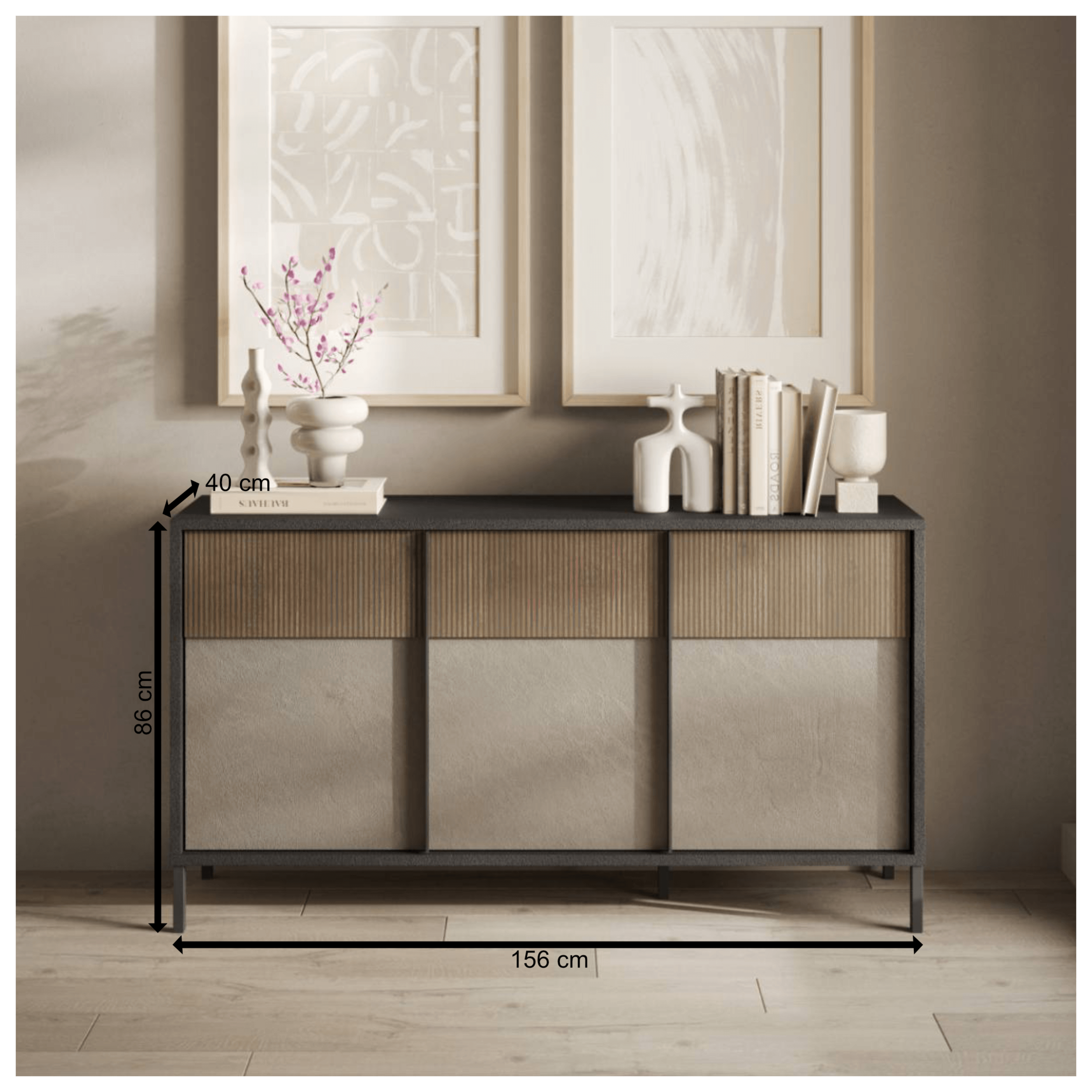 Komoda disponuje úložným priestorom, kam ukryjete nielen oblečenie, ale aj ďalšie nevyhnutnosti. Za troma dvierkami môžete naplno využiť vnútorný priestor. Celkovú manipuláciu uľahčí systém dovierania SOFT CLOSE. Konštrukciu dopĺňajú kovové nohy, ktoré okrem iného umožňujú ľahšie upratovanie pod nábytkom. Komoda je vyrobená z laminovaného dreveného materiálu.