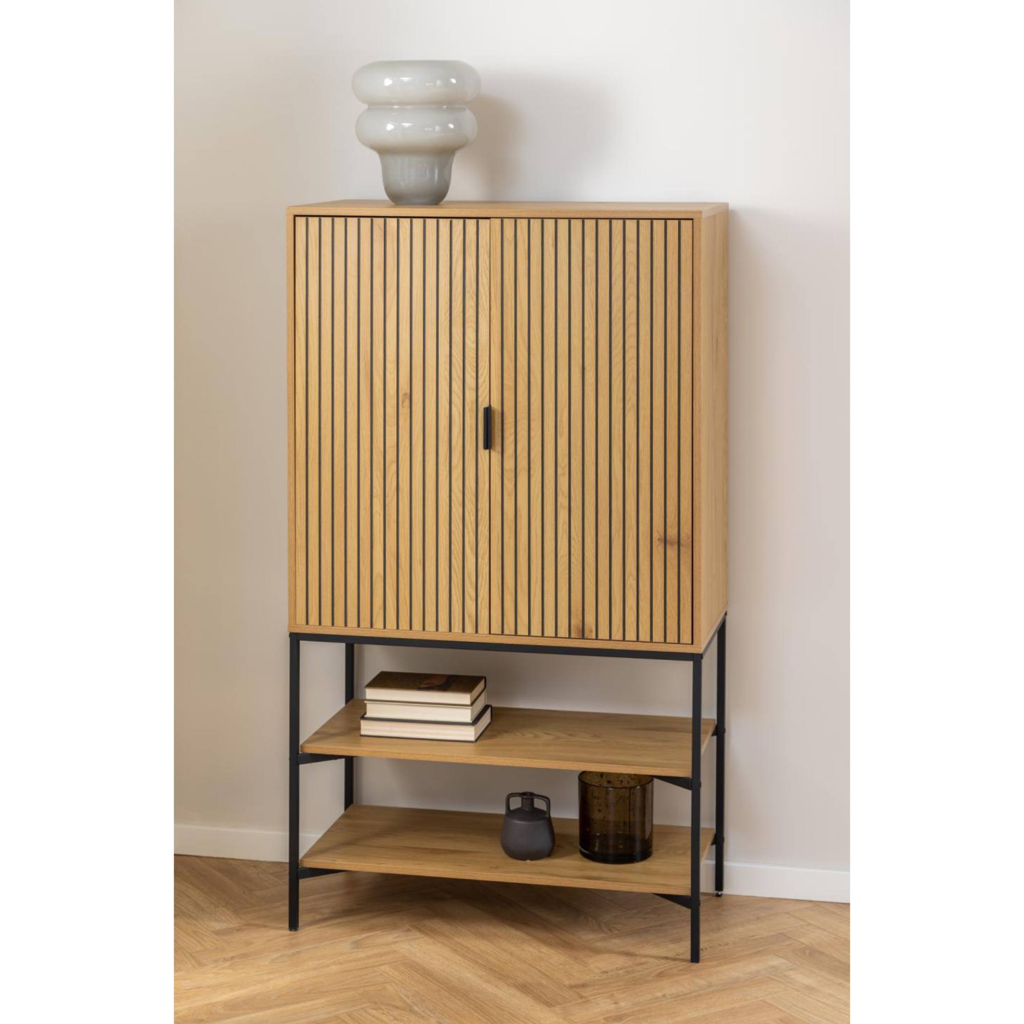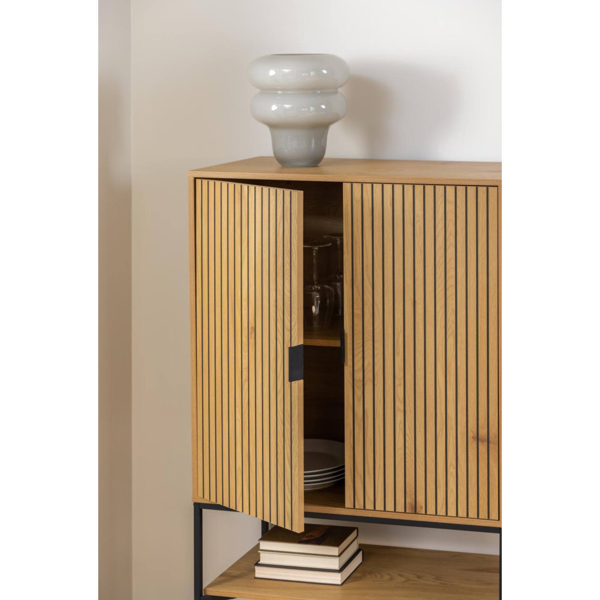 Komoda obsahuje miesto za dvierkami a otvorené police, ktoré vám poskytnú dostatok úložného priestoru na všetky predmety, ktorým chcete nájsť vo svojej domácnosti stále miesto. Praktické rúčky vám uľahčia celkovú manipuláciu. Povrch komody sa vyznačuje jednoduchou údržbou.