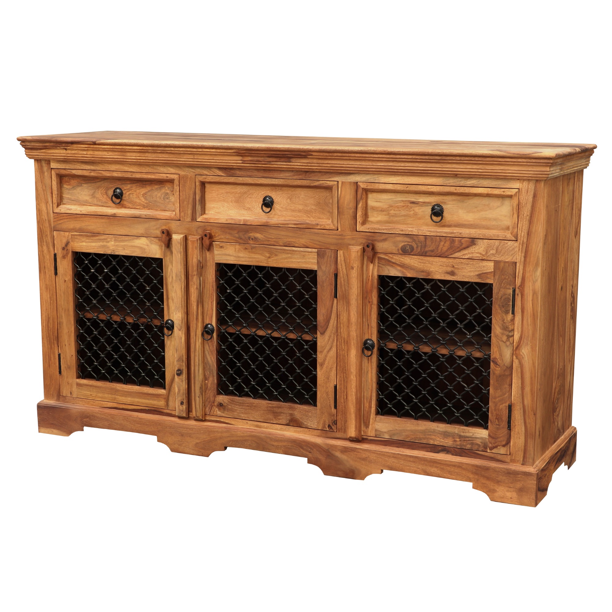 Komoda je prakticky členená – horná časť obsahuje 3 zásuvky, ktoré poskytujú dostatok úložného priestoru na drobnosti. Spodnú časť tvoria 3 dvierka, za ktorými sa nachádza vložená polica ideálna na organizáciu väčších predmetov, ako sú knihy, dekorácie a riad. Kovové rúčky a výplet dvierok dodávajú komode jedinečný rustikálny nádych.
