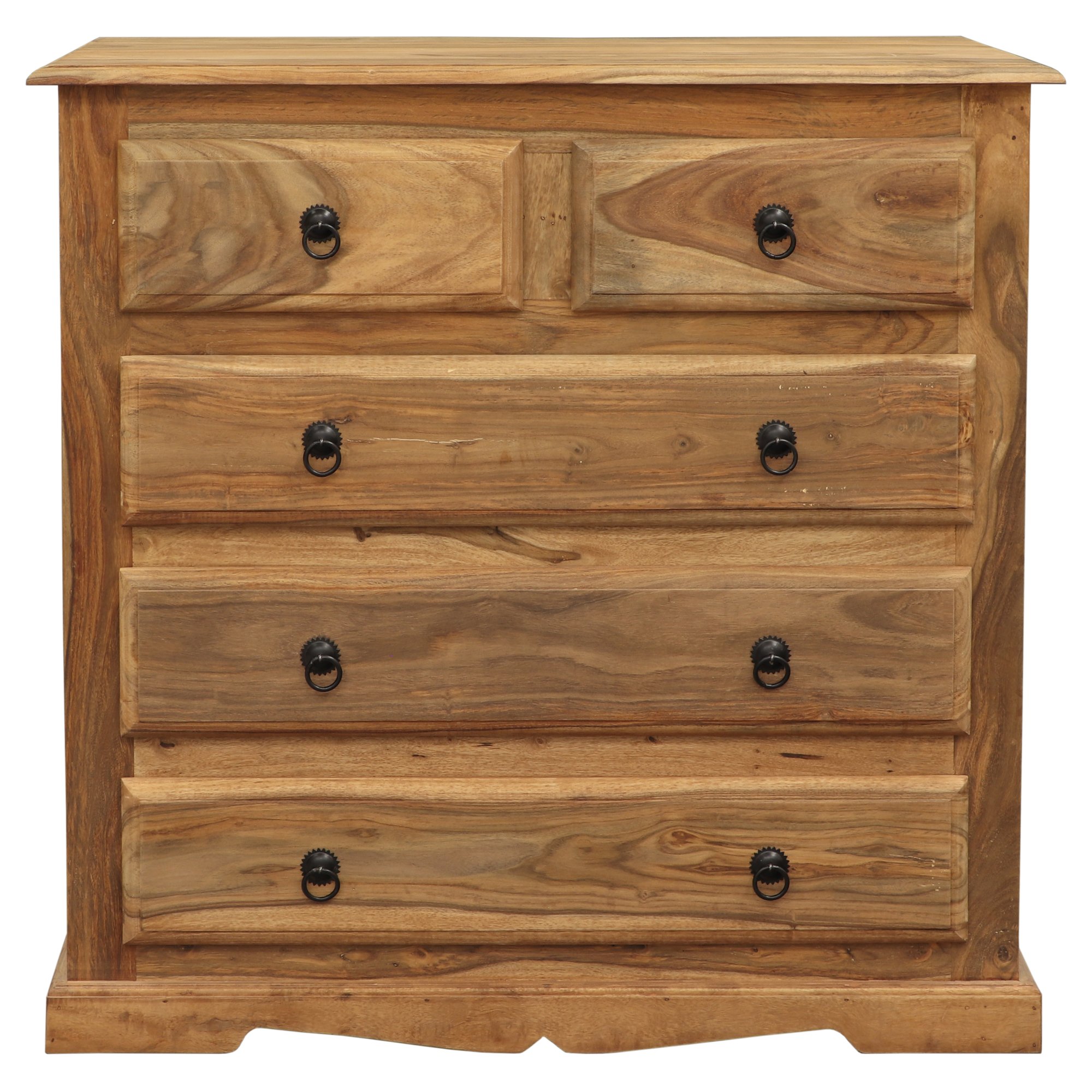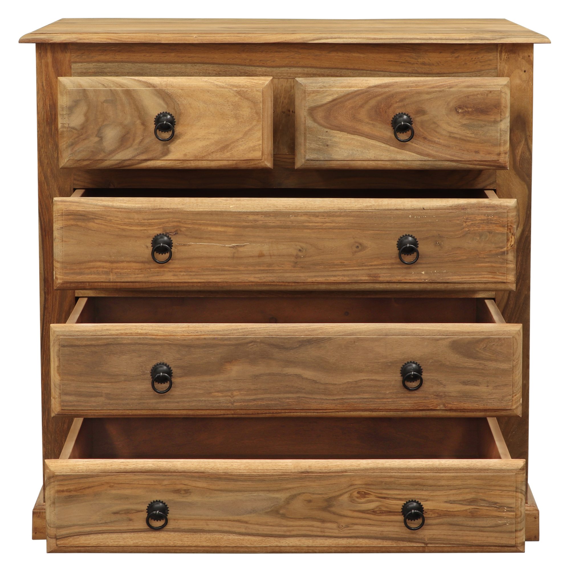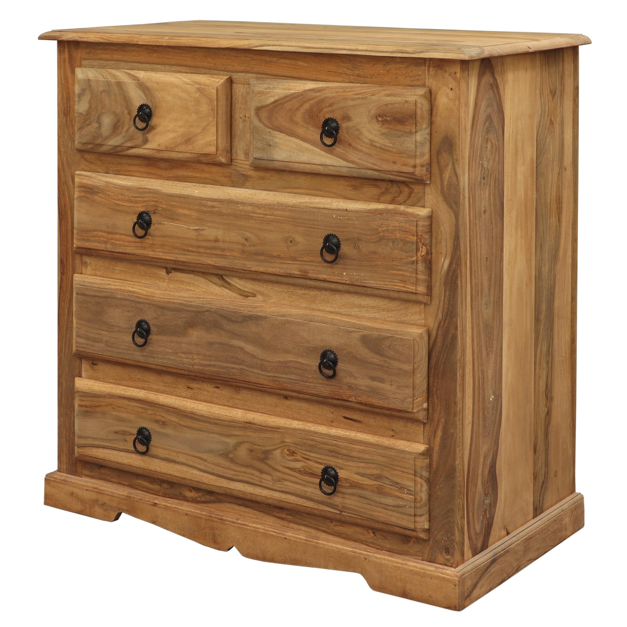 Komoda ponúka praktické úložné riešenie vďaka 5 zásuvkám, z ktorých dve horné sú menšie a tri spodné priestrannejšie. Každá zásuvka je vybavená štýlovými kovovými rúčkami, ktoré zvýrazňujú rustikálny charakter nábytku. Robustná konštrukcia a precízne spracovanie zaručujú stabilitu a funkčnosť, pričom komoda skvele zapadne do moderných aj tradičných interiérov.