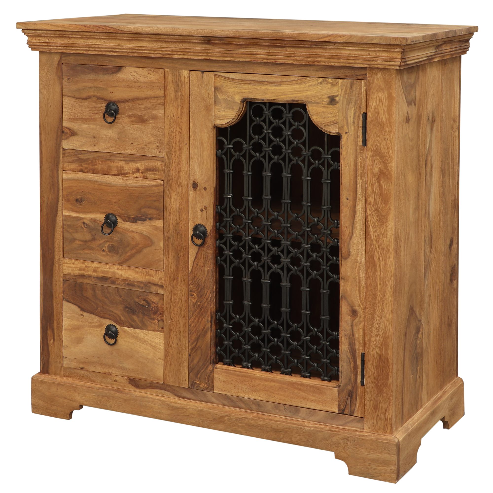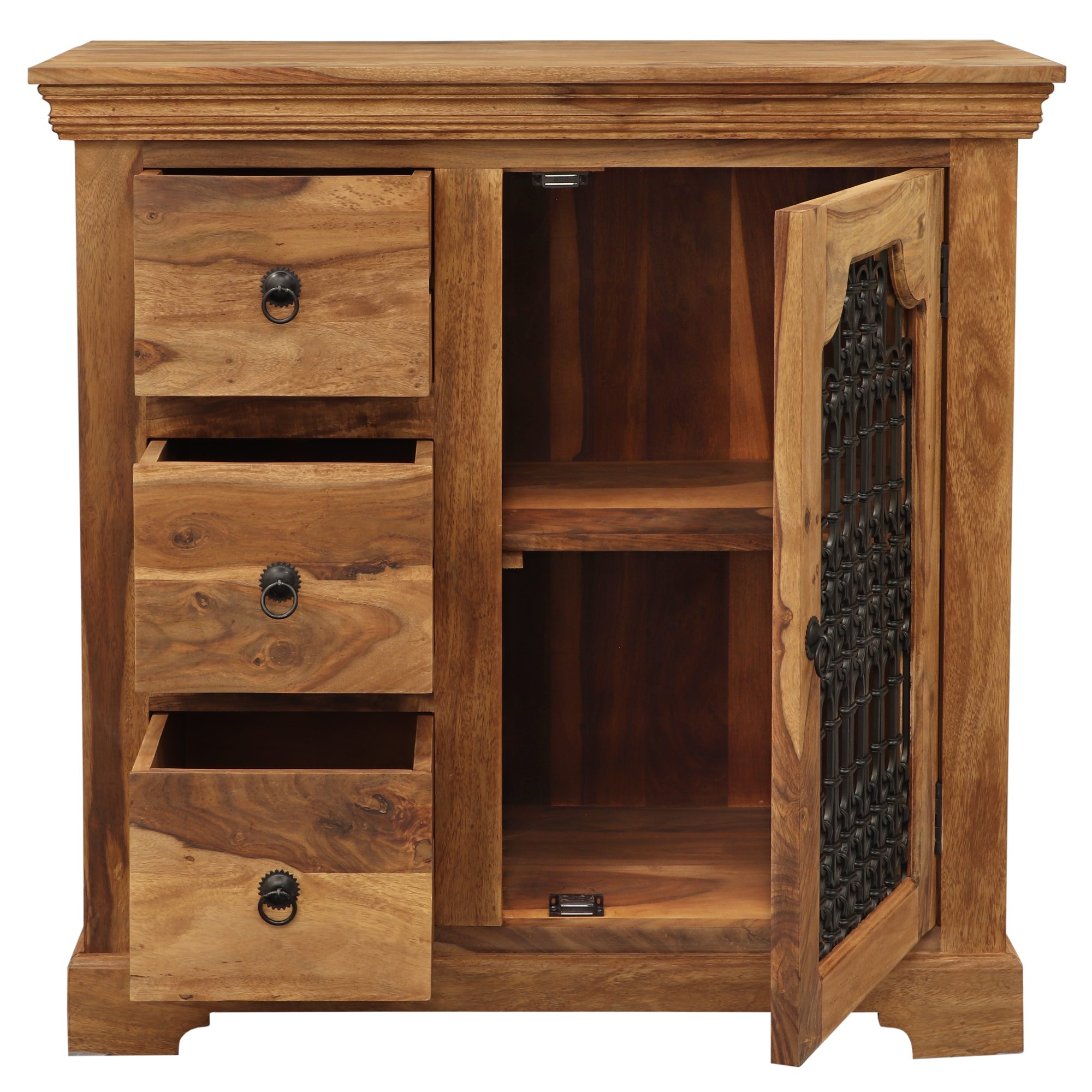Komoda ponúka premyslený úložný priestor: na ľavej strane sa nachádzajú 3 praktické zásuvky, ktoré poskytnú miesto na drobné predmety. Pravá strana disponuje jednými otváracími dvierkami so zdobeným kovovým mrežovaním, za ktorými sa nachádza vložená polica, ideálna na väčšie predmety alebo dekorácie.