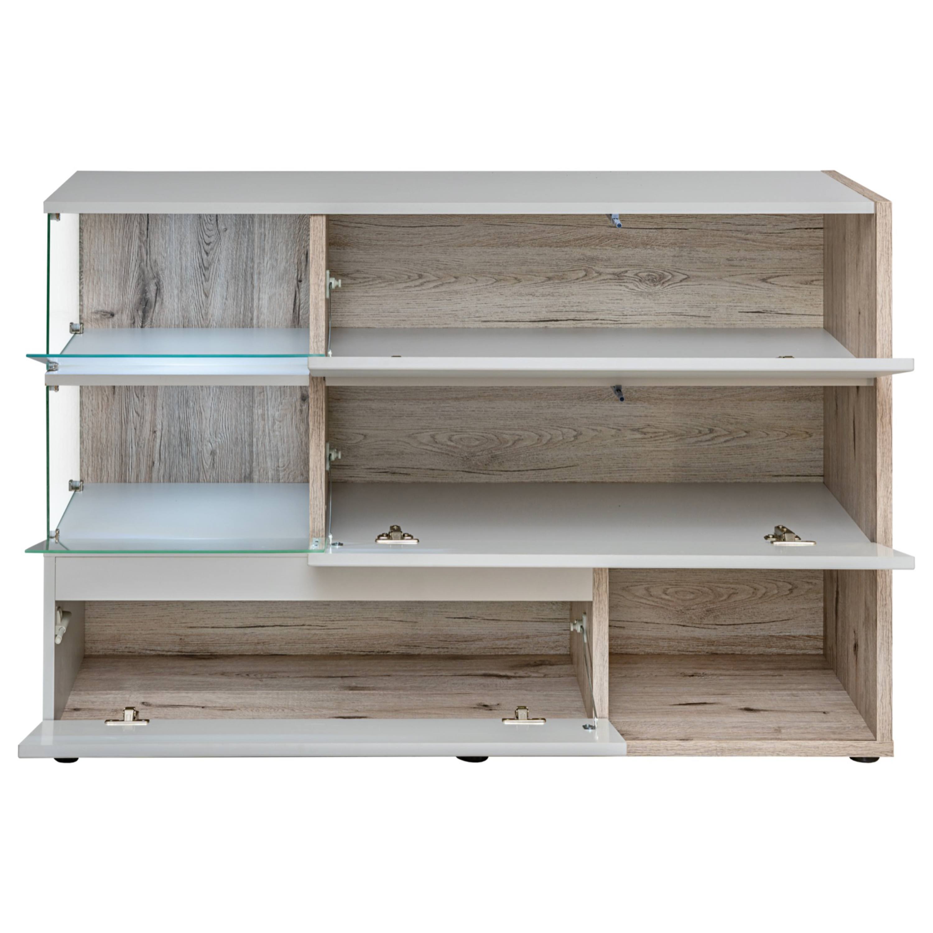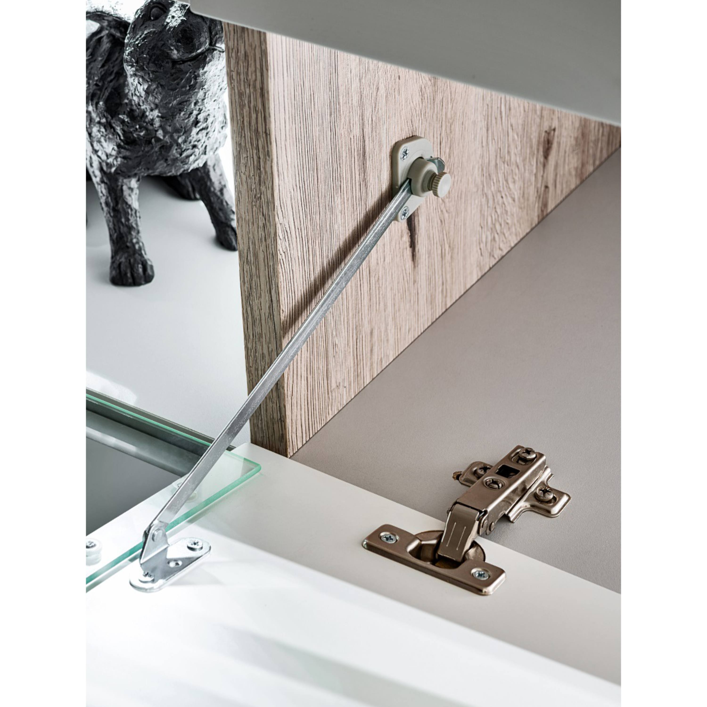Disponuje presklenou časťou, ktorá je osvetlená príjemným LED osvetlením. Tu sa budú vynímať vaše dekorácie, fotografie, ale aj knihy. Všetko potrebné, čo nechcete mať na očiach uschováte do troch výklopných dvierok. Obsahuje aj spodnú otvorenú priehradku na ďalšie drobnosti, ktoré potrebujete odložiť. Vyrobená je z ľahko udržiavateľného laminovaného materiálu.