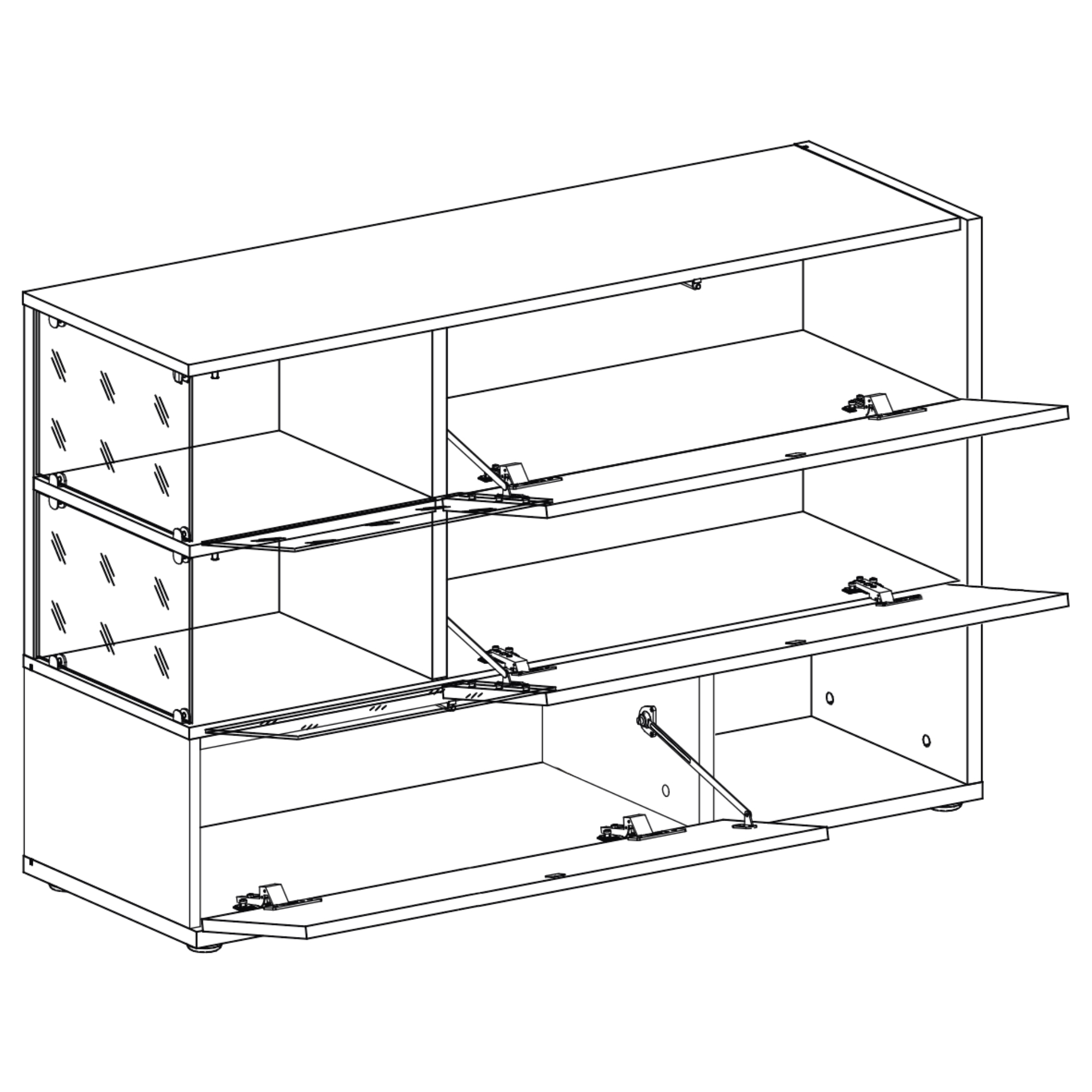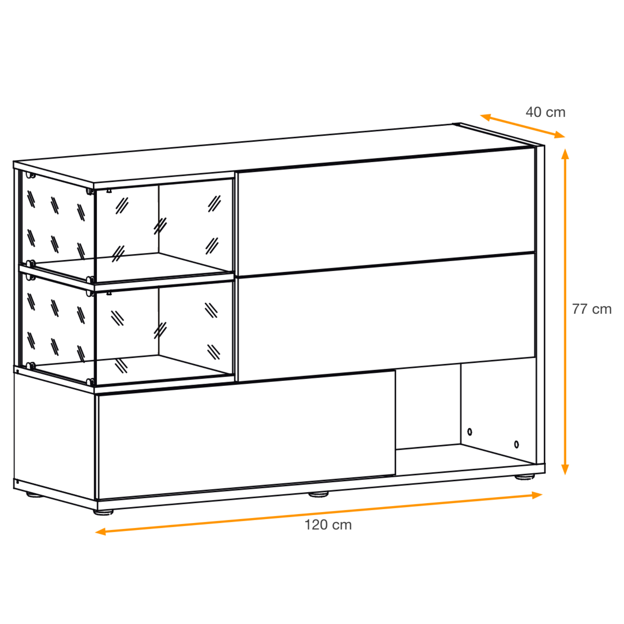 Disponuje presklenou časťou, ktorá je osvetlená príjemným LED osvetlením. Tu sa budú vynímať vaše dekorácie, fotografie, ale aj knihy. Všetko potrebné, čo nechcete mať na očiach uschováte do troch výklopných dvierok. Obsahuje aj spodnú otvorenú priehradku na ďalšie drobnosti, ktoré potrebujete odložiť. Vyrobená je z ľahko udržiavateľného laminovaného materiálu.
