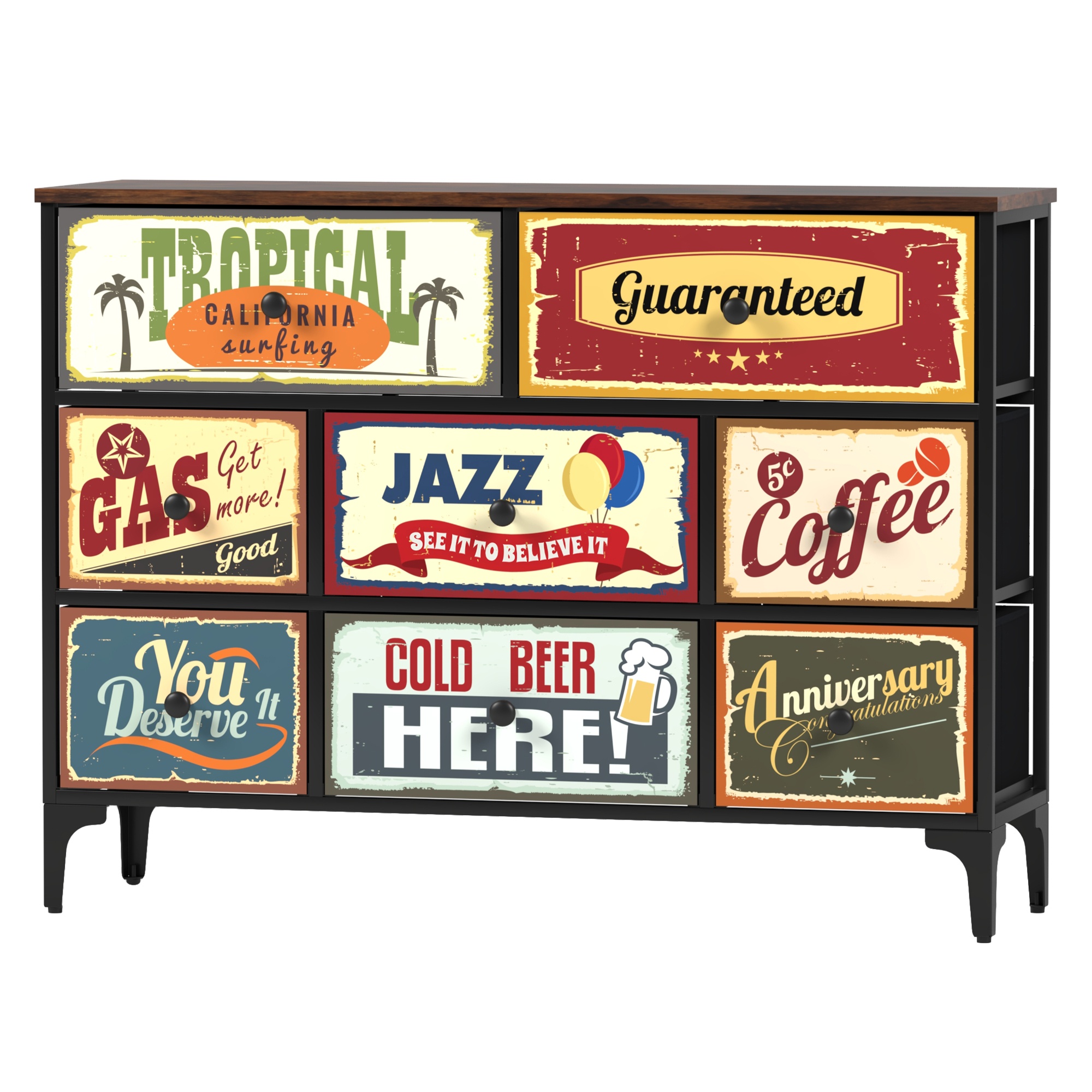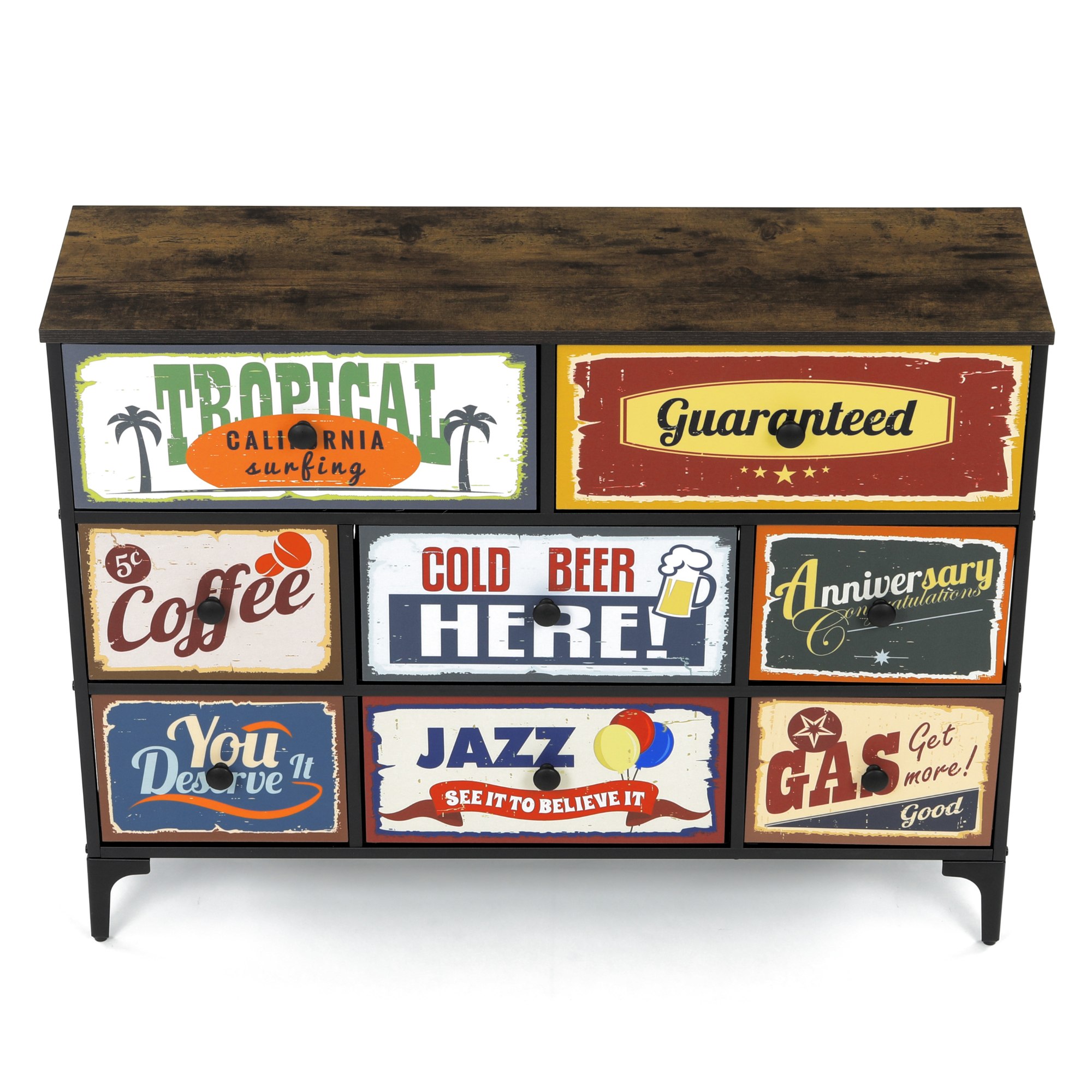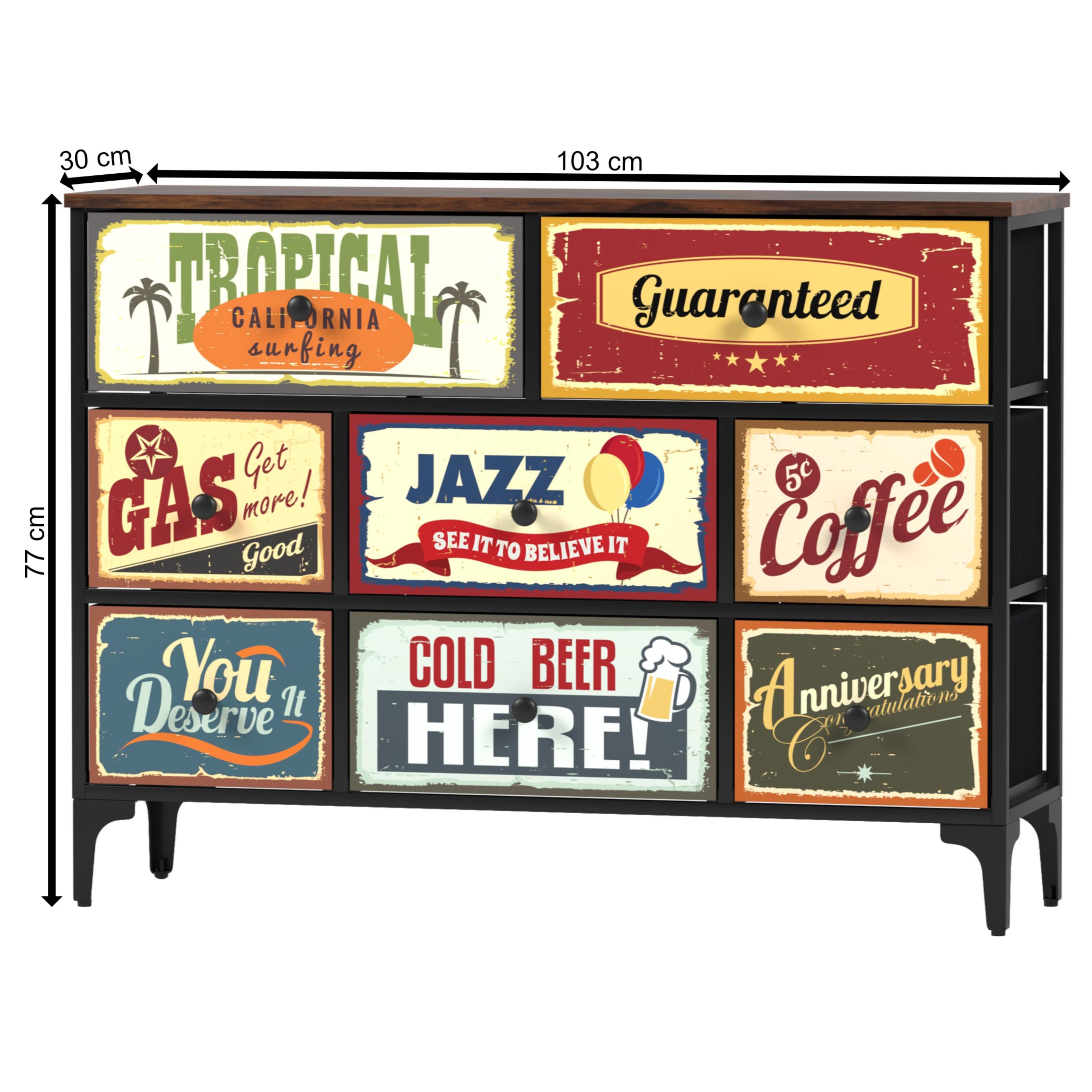 Komoda je vybavená 8 zásuvkami s originálnymi vintage motívmi, ktoré dodajú interiéru jedinečný charakter.
