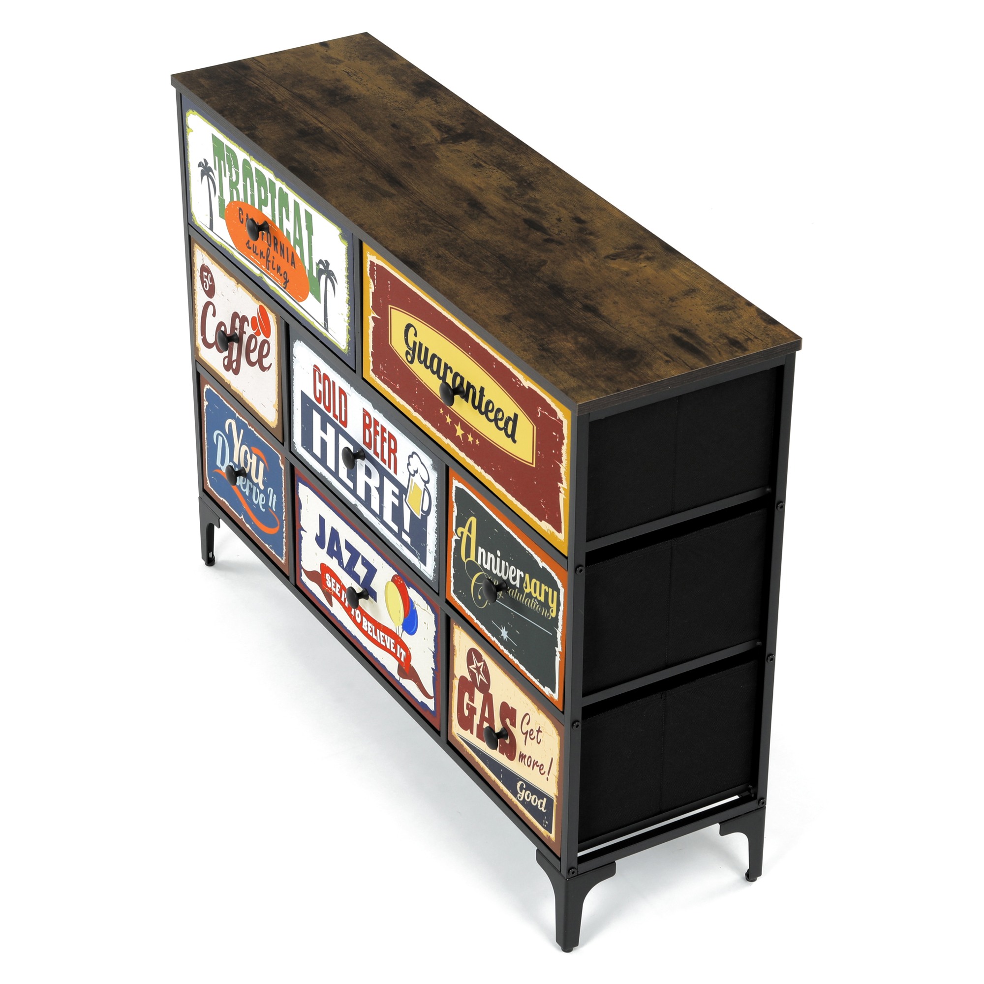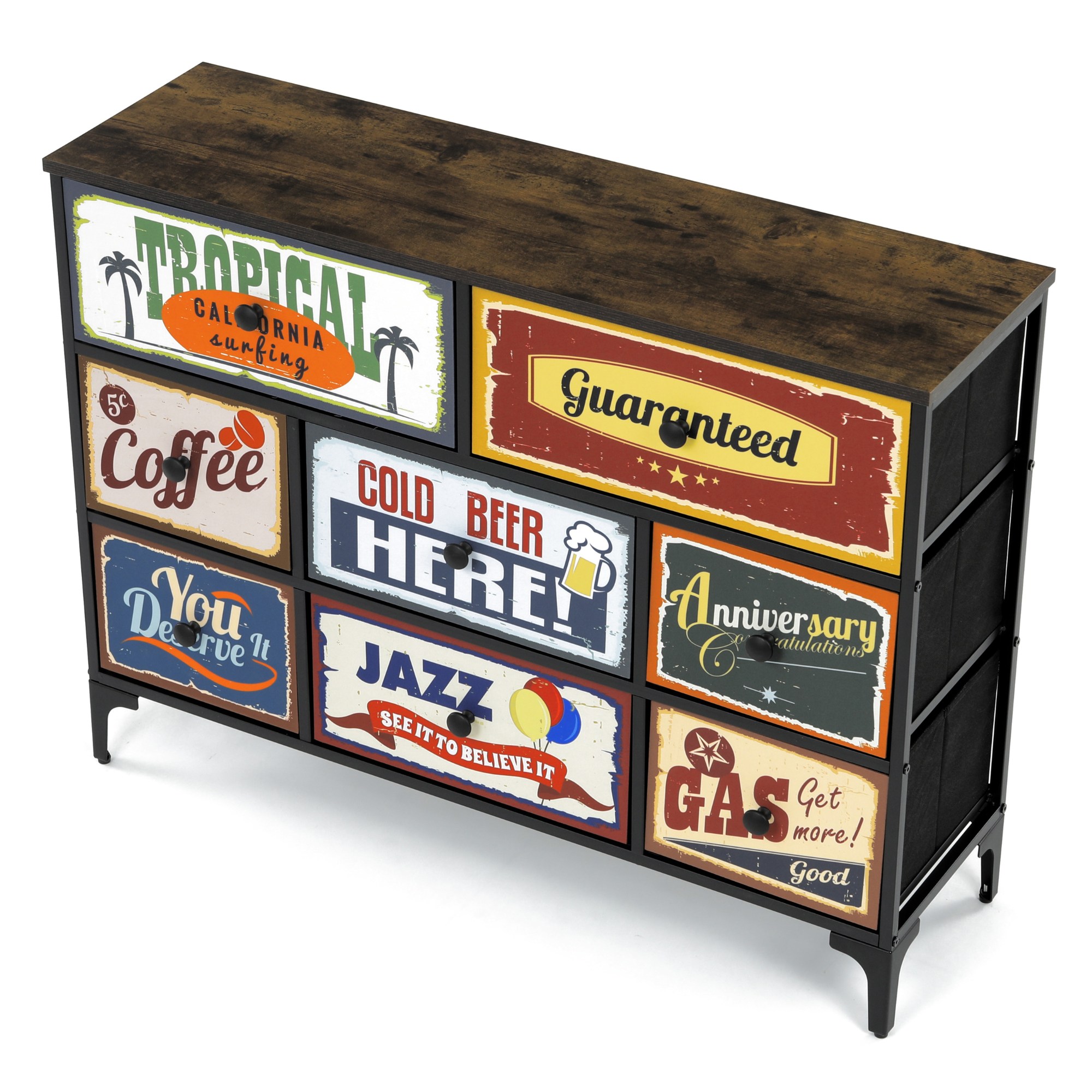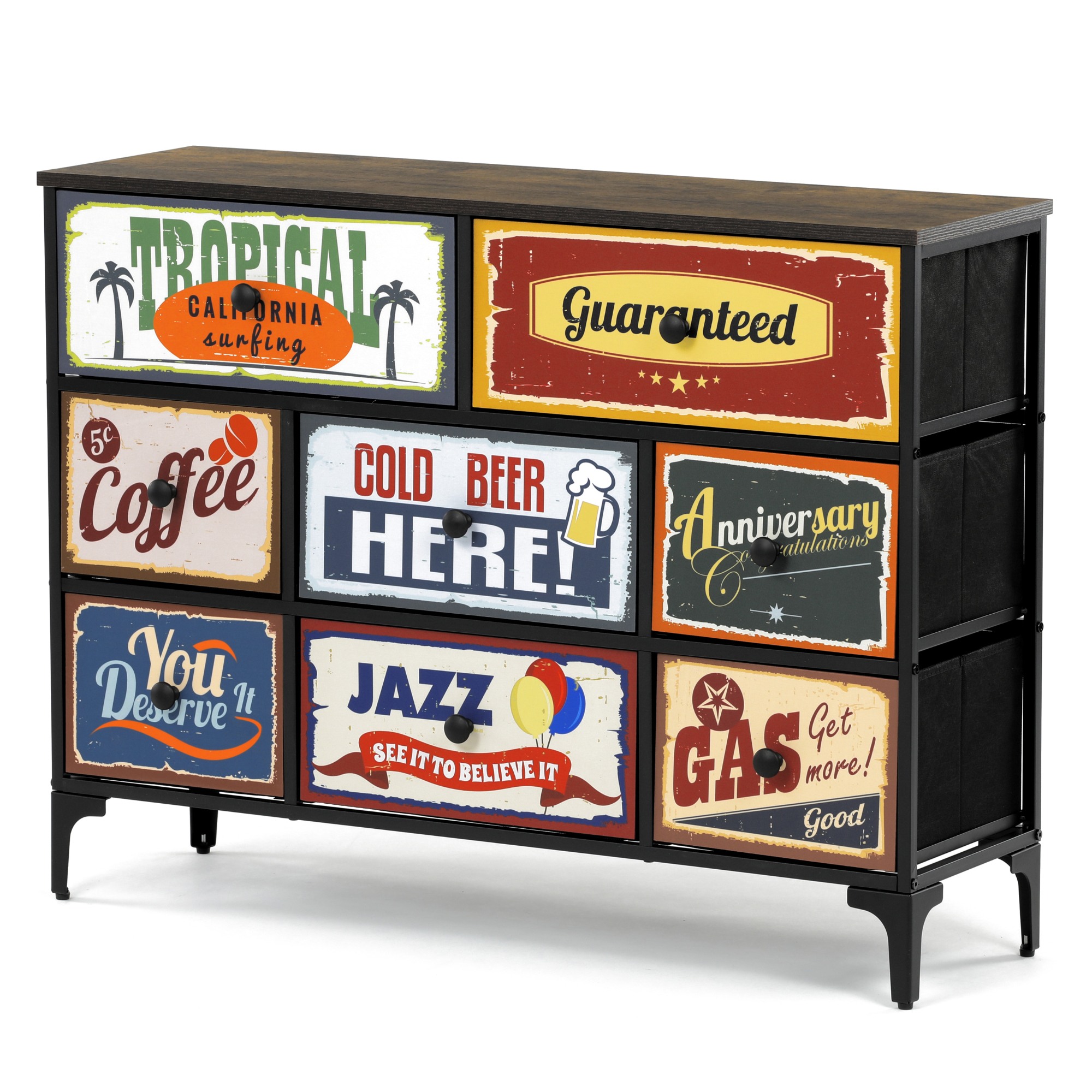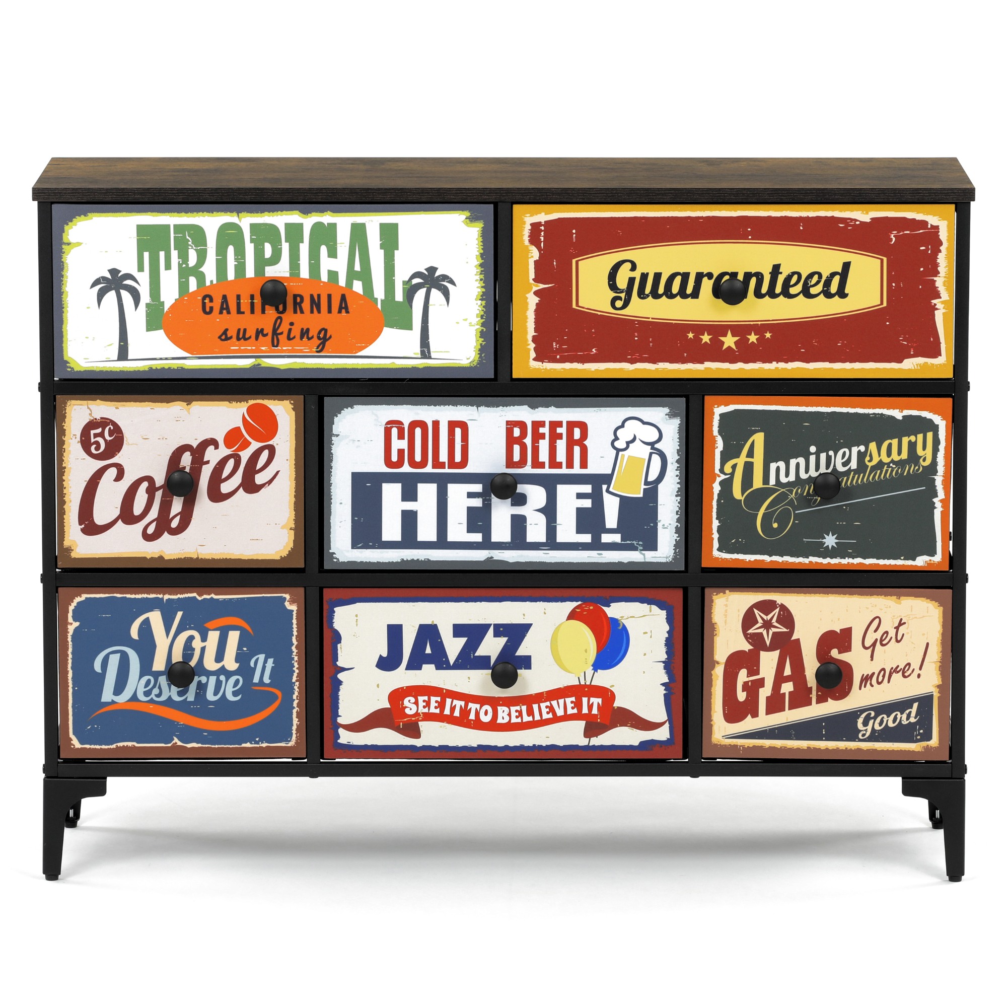 Komoda je vybavená 8 zásuvkami s originálnymi vintage motívmi, ktoré dodajú interiéru jedinečný charakter.