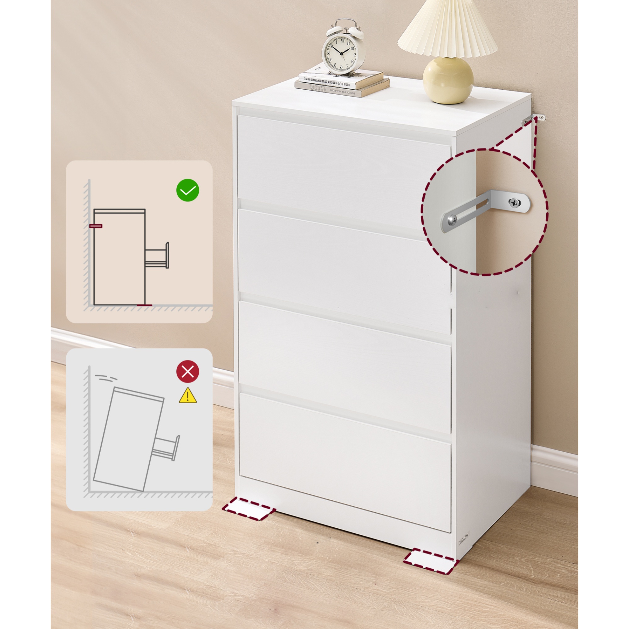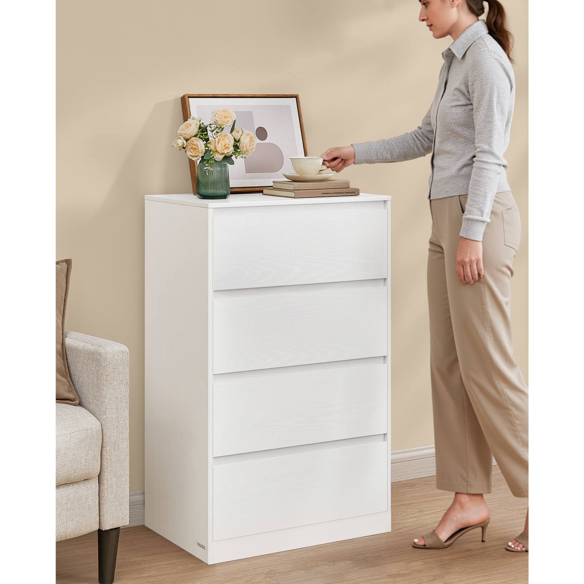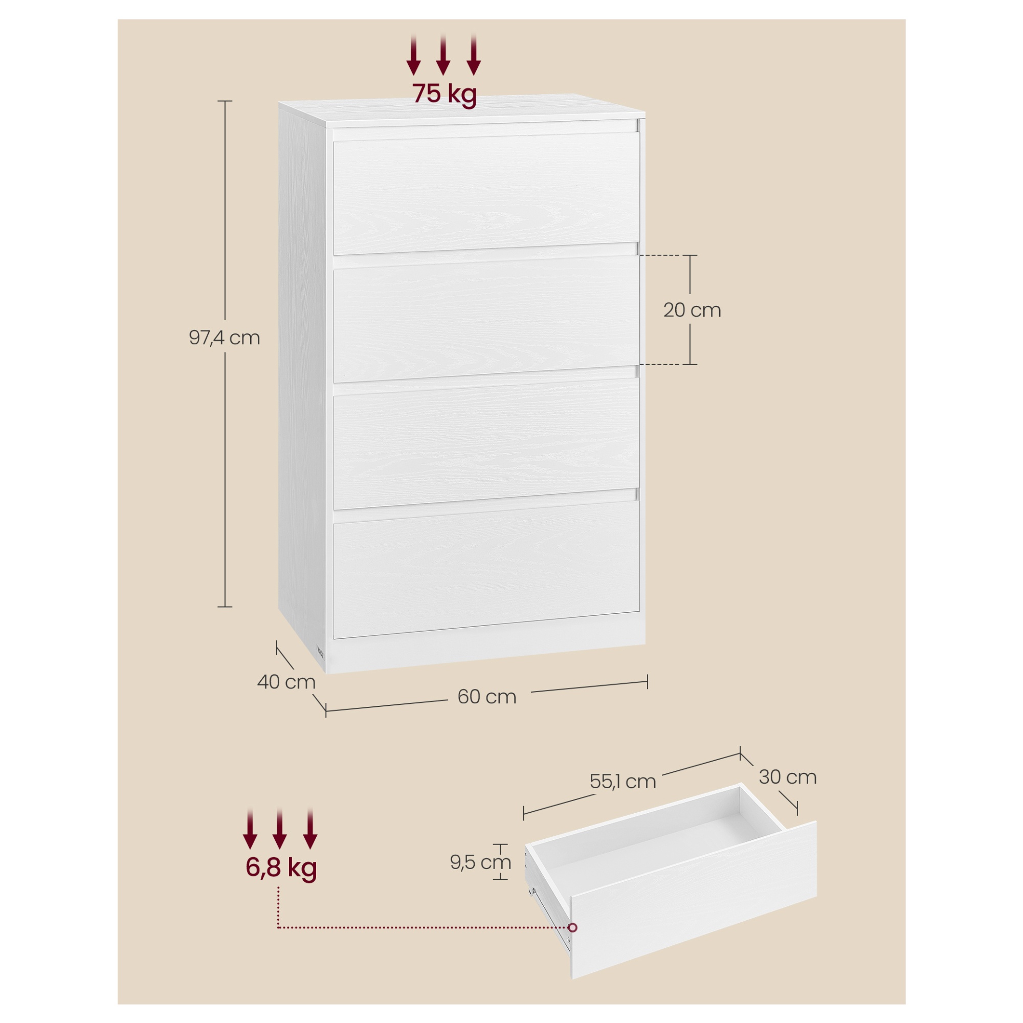 Pokiaľ ide o úložný priestor, ponúka komoda KAILYN 4 zásuvky. Nosnosť jednej zásuvky je 6,8 kg, nosnosť hornej dosky je 75 kg.