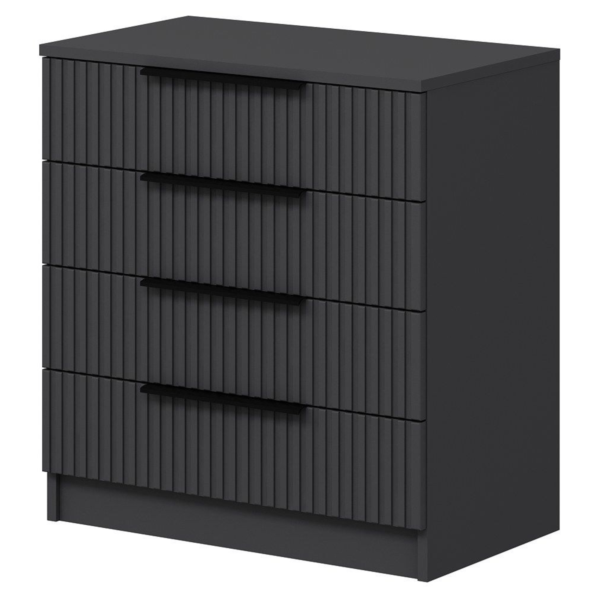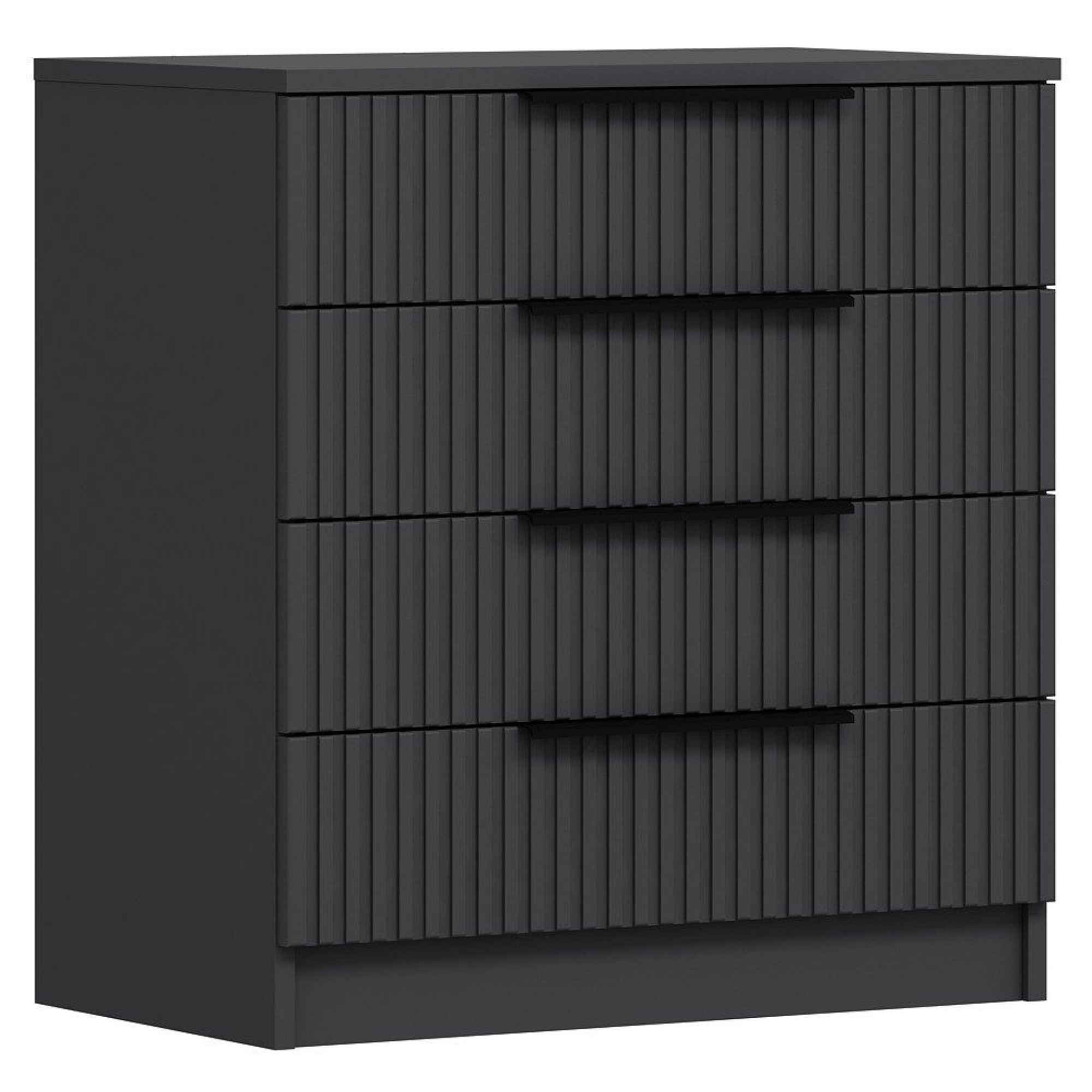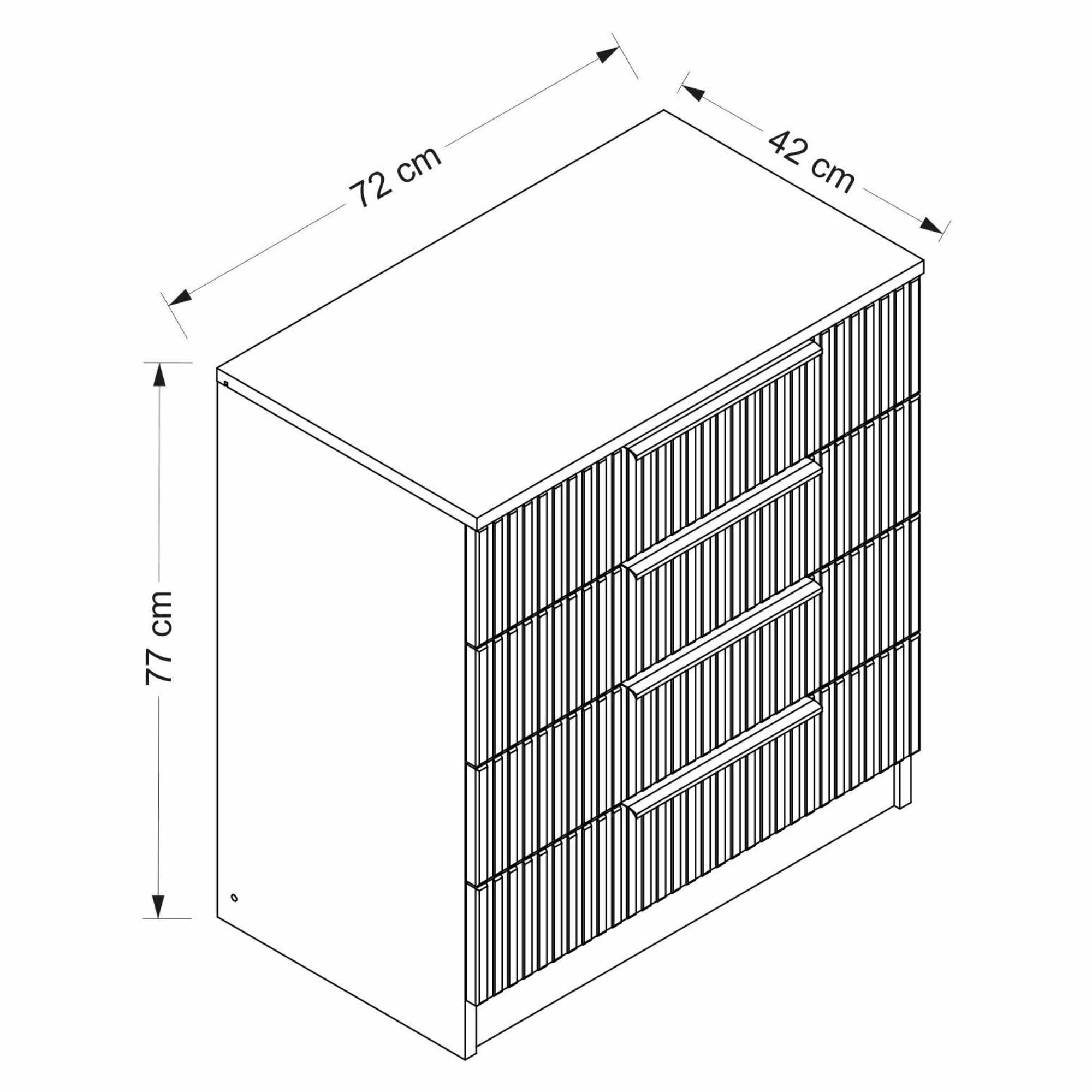 Štýlovú komodu KALE PLUS vďaka jej jednoduchému, modernému vyhotoveniu ľahko zladíte s ďalším vybavením miestnosti. Skvele sa hodí nielen do spálne, ale aj do obývacej izby, pracovne či predsiene. Úložný priestor je prakticky rozdelený na 4 samostatné zásuvky a na ich otváranie slúžia výrazné rúčky v čiernej farbe. Predné plochy zásuviek s dekoratívnou úpravou pridávajú na atraktívnom vzhľade. Konštrukcia je vyrobená z drevotriesky potiahnutej melamínom, ktorá umožňuje ľahkú údržbu.