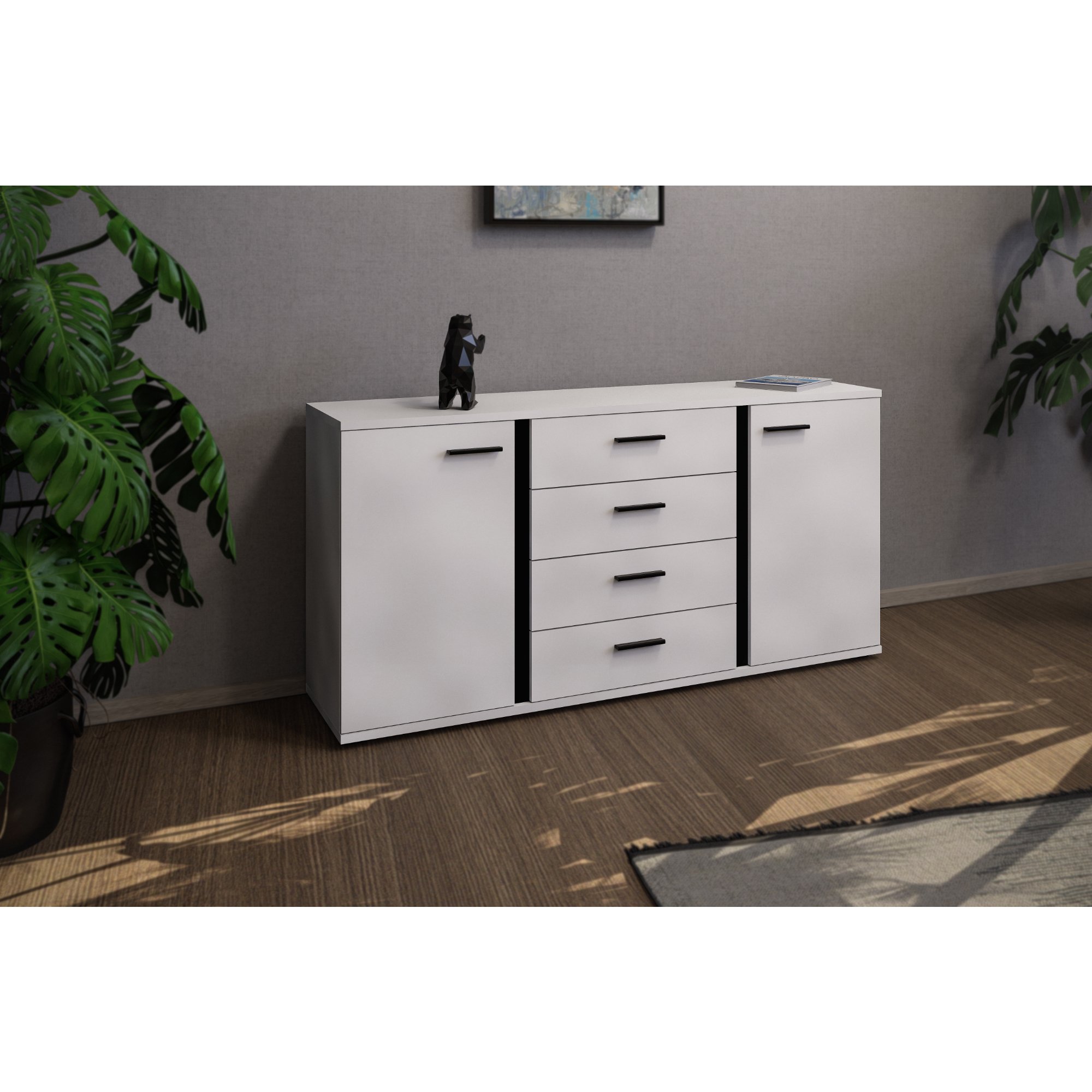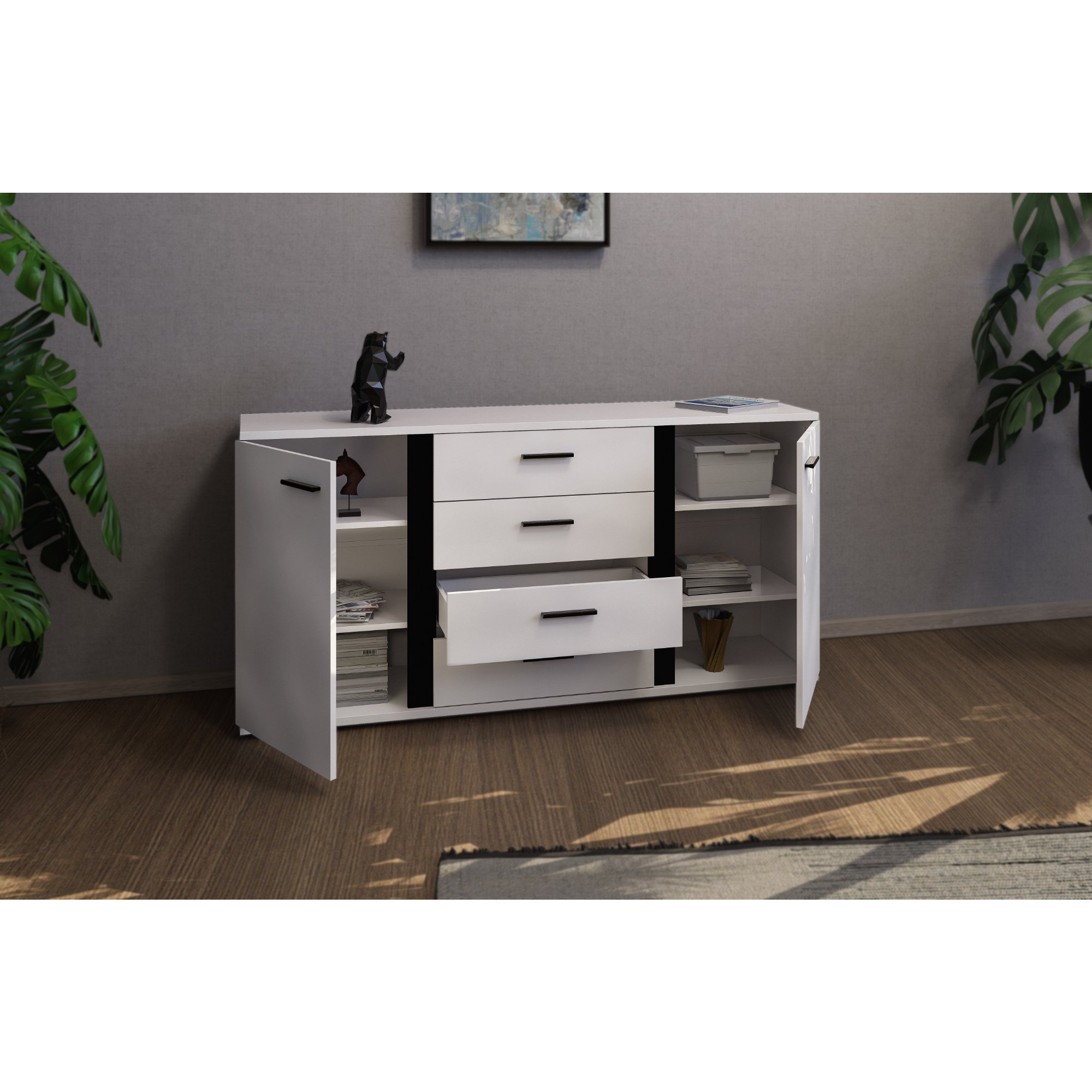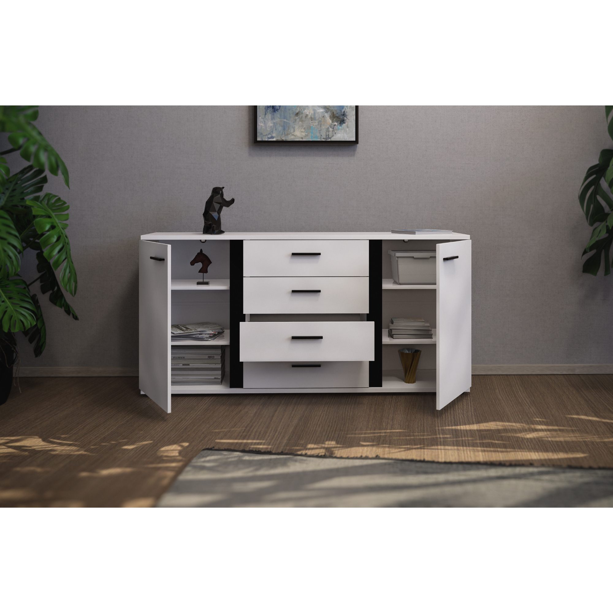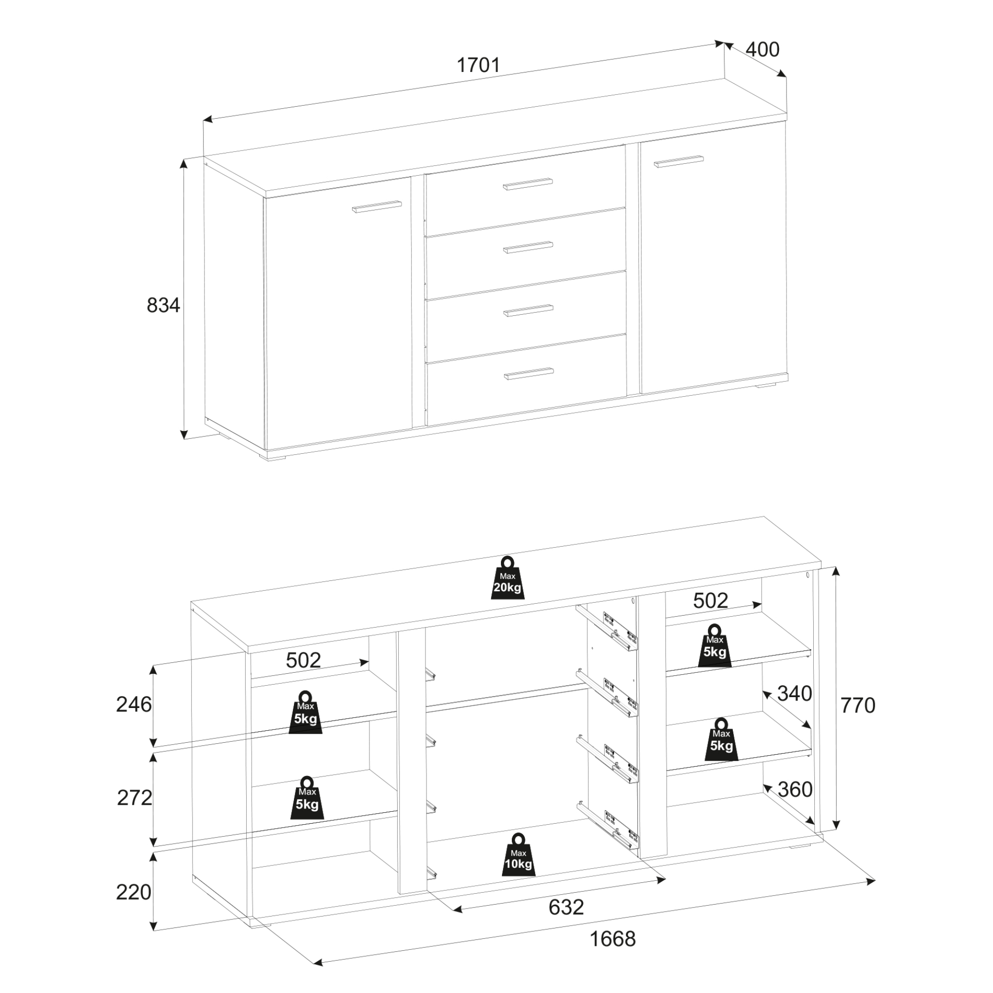 Komoda je vybavená 4 vloženými policami, ktoré sa ukrývajú za dvierkami. Nechýbajú ani 4 zásuvky, do ktorých môžete uložiť všetky dôležité drobnosti. Pre ľahšiu manipuláciu sú dvierka aj zásuvky vybavené plastovými rúčkami.