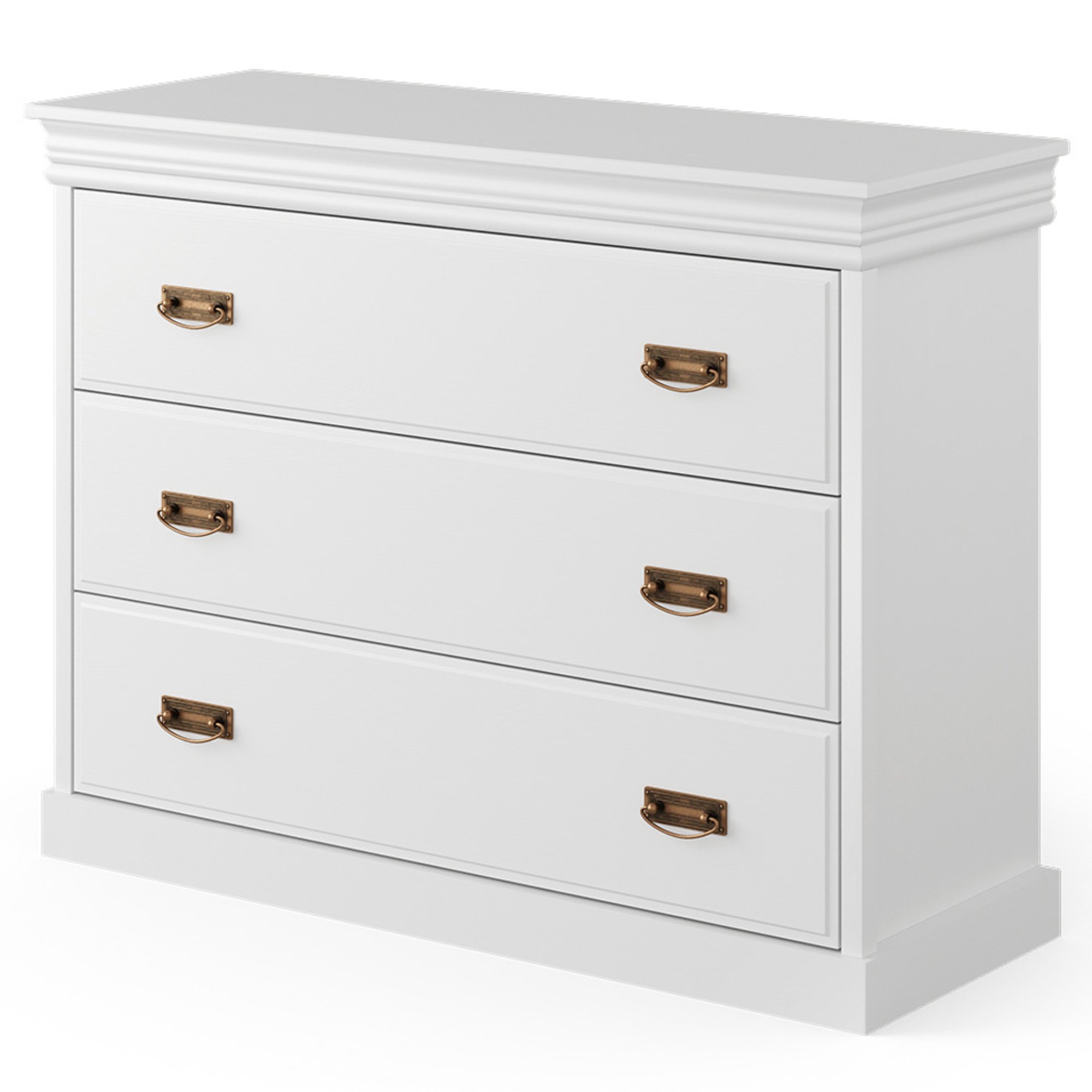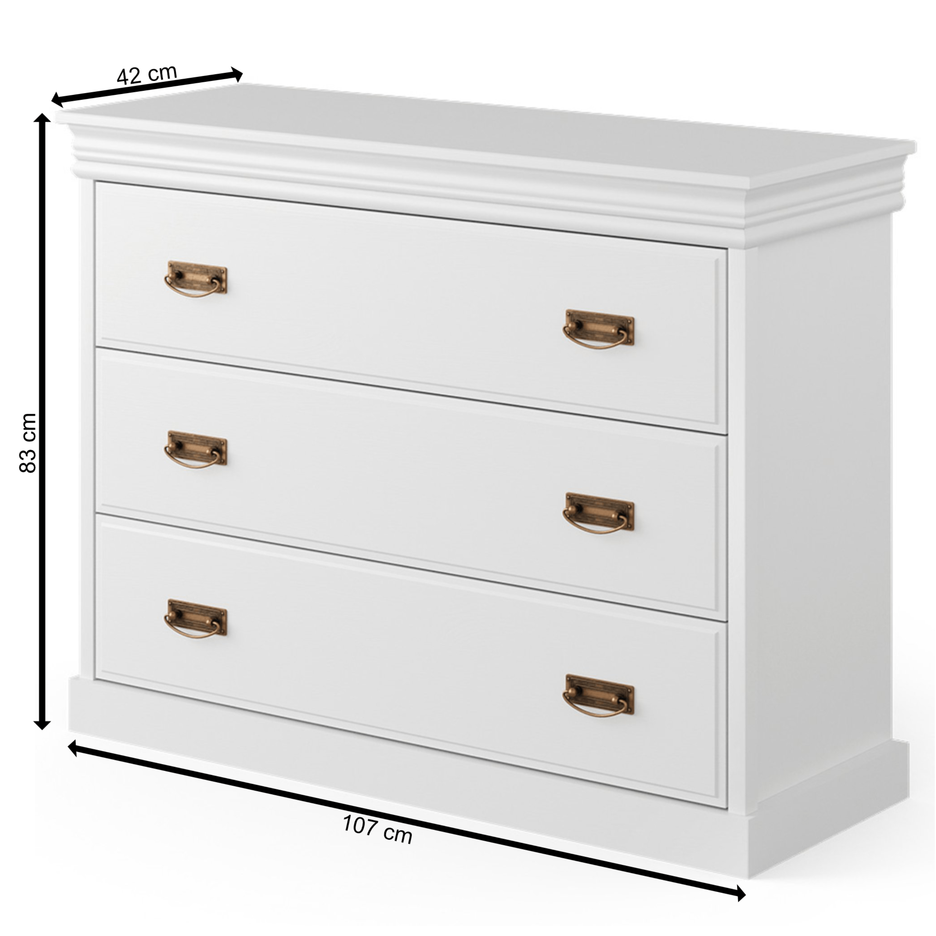 Vyrobená je z masívneho dreva fínskej borovice, ktorá dodáva konštrukcii potrebnú pevnosť, odolnosť a dlhú životnosť. Dekoratívne detaily ako frézovanie predných plôch, ozdobný pilaster a kovová rúčka dotvárajú celkový romantický dojem. Komoda je vybavená tromi zásuvkami kam odložíte všetko potrebné. Vrchná odkladacia doska sa postará o predmety, ktoré chcete mať vždy po ruke.