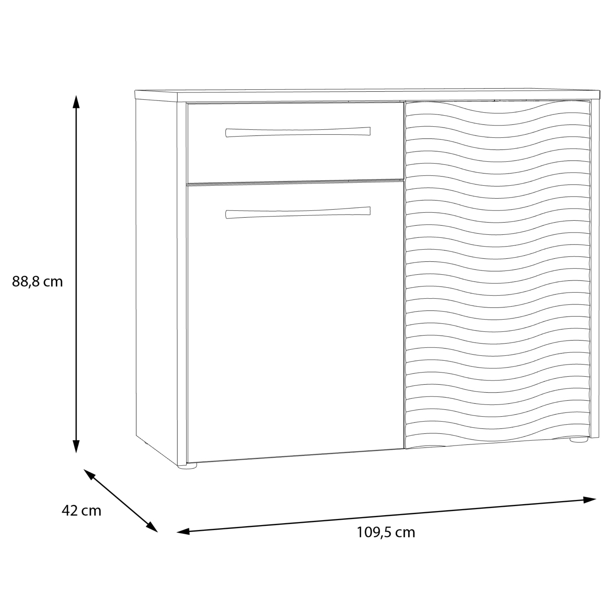 K dispozícii máte uzatvárateľný úložný priestor, ktorý obsahuje zásuvku a dve vložené police schované za dvierkami. Manipuláciu dvierok a zásuviek uľahčujú praktické rúčky. Povrch komody sa vyznačuje jednoduchou údržbou.