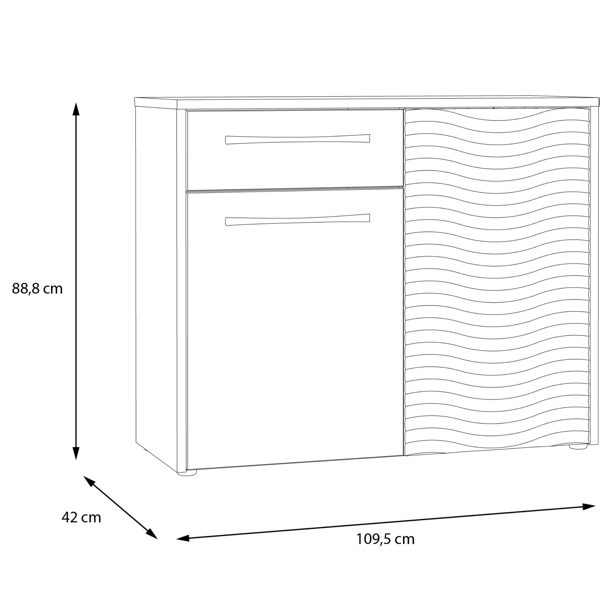 K dispozícii máte uzatvárateľný úložný priestor, ktorý obsahuje zásuvku a dve vložené police schované za dvierkami. Manipuláciu dvierok a zásuviek uľahčujú praktické rúčky. Povrch komody sa vyznačuje jednoduchou údržbou.