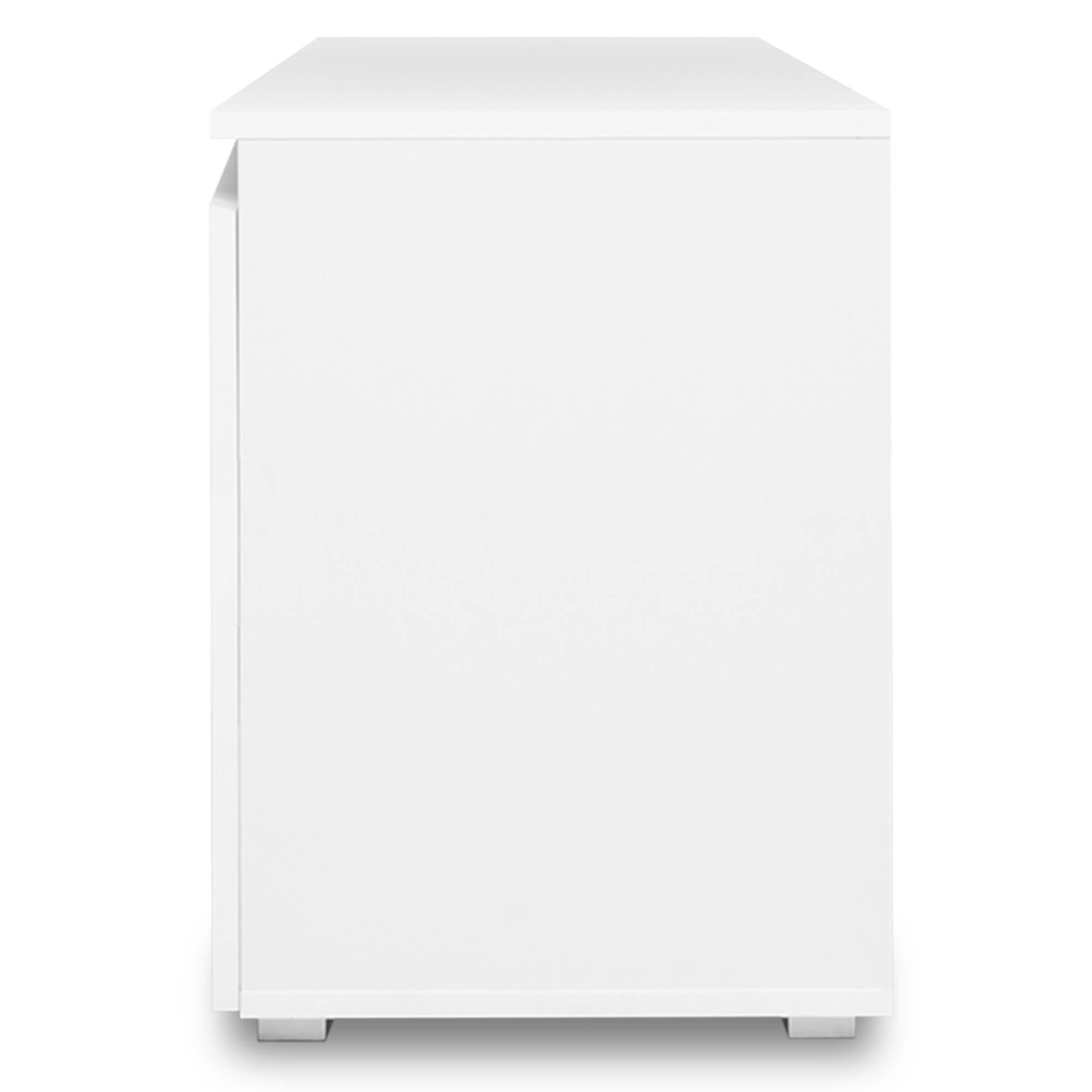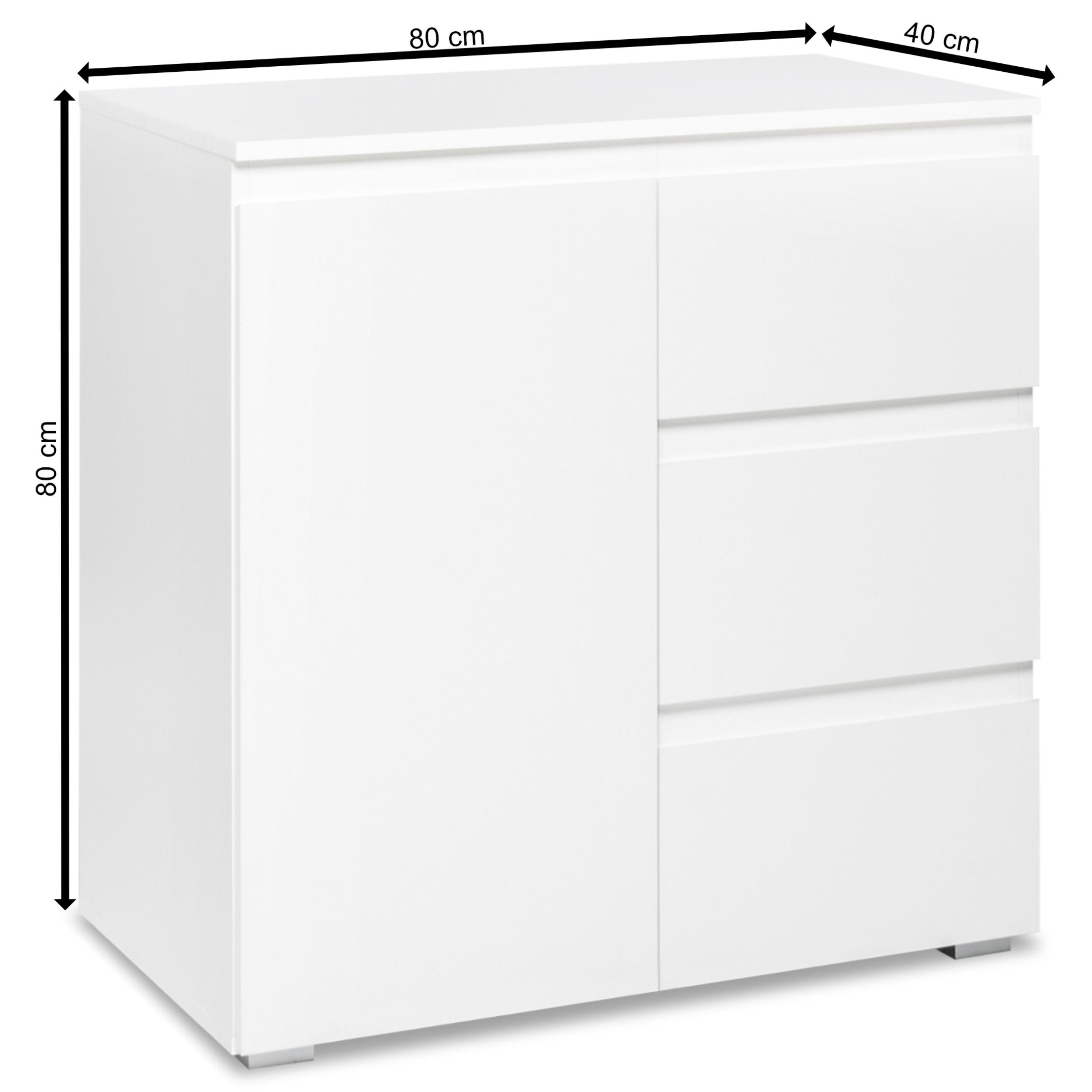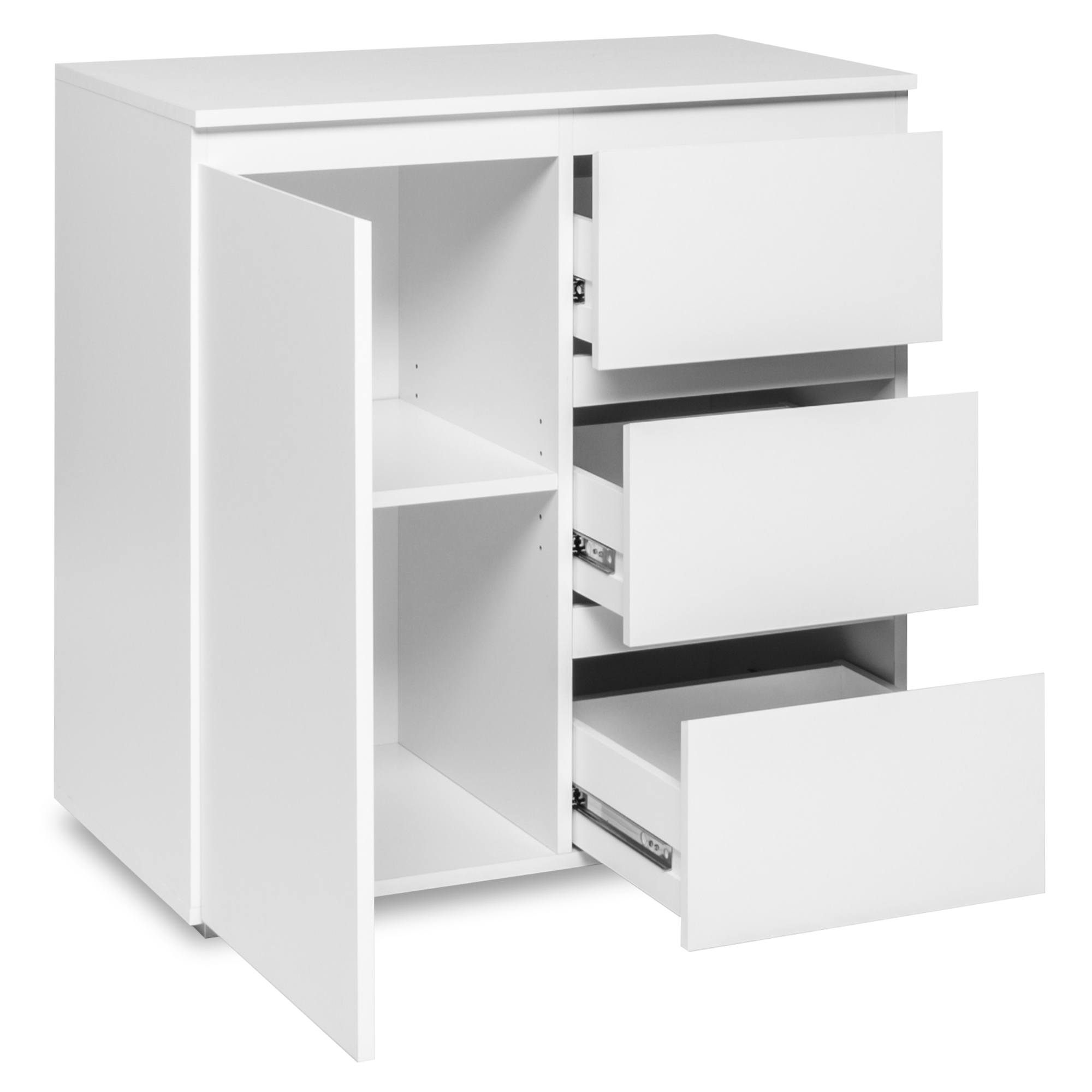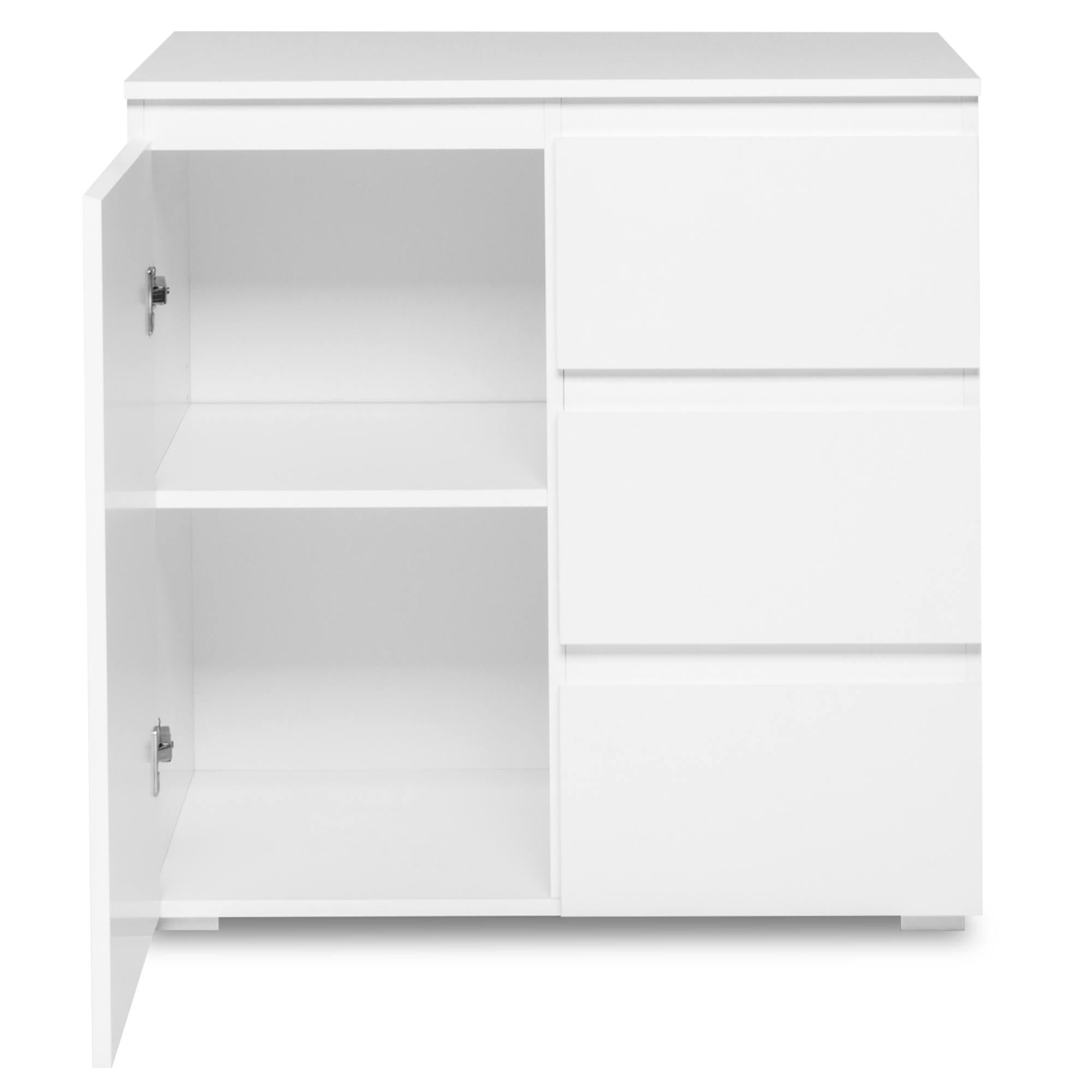 Komoda je vybavená otočnými dverami na ľavej strane, za ktorými sa nachádza 1 vložená polica prakticky rozdeľujúca vnútorný priestor. Na prehľadné skladovanie môžete využiť ešte 3 priestranné zásuvky s kovovými pojazdmi. Na odloženie predmetov dennej potreby či vystavenie dekorácií slúži vrchná, odkladacia doska. Všetky predné plochy sú vyhotovené s funkčným, bezrúčkovým otváraním. Komoda je vyrobená z ľahko udržiavateľnej laminovanej drevotriesky s ABS hranami, ktoré zvyšujú odolnosť materiálu. Celú konštrukciu podopierajú drobné plastové nôžky kovového vzhľadu.