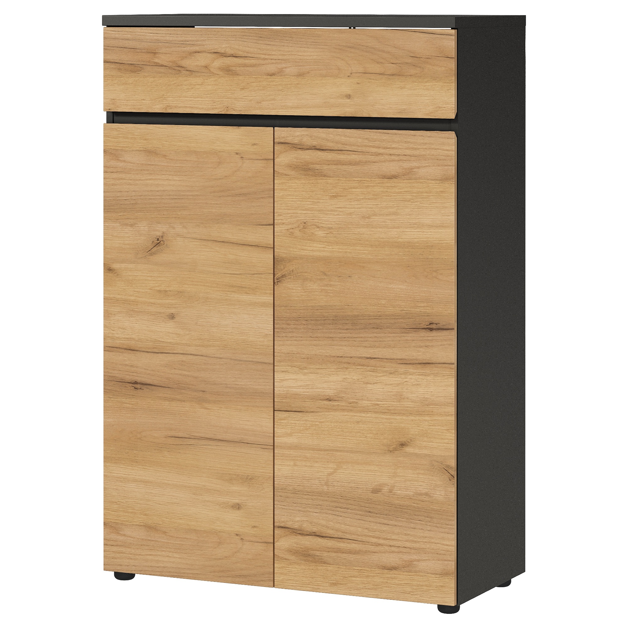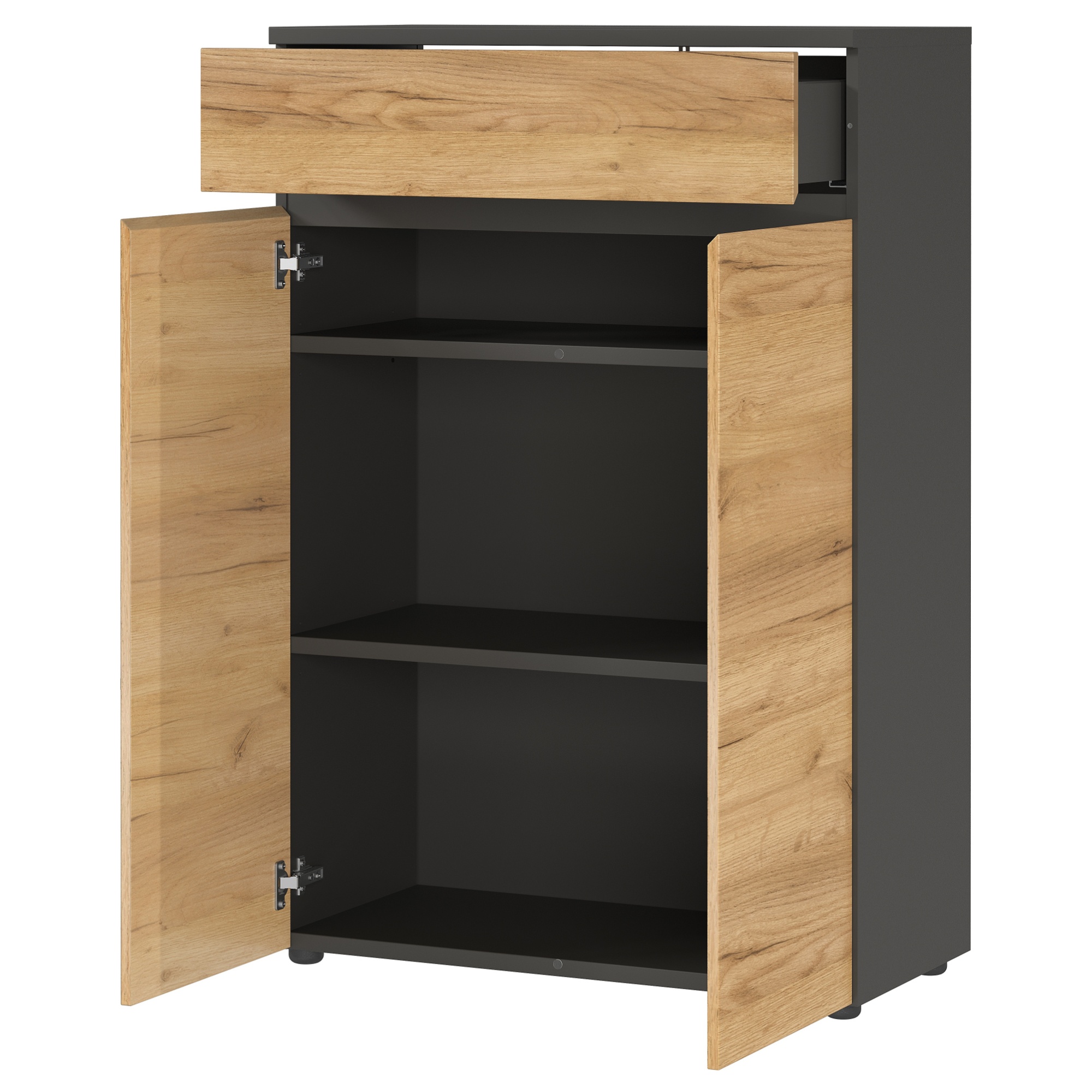 Disponuje 1 zásuvkou a 2 policami s hĺbkou 40 cm, ktoré sa ukrývajú za 2 otočnými dvierkami. Jej bezrúčkové prevedenie dotvára moderný dizajn. Je vyrobená z laminovanej drevotrieskovej dosky, ktorá sa vyznačuje jednoduchou údržbou. Korpus je v grafitovej farbe, ktorú kontrastne dopĺňajú dvierka v dekore duba navarra. Dekor so svojou imitáciou dreva dodáva priestoru nádych prírody v štýlovom prevedení. Komoda je vybavená praktickými nízkymi nožičkami.