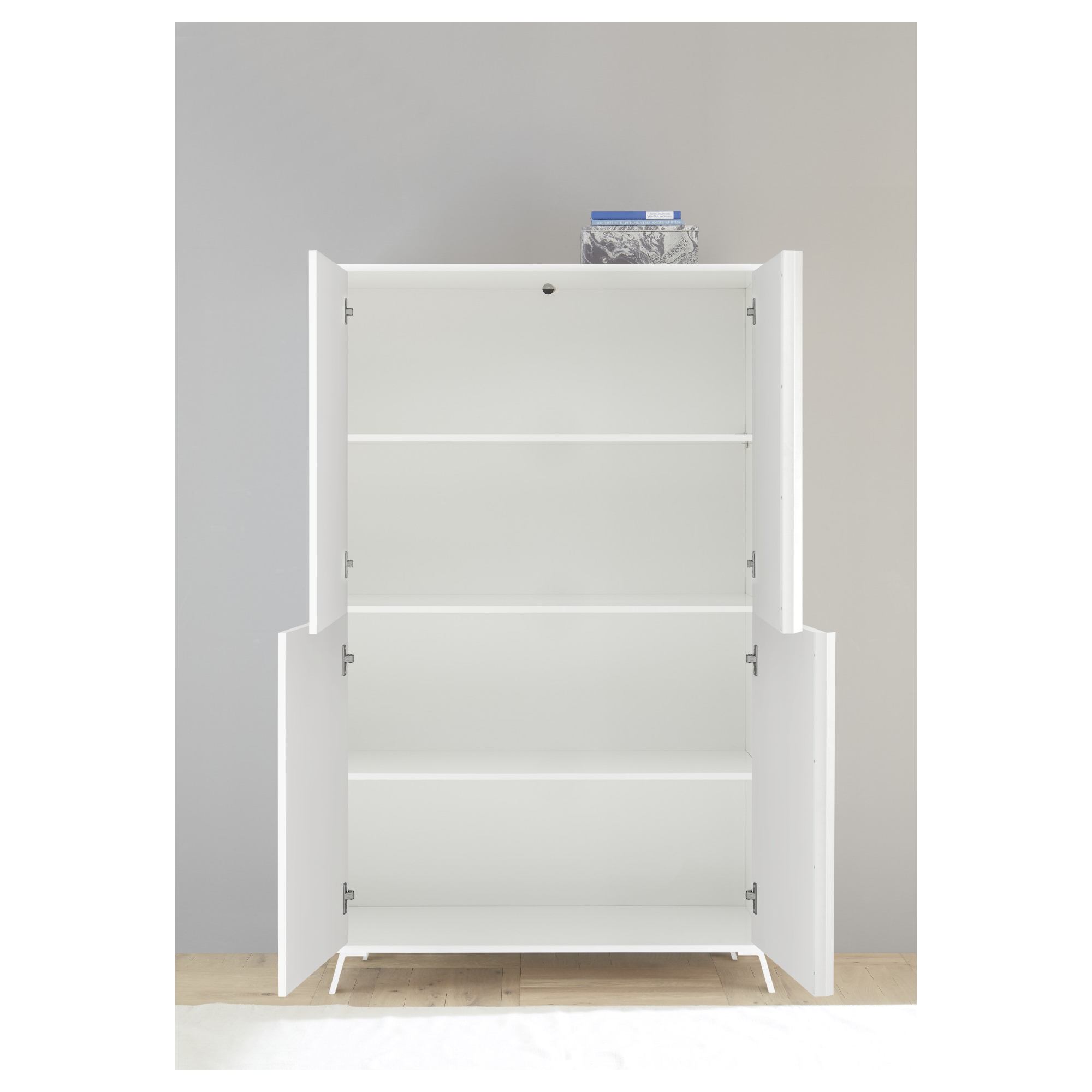 Komoda je uzatvárateľná pomocou 2 párov otočných dverí, s ktorými sa vám bude dobre manipulovať vďaka bezrúčkovému otváraniu. Vnútorné vybavenie pozostáva celkom z 2 priestranných vložených políc. Vďaka multifunkčnému využitiu, môžete komodu využiť takmer v akejkoľvek miestnosti a obohatiť ju o uzatvárateľný úložný priestor. Komoda je vyrobená z kvalitnej laminovanej drevotriesky nenáročnej na údržbu