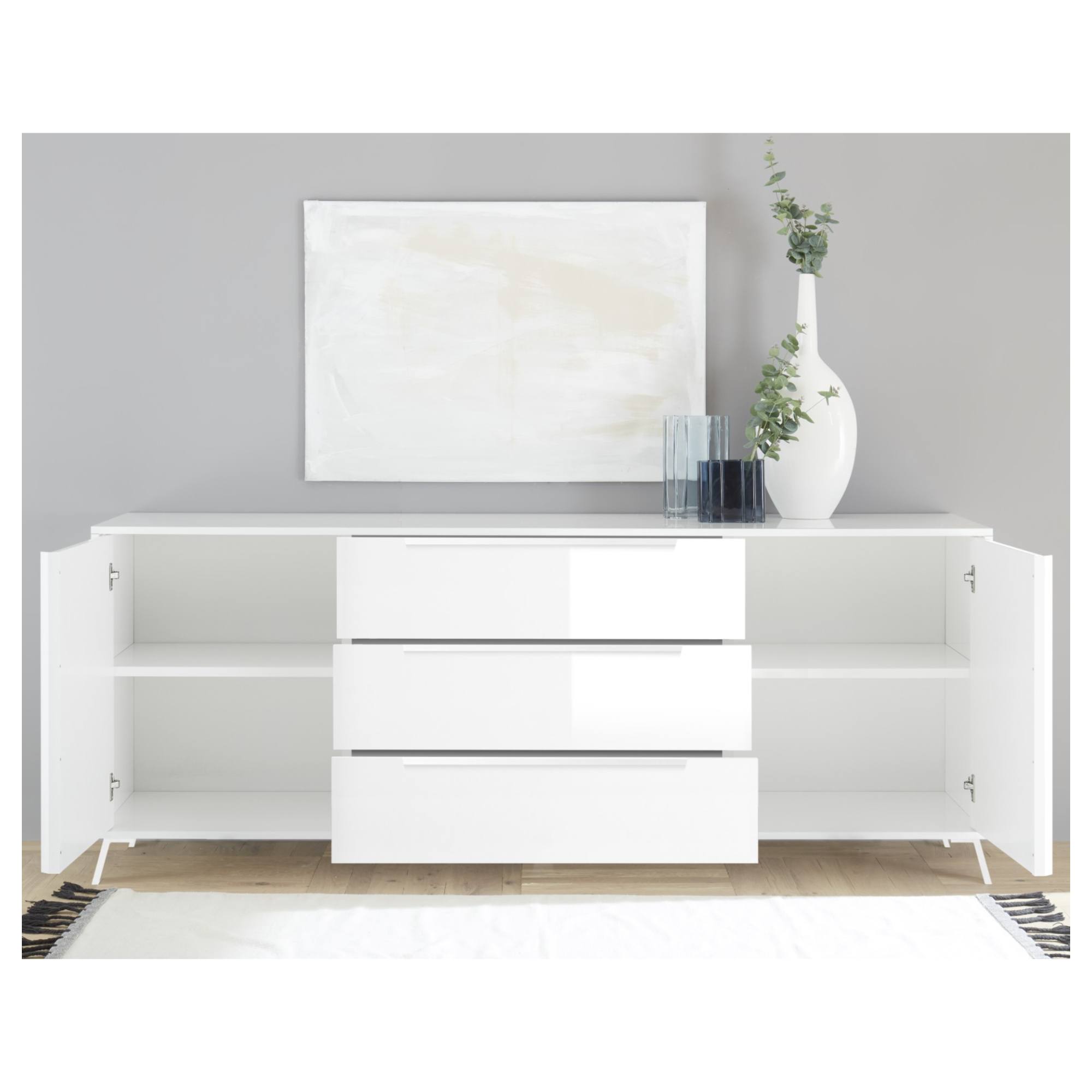 Vnútorné vybavenie je ukryté za 2 otočnými dverami, kedy priestor za každými z nich rozdeľuje 1 vložená polica a vytvára tak prakticky delený priestor. Ďalej komoda obsahuje 3 priestranné zásuvky, ktoré sa postarajú o dokonalý prehľad počas skladovania. Jednoduchú manipuláciu zaisťuje bezrúčkové otváranie všetkých dverí. Celkový vzhľad zvýrazňujú úzke kónické nôžky. Vyrobená je z ľahko udržiavateľnej drevotriesky.