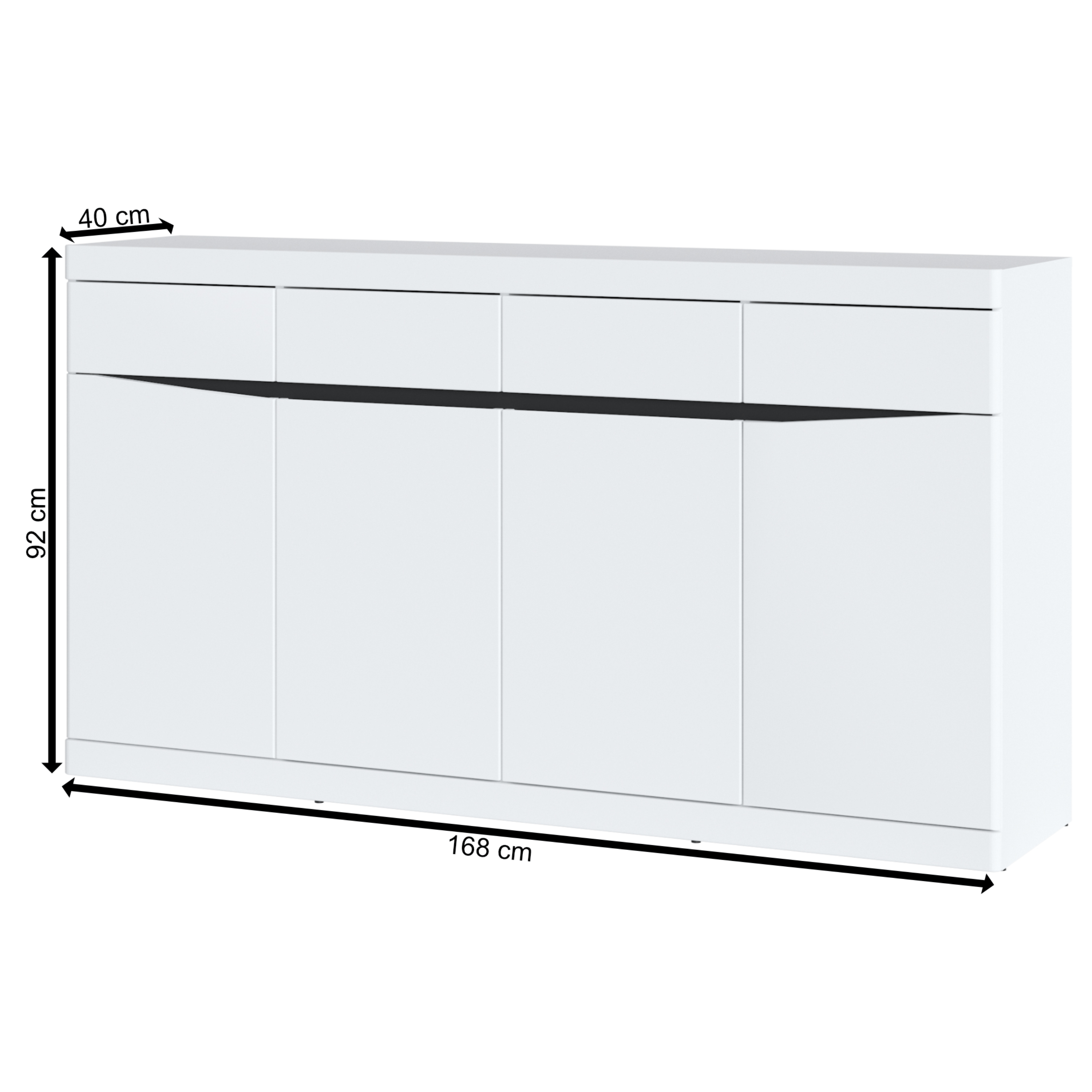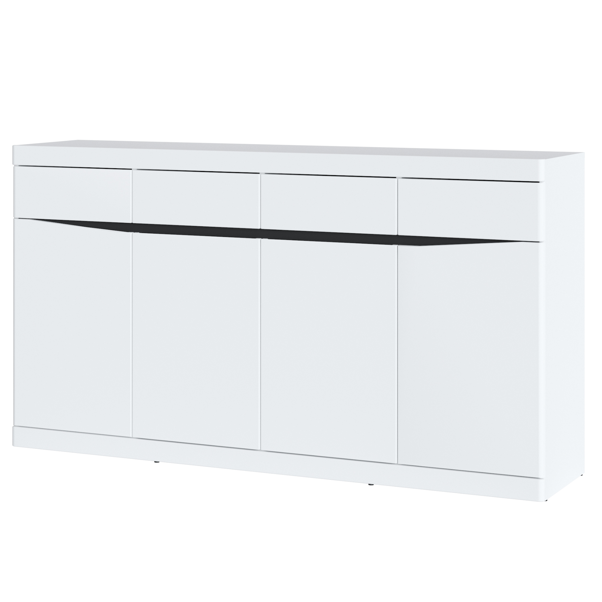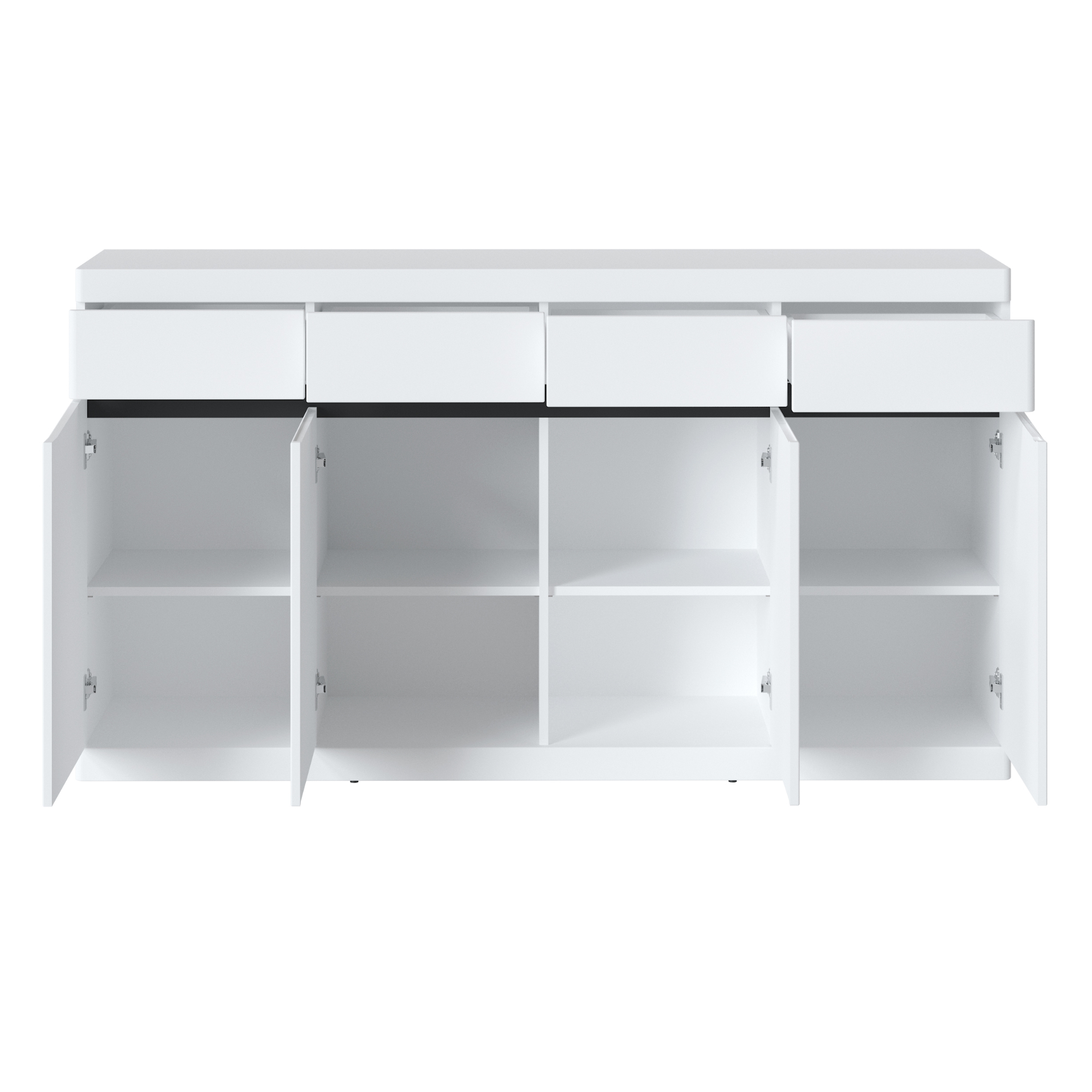Komoda má štyri otočné dvierka, za ktorými sa nachádza jedna vložená polica a štyri praktické zásuvky v hornej časti, čo ponúka rozsiahly úložný priestor na organizáciu rôznych predmetov, ako sú dokumenty, oblečenie alebo domáce potreby. Korpus je vyrobený z kvalitnej laminovanej drevotrieskovej dosky, zatiaľ čo predné plochy sú z drevovláknitej dosky MDF.