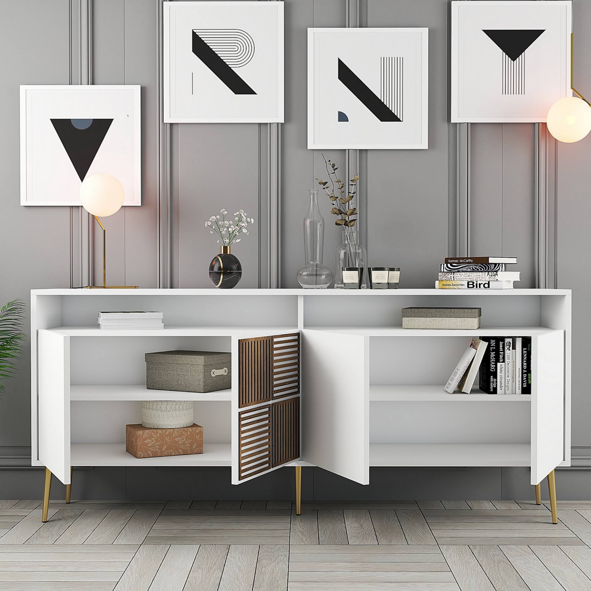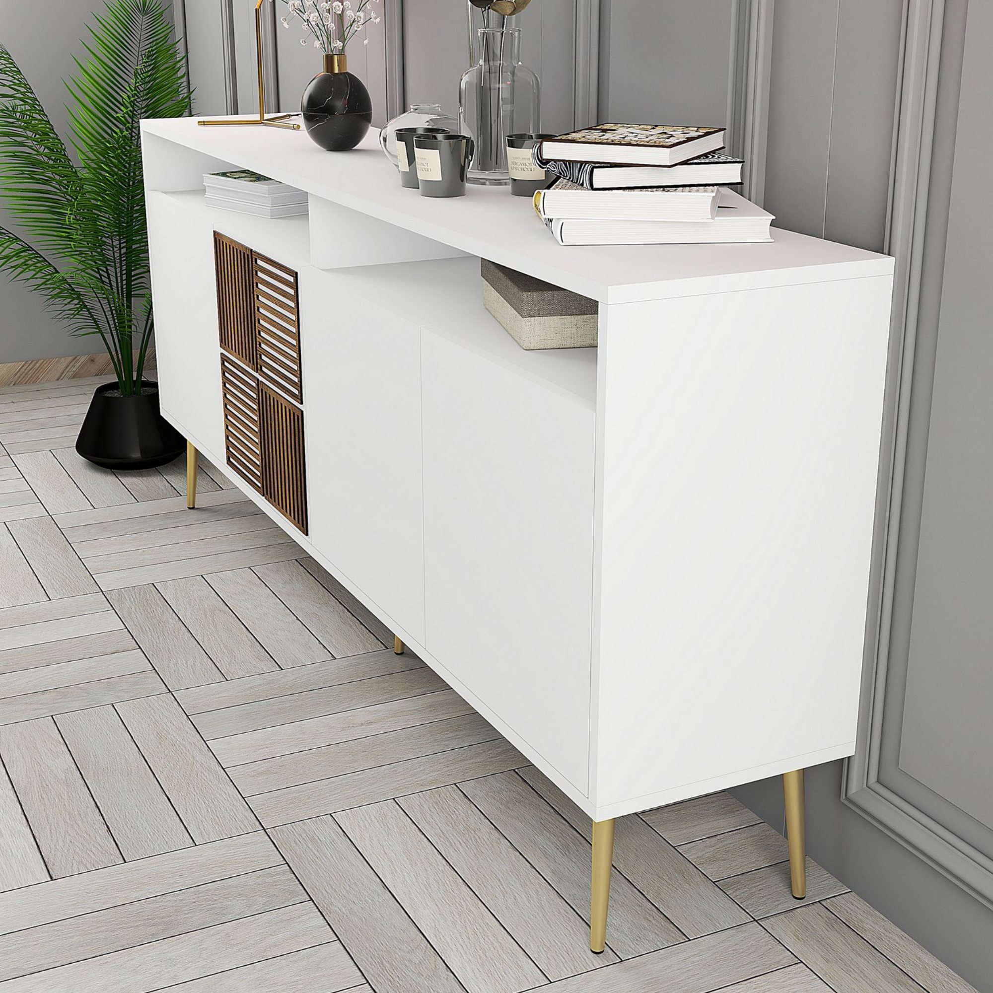 Za dvierkami sa ukrývajú 2 vložené police, ktoré prakticky rozdeľujú vnútorný úložný priestor. Nad dvierkami sa nachádza otvorený odkladací priestor. Horná doska je ideálna na umiestnenie rastlín, fotografií a ďalších dekorácií alebo predmetov ktoré potrebujete mať po ruke.