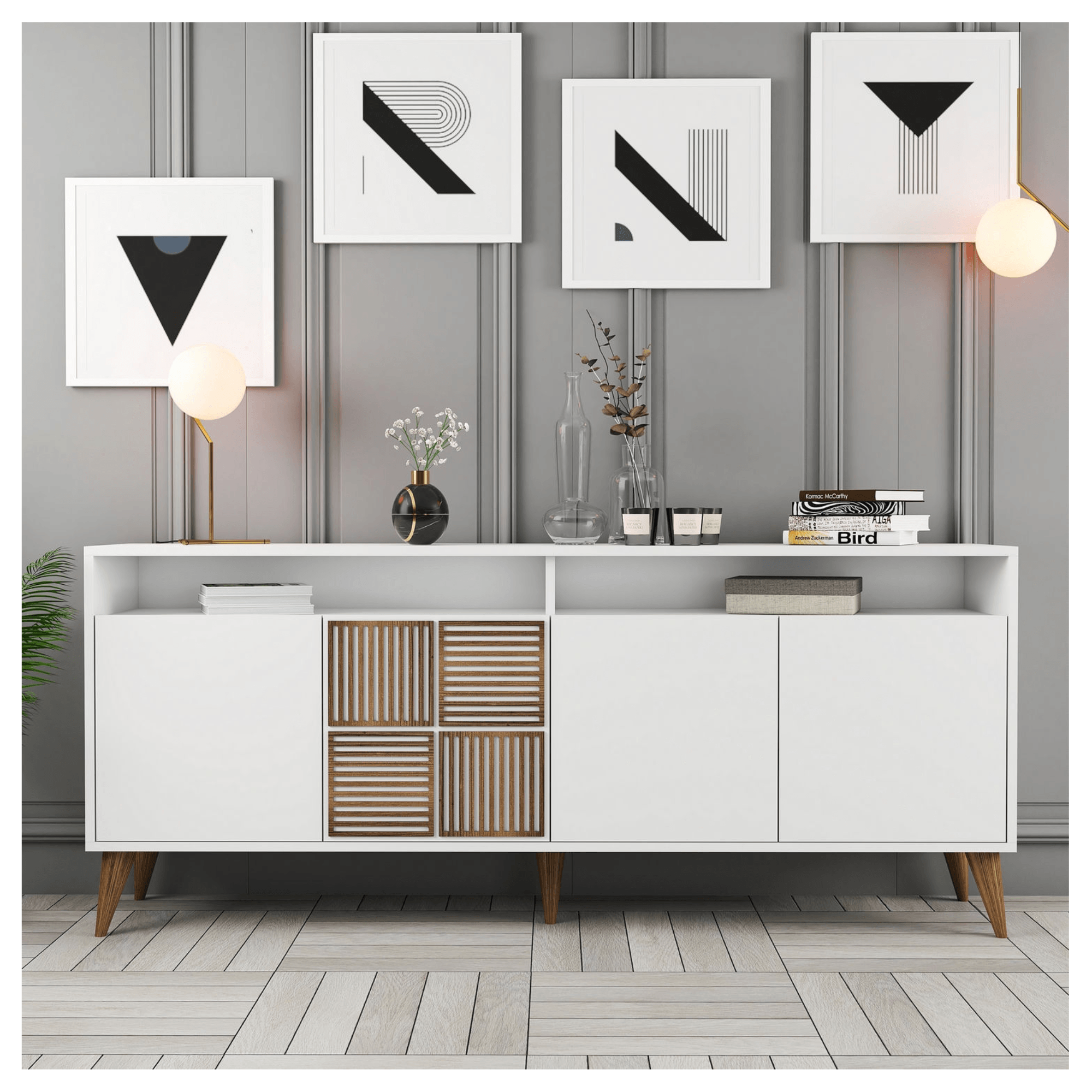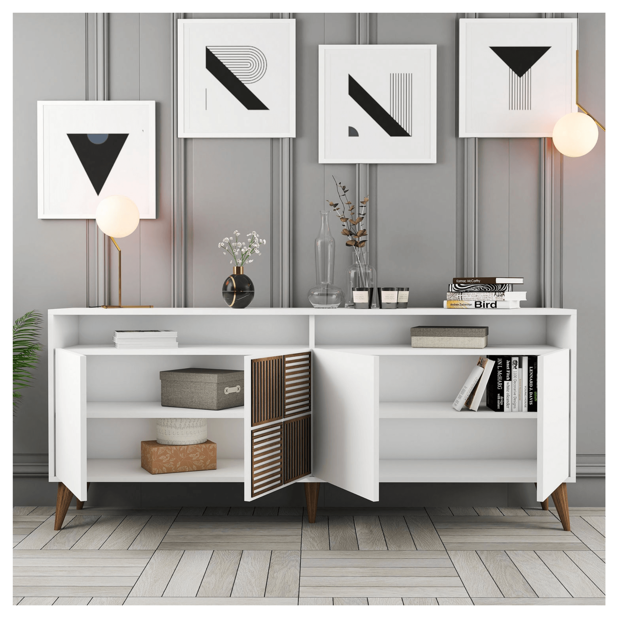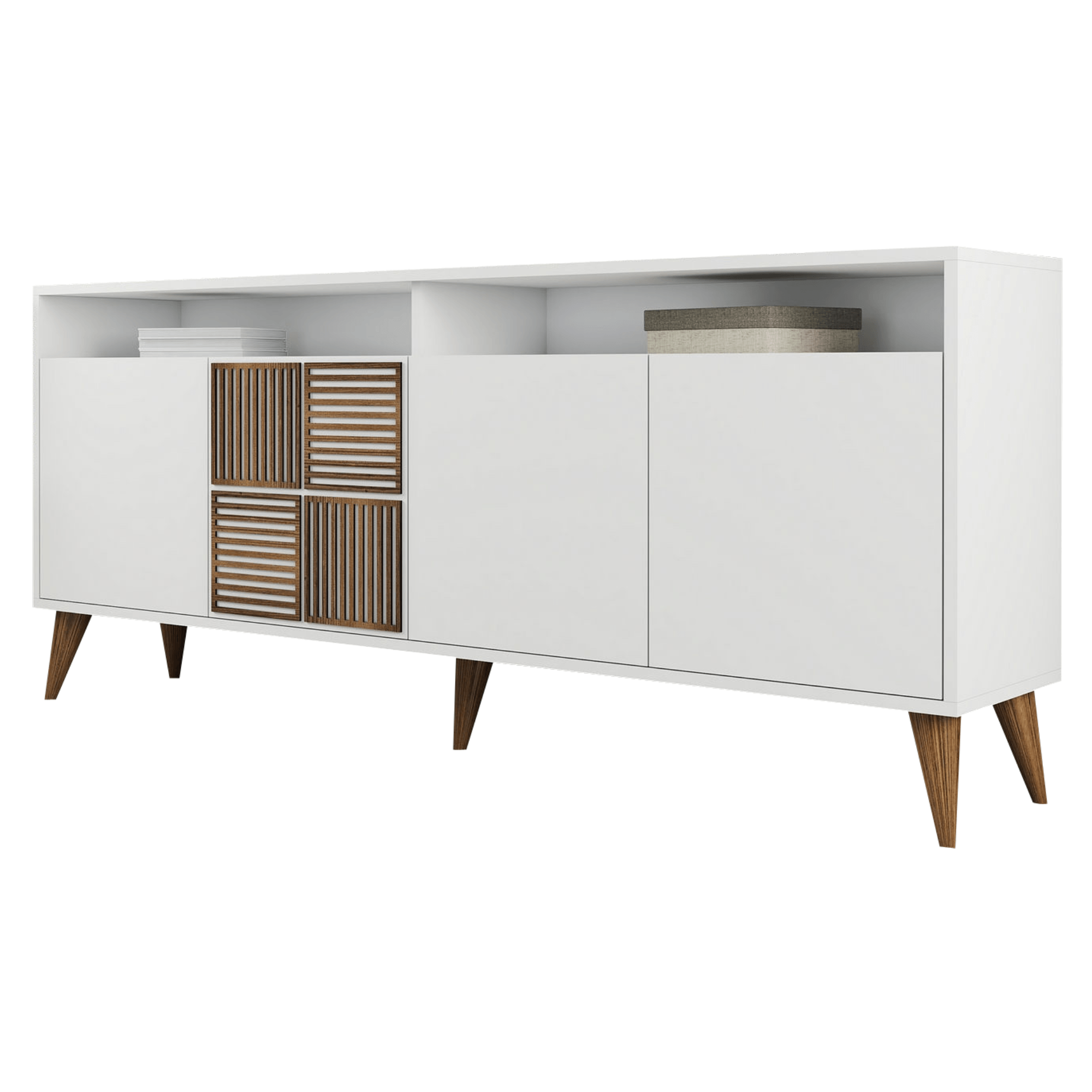 Komodu uzatvárajú 2 páry otočných dverí. kedy každý z nich ukrýva vloženú policu. Tieto police prakticky rozdeľujú vnútorný, úložný priestor a umožňujú uloženie všetkého, čo nechcete mať na očiach. Nad každým párom dverí sa nachádza 1 otvorený odkladací priestor. Vrchná doska je ideálna na vystavenie rastlín, fotografií a ďalších dekorácií alebo odkladanie predmetov dennej potreby. Komodu je možné využiť aj ako TV komodu, ktorá sa bez problémov postará o všetko TV príslušenstvo. Pätica výrazných kónických nôh zvýrazňuje jej celkový vzhľad a zároveň umožňuje ľahké upratovanie pod komodou. Vyrobená je z dreveného materiálu potiahnutého melamínom.