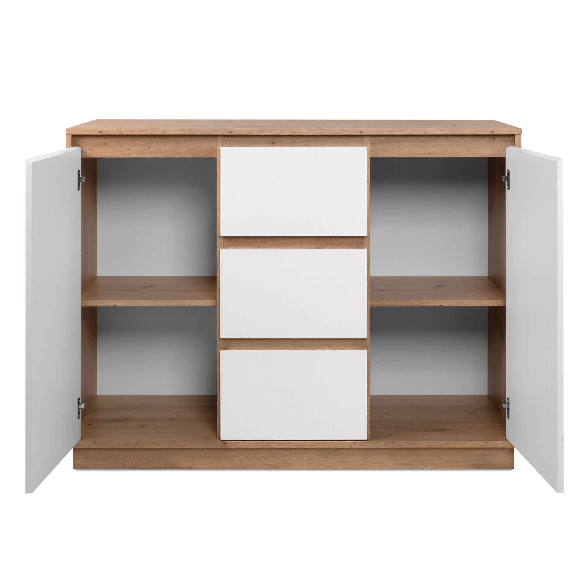 Komoda je uzatvárateľná pomocou troch zásuviek a dvoch otočných dverí s minimalistickým bezrúčkovým otváraním. Za nimi sa skrýva prepojený priestor s vloženou policou. Na odloženie predmetov dennej potreby či vystavenie dekorácií slúži vrchná doska.