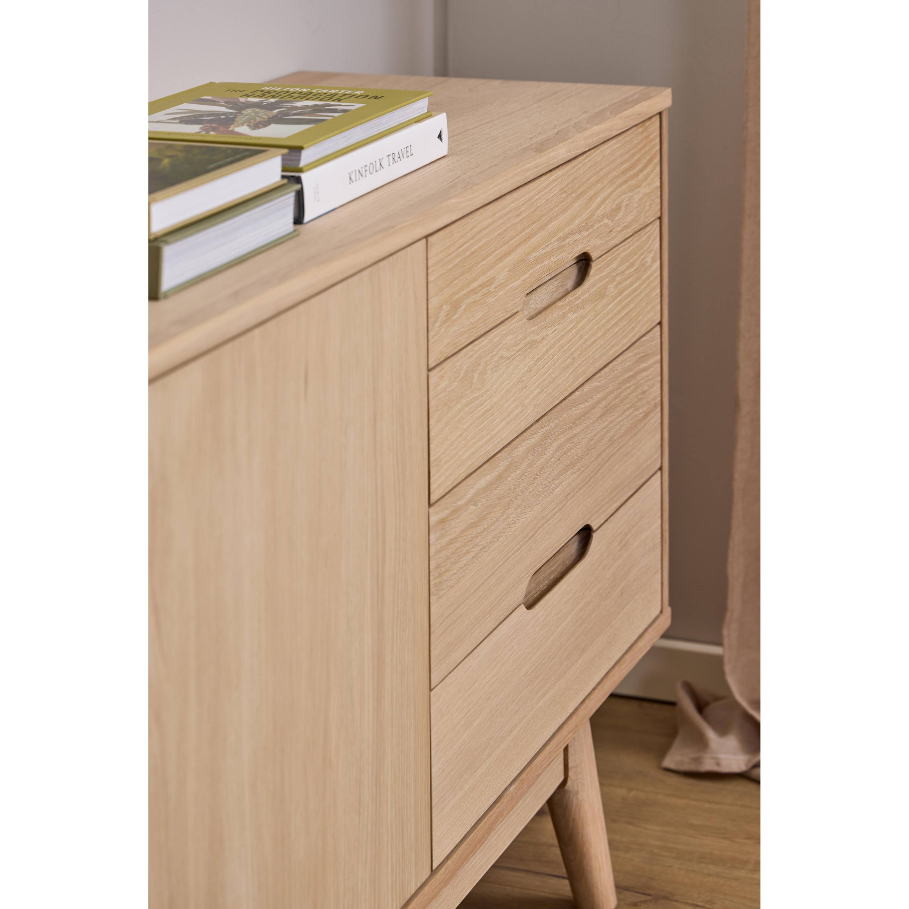 Súčasťou komody sú štyri praktické zásuvky a dve vložené police, ktoré sú ukryté za dvierkami. Vďaka tomu si do nej môžete veci usporiadať prehľadne, takže budete vždy presne vedieť, kde sa ktorý predmet nachádza.