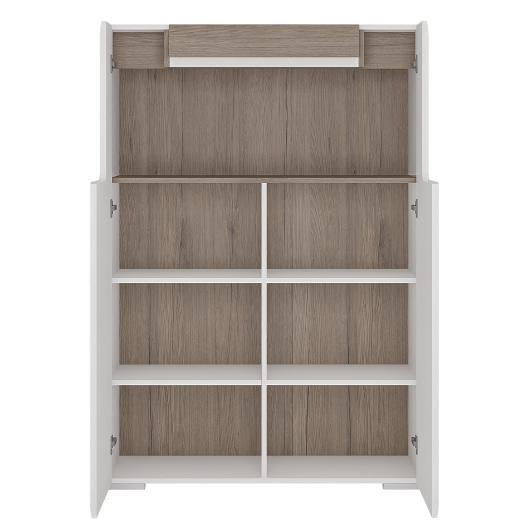 Dizajnová komoda MILANO 3 je ďalším elegantným prvkom rovnomenného programu. Jej elegantné poňatie v bielej farbe doplnené dekorom v dube sanremo nezostane bez povšimnutia. Stane sa dokonalým funkčným doplnkom každého moderne ladeného interiéru. Ponúka dostatok úložného priestoru v podobe šiestich políc skrytých za bezrúčkovými dvierkami a kontrastné otvorené police. Dvierka sú vybavené systémom soft-close, ktoré sa postarajú o ich tiché dovieranie. Komoda je vyrobená z lamina a čelo z MDF dosky potiahnutej vysoko kvalitným PVC v bielej farbe s jemným leskom. Nôžky komody sú z kvalitného plastu. Dodávané s osvetlením.