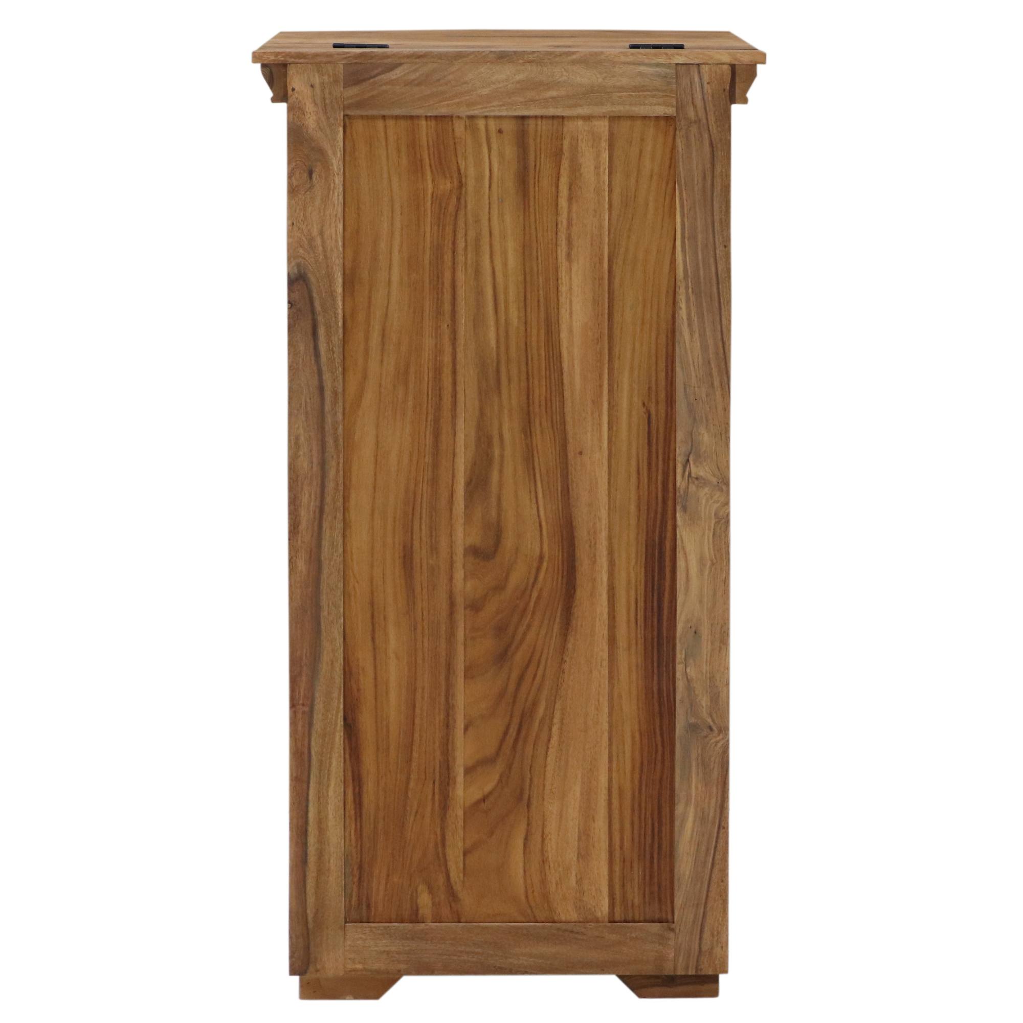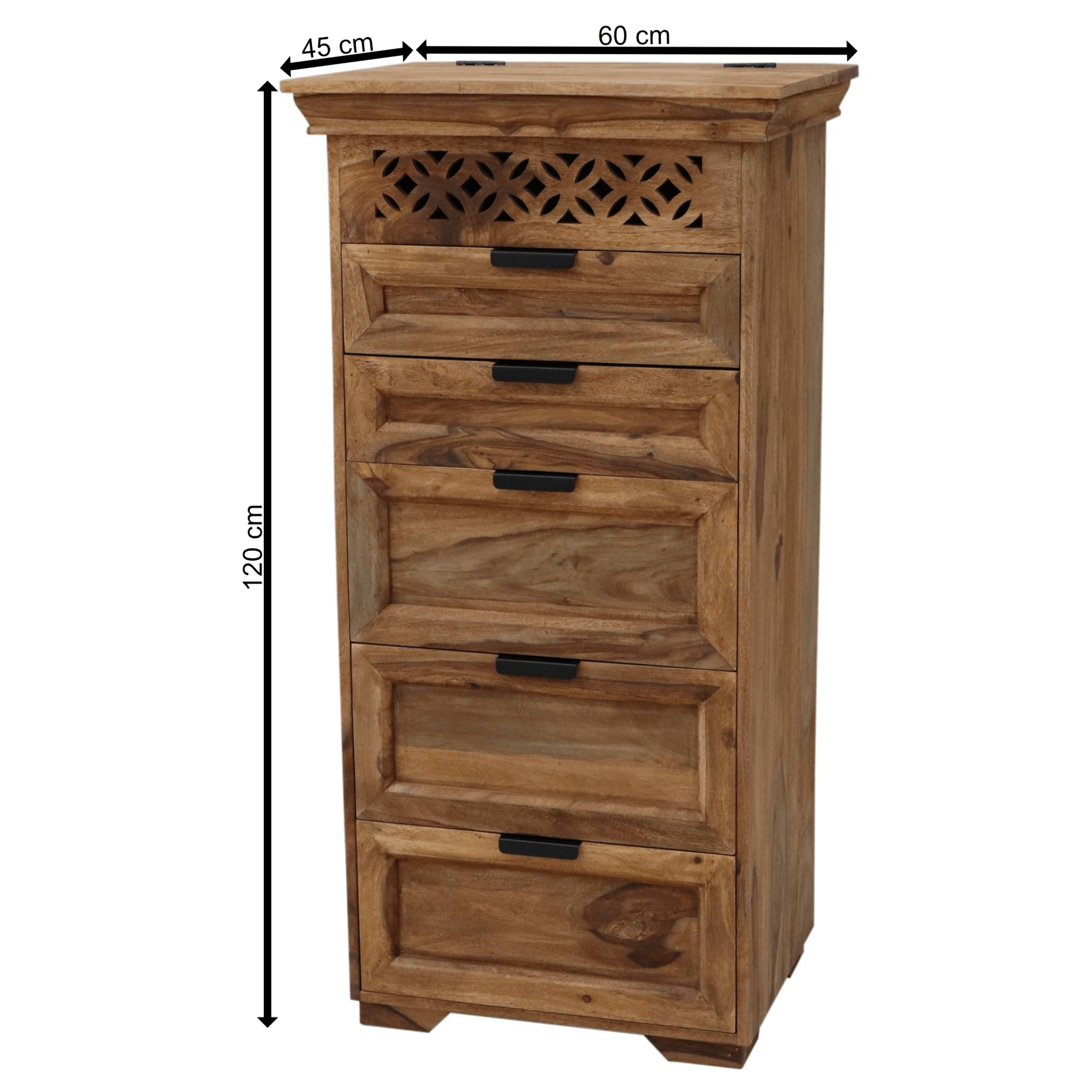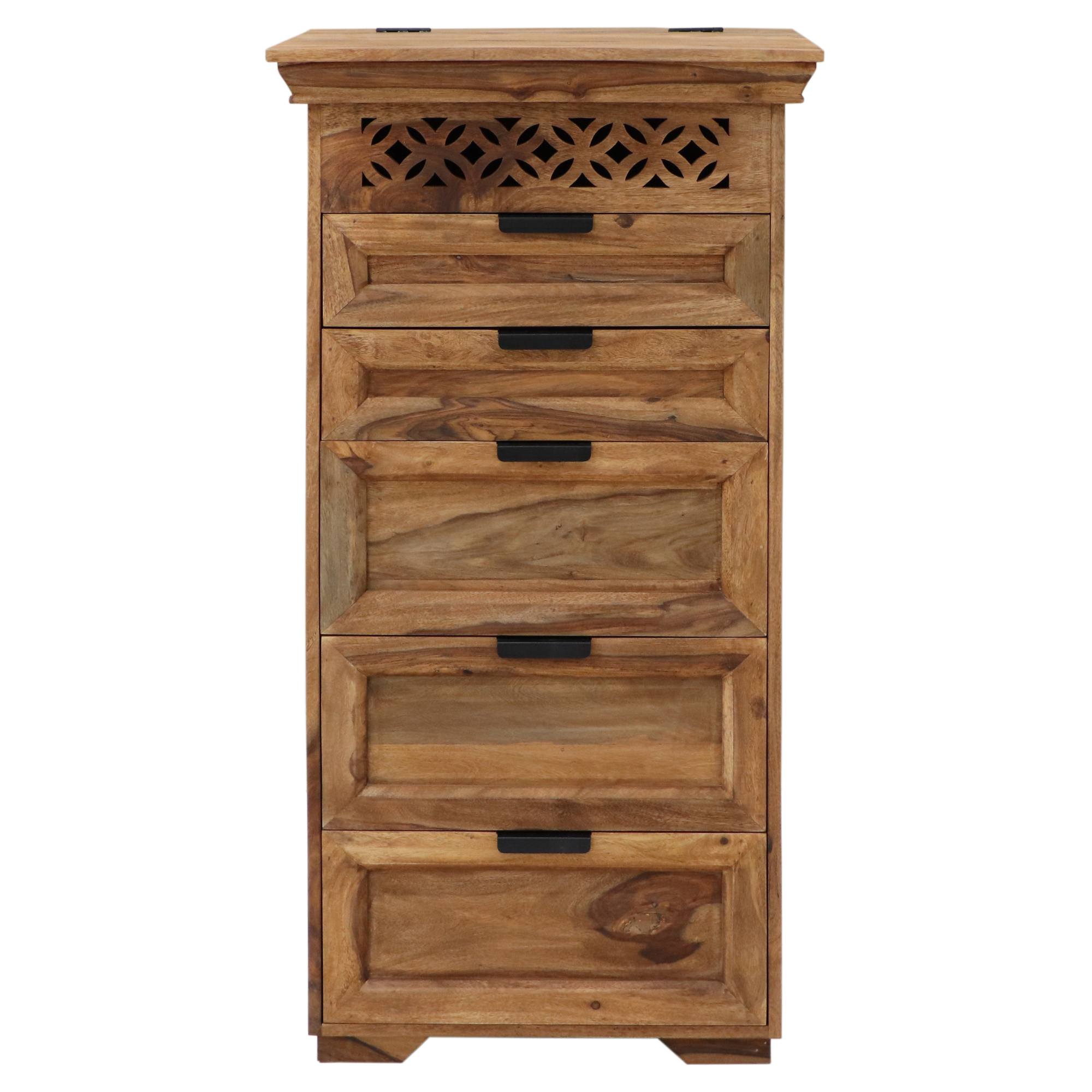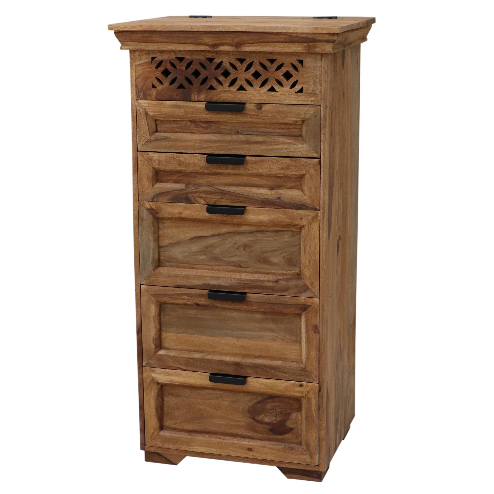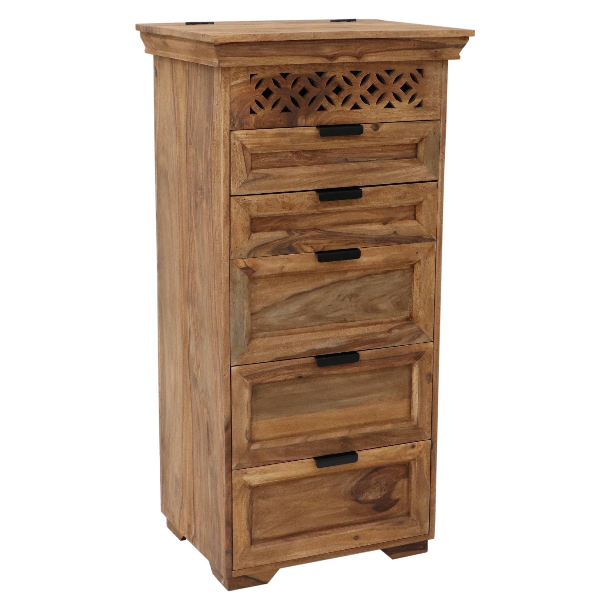 Je vyrobená z masívneho palisandrového dreva s charakteristicky tmavou farbou a krásnou výraznou kresbou, ktorú ešte viac zvýrazňuje morená povrchová úprava. Tá vytvára jeho orientálny dizajn a dodáva interiéru prírodný nádych. Vďaka unikátnej kresbe je každý kus originál. Palisander sa vyznačuje svojou pevnosťou a tvrdosťou, ktoré zaisťujú jej stabilnú konštrukciu. Disponuje 5 zásuvkami, ktoré ponúknu priestor na všetko potrebné, či ju využijete v spálni, obývačke alebo predsieni. Vrchná časť je vybavená výklopnými dvierkami, za ktorými sa ukrýva zrkadlo a ďalší úložný priestor. Zároveň je táto časť doplnená vyrezávanými detailmi, ktoré dotvárajú jej orientálny dizajn. Zásuvky sú vybavené čiernymi úchytkami na pohodlnú manipuláciu.
