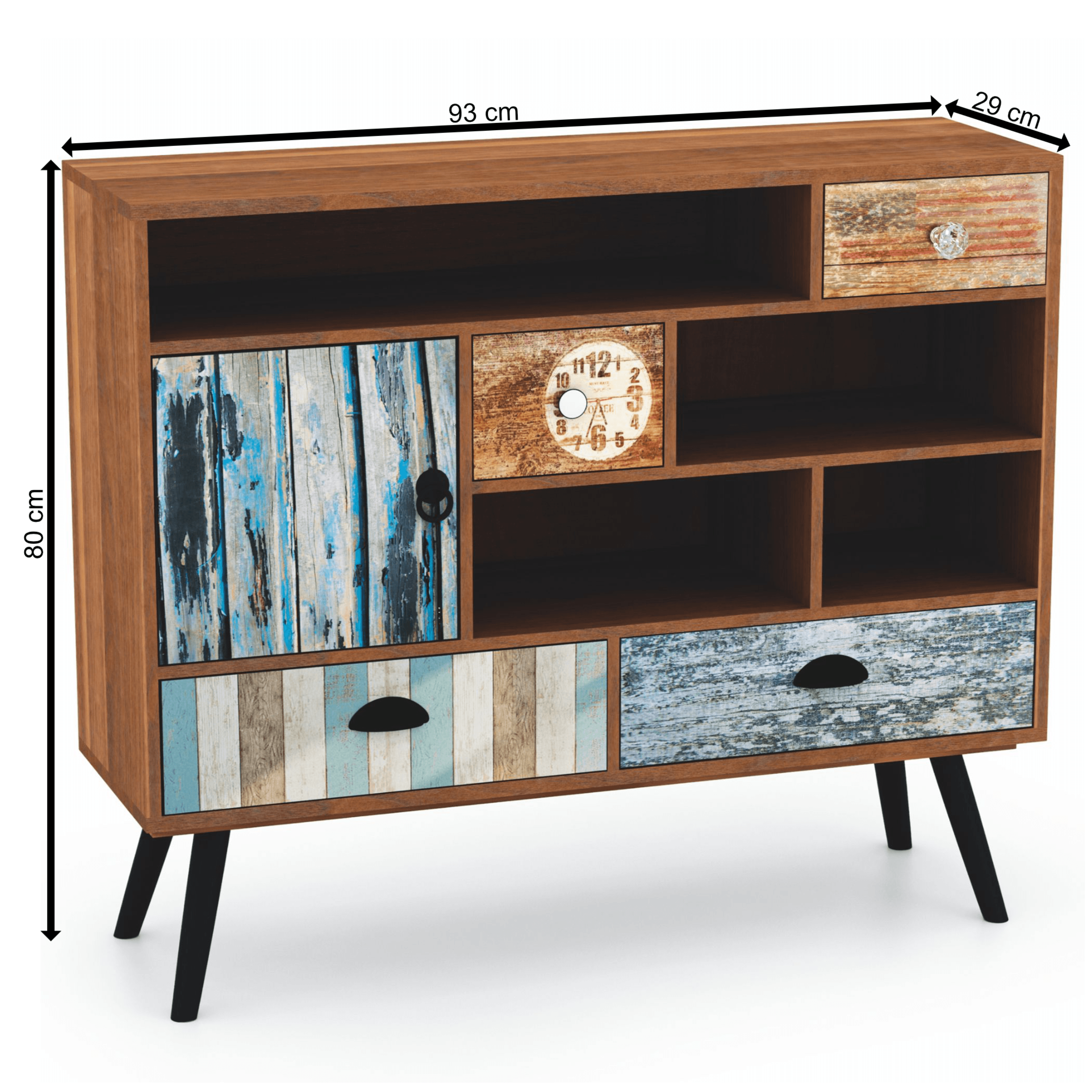Kombinácia pestrých farieb a motívov, kde všetky tieto prvky sú zakomponované do jedného nábytku? Tak si možno predstaviť komodu MIZU 2, ktorá bude vo vašom interiéri zaručene vynikať. Dostanete tak plno miesta na uloženie všetkého potrebného alebo vystavenie dekorácií. Obsahuje priestor za dvierkami, štyri priehradky a tri zásuvky s dekoratívnymi rúčkami. Vysoké nohy zaisťujú potrebnú pevnosť a stabilitu. Materiál je nenáročný na údržbu.