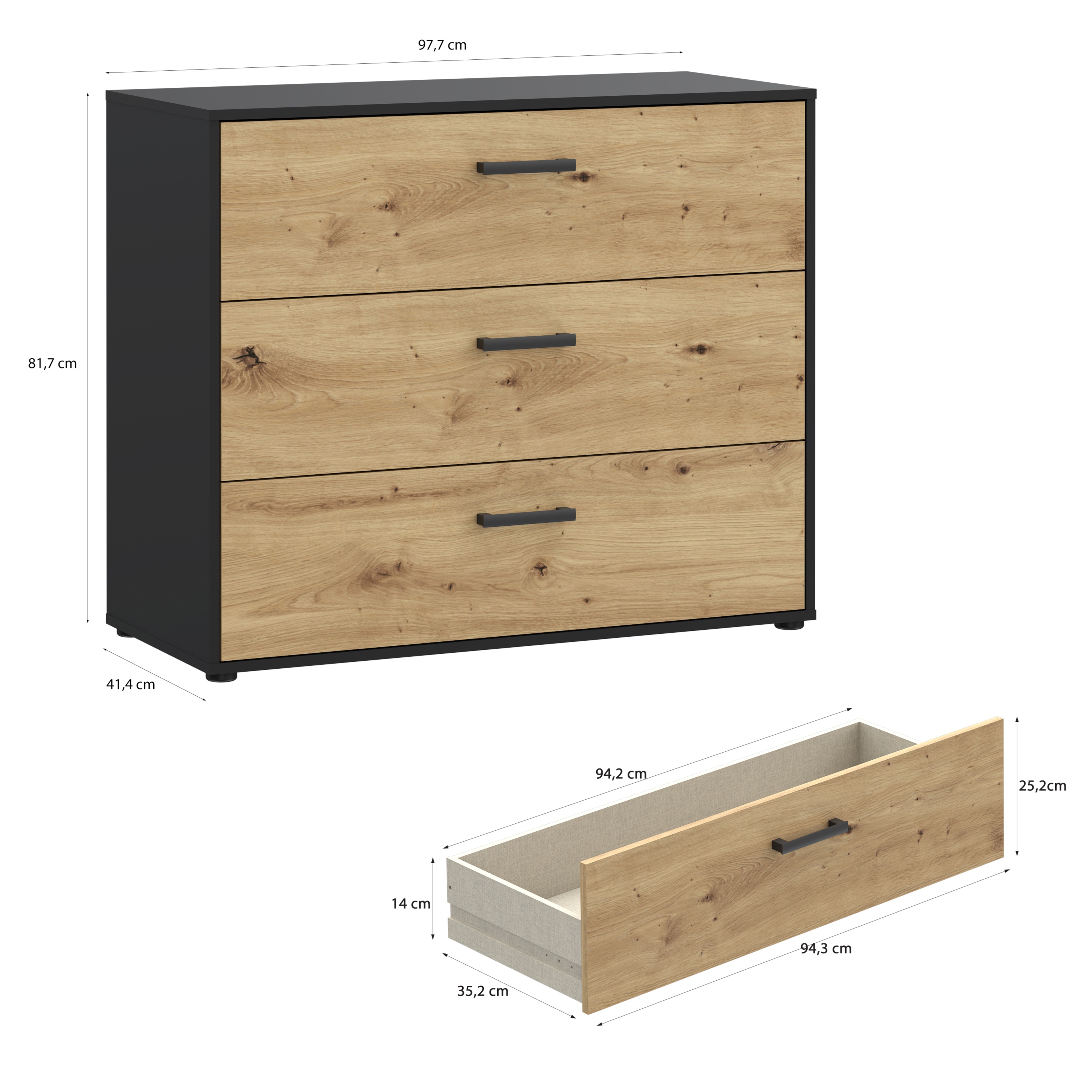 Komoda MONESSA v modernom dizajne v kombinácii prírodného dubového dekoru a čiernej farby obohatí miestnosť o praktický úložný priestor a zároveň dodá útulnosť.