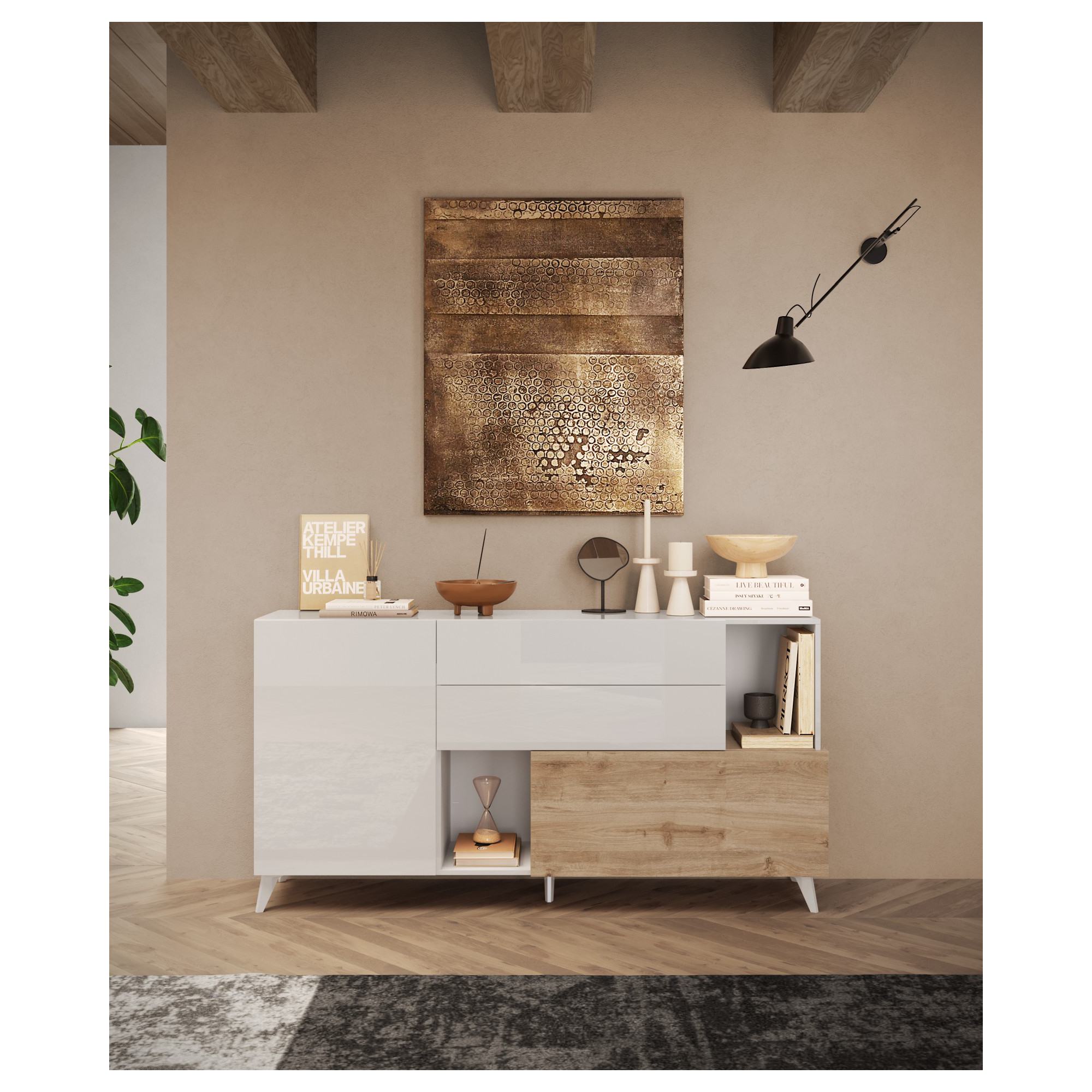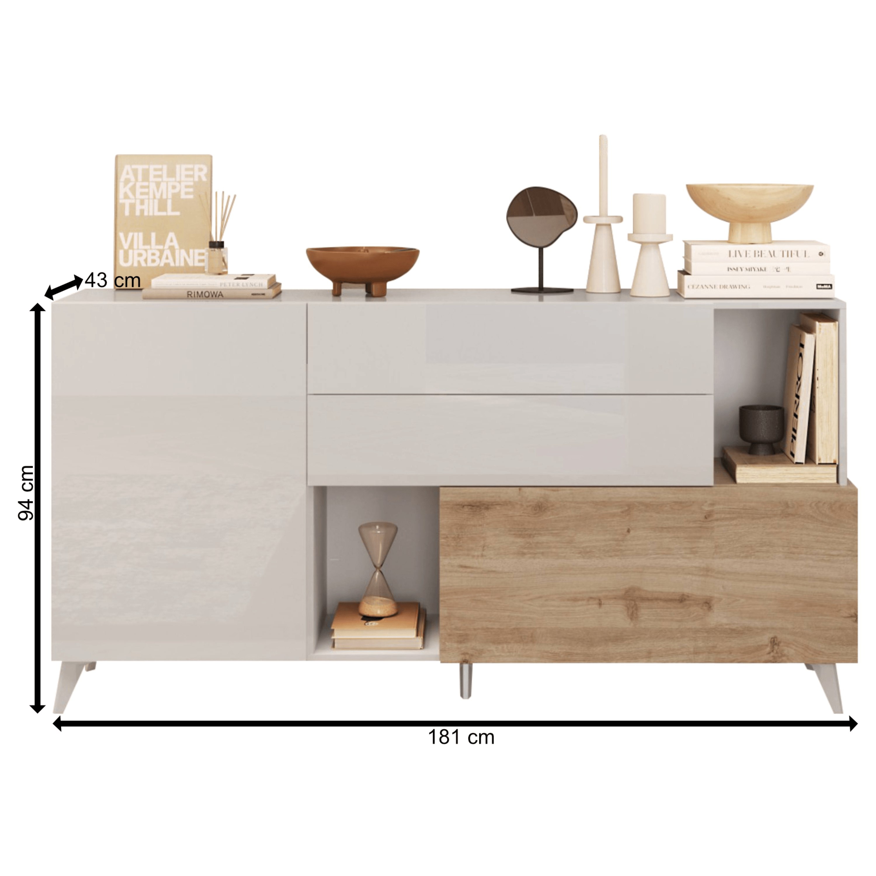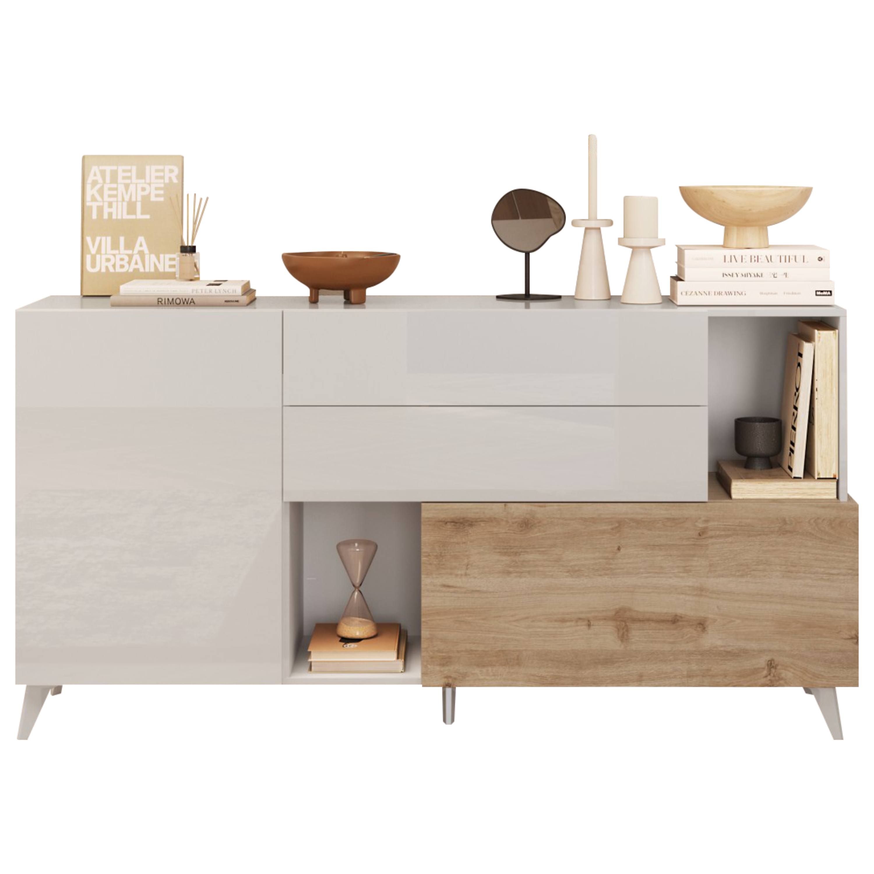 Ľavá strana je vybavená otočnými dverami, za ktorými sa nachádza 1 vložená polica. Komoda ponúka aj 2 priestranné zásuvky a delený priestor za výklopnými dverami. Každodennú manipuláciu so všetkými uvedenými prvkami spríjemňuje systém tichého dovierania soft close. Komoda ponúka tiež 2 otvorené odkladacie okná ideálne na vystavenie dekorácií. Elegantný vzhľad komody zvýrazňujú kónické nohy. Konštrukcia je vyrobená z kvalitnej laminovanej drevotriesky nenáročnej na údržbu.