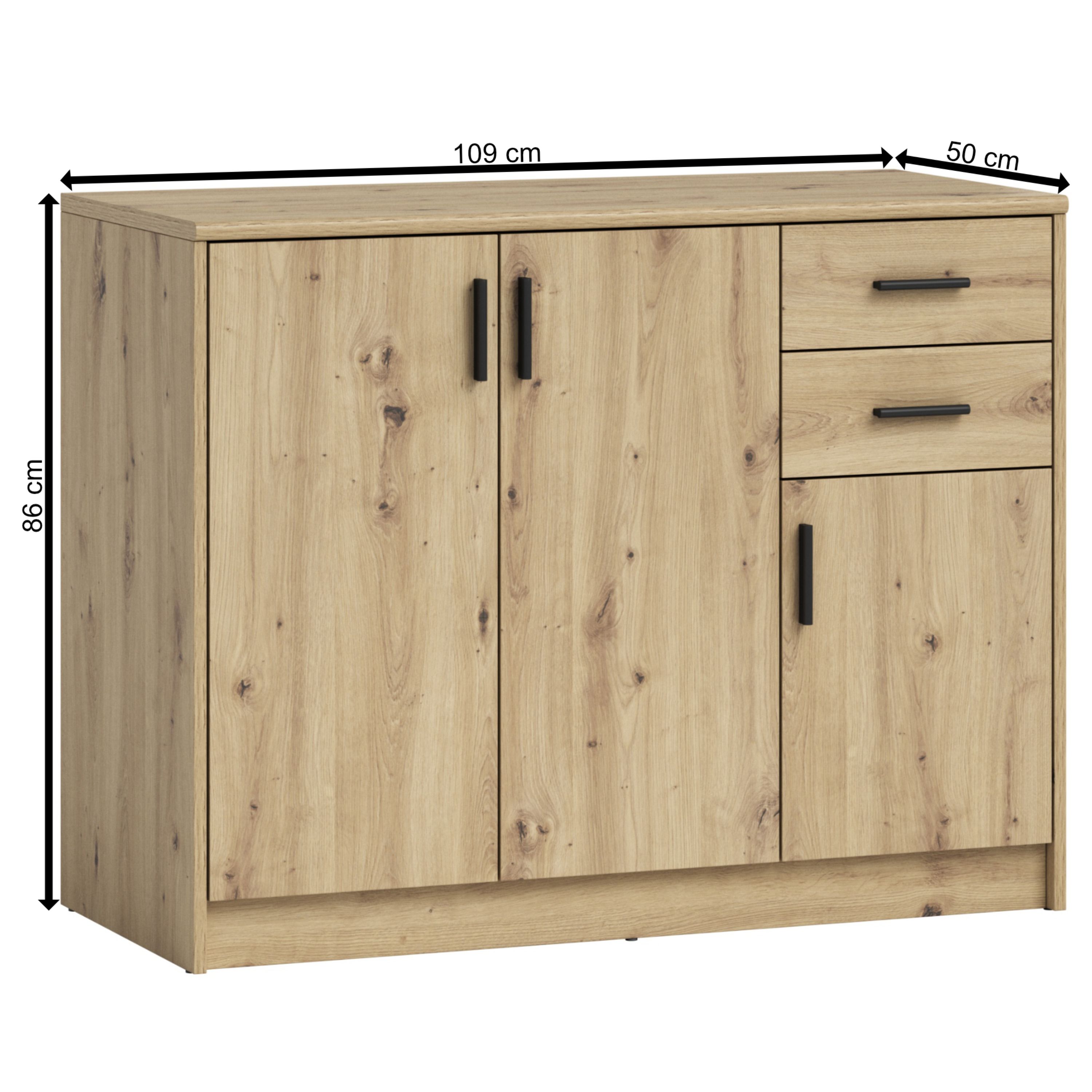 Za dvierkami komody sa ukrývajú 3 vložené police, ktoré umožňujú prehľadné uloženie všetkého, čo sa dovnútra rozhodnete umiestniť. Nechýbajú ani 2 zásuvky. Aby sa so zásuvkami a dvierkami dobre manipulovalo, sú vybavené rúčkami. Horná doska komody ponúka priestor na vystavenie obľúbených dekorácií.