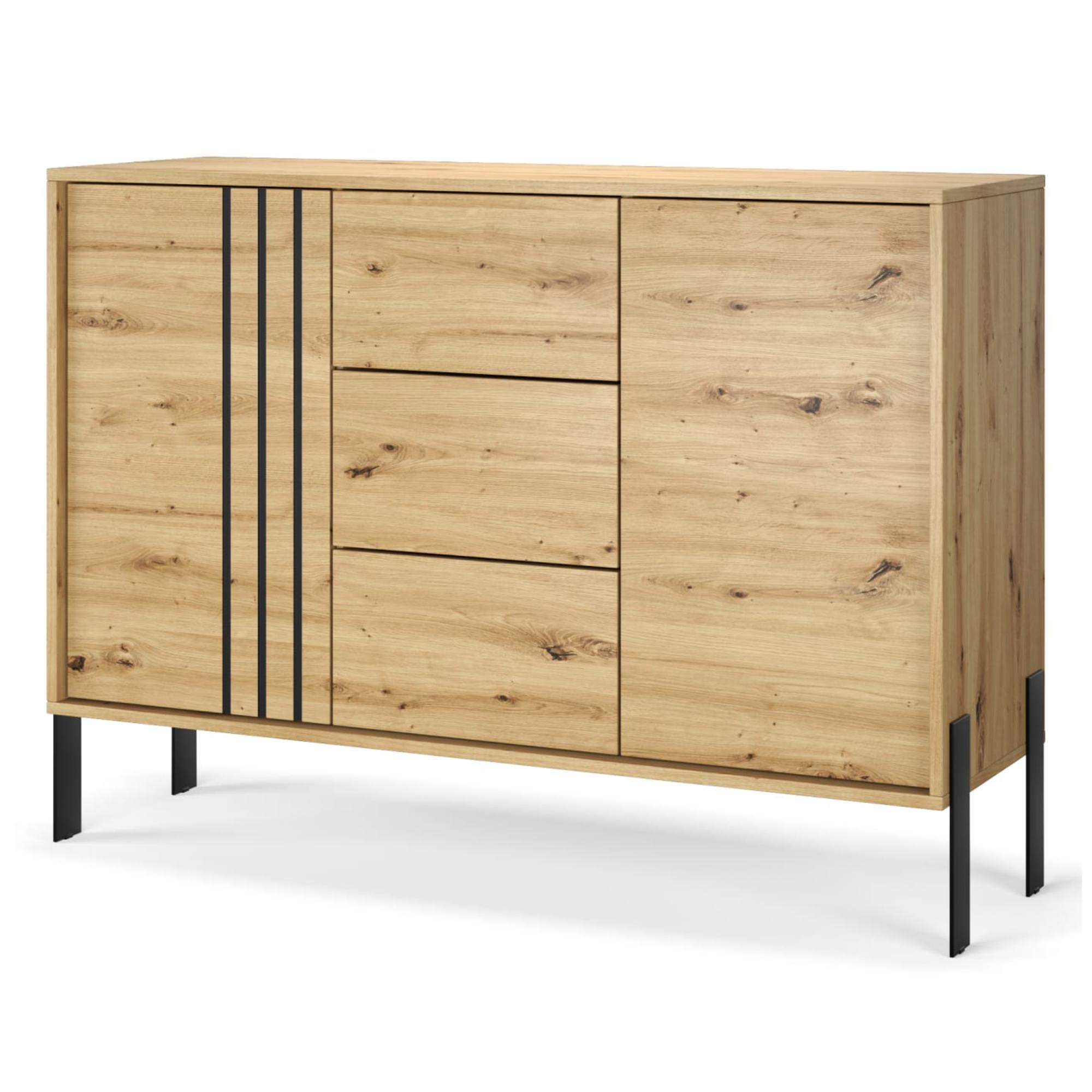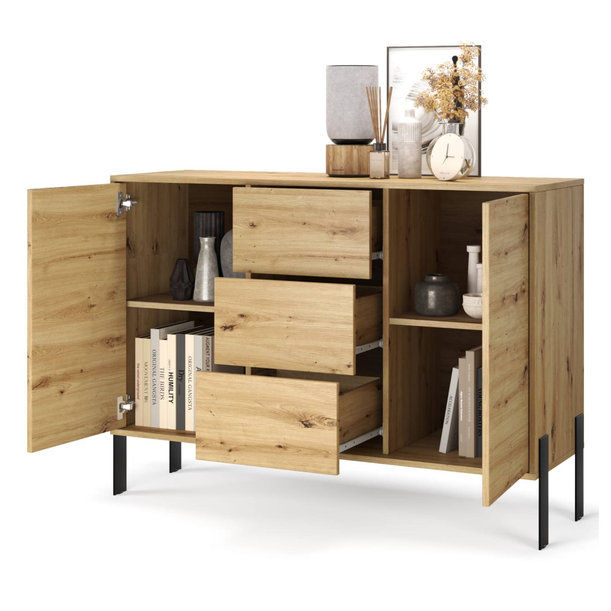 Za dvierkami komody sa nachádzajú 2 vložené police. Jej súčasťou sú aj 3 zásuvky, do ktorých si môžete prehľadne uložiť všetko, čo potrebujete mať po ruke. Dvierka aj zásuvky sú vyhotovené v štýlovom bezrúčkovom prevedení.