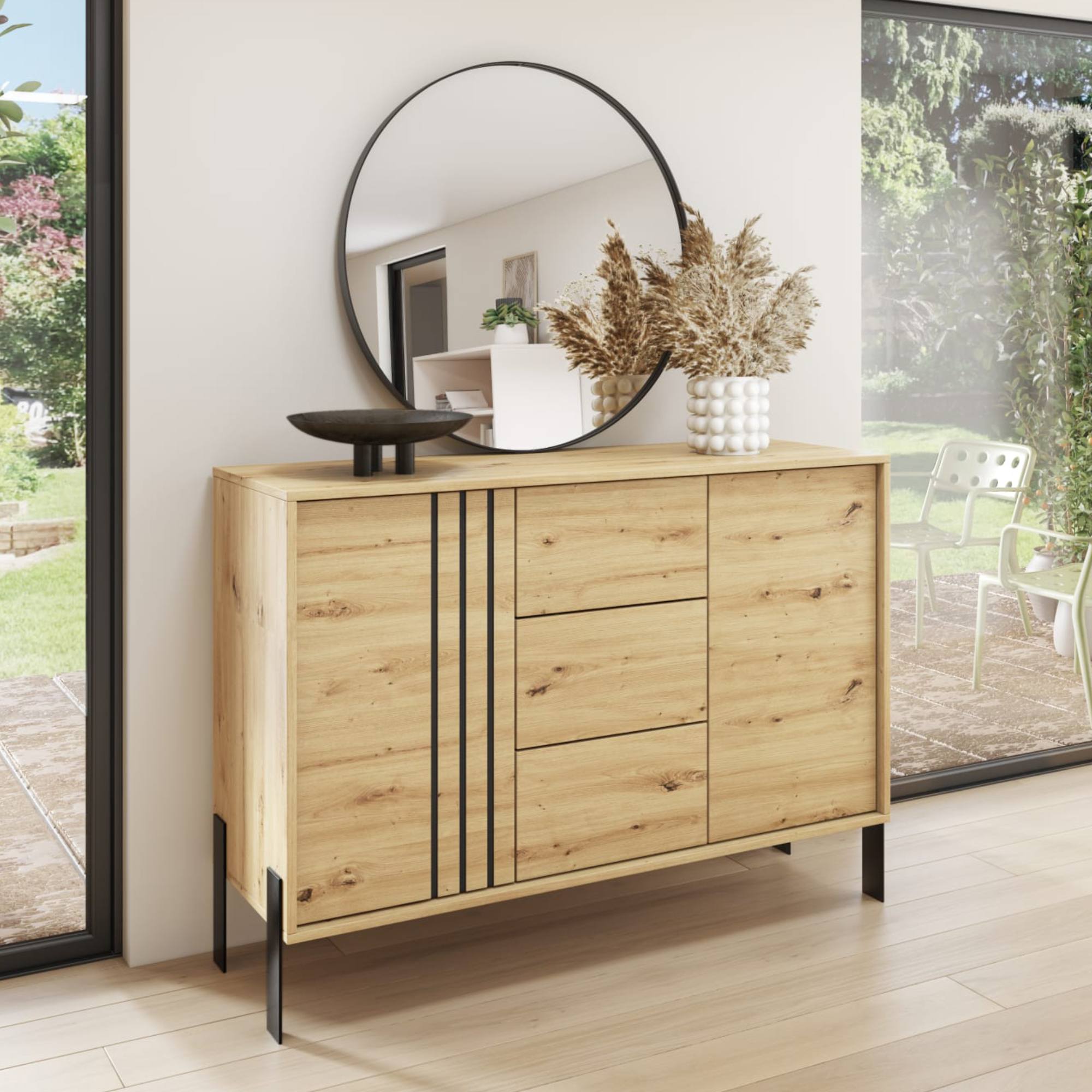 Na výrobu komody NEXO, ktorá stojí na pevných a stabilných kovových nohách, bola využitá ľahko udržiavateľná laminovaná drevotriesková doska.