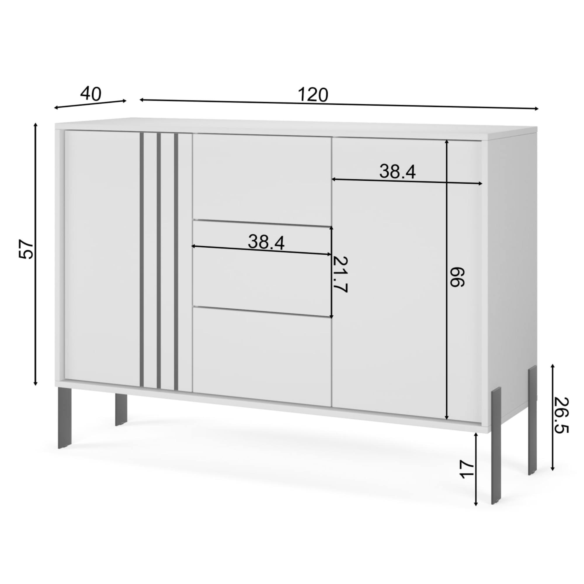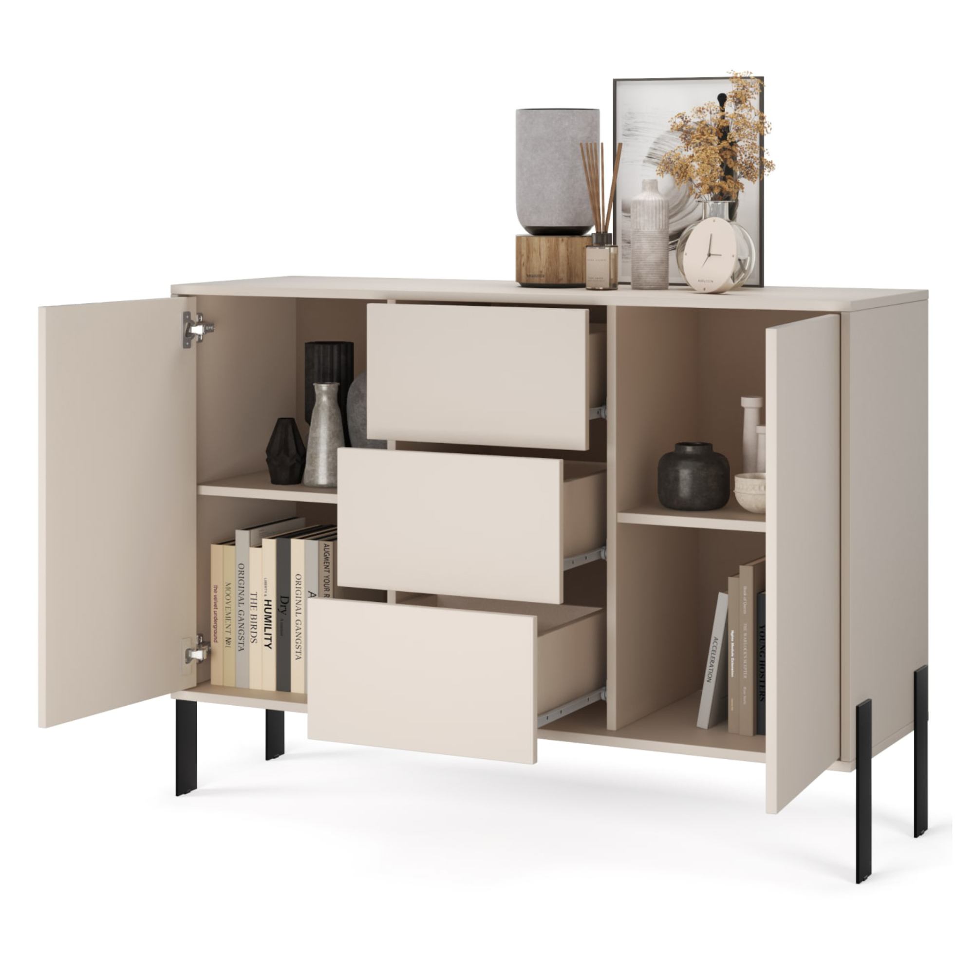 Za dvierkami komody sa nachádzajú 2 vložené police. Jej súčasťou sú aj 3 zásuvky, do ktorých si môžete prehľadne uložiť všetko, čo potrebujete mať po ruke. Dvierka aj zásuvky sú vyhotovené v štýlovom bezrúčkovom prevedení.