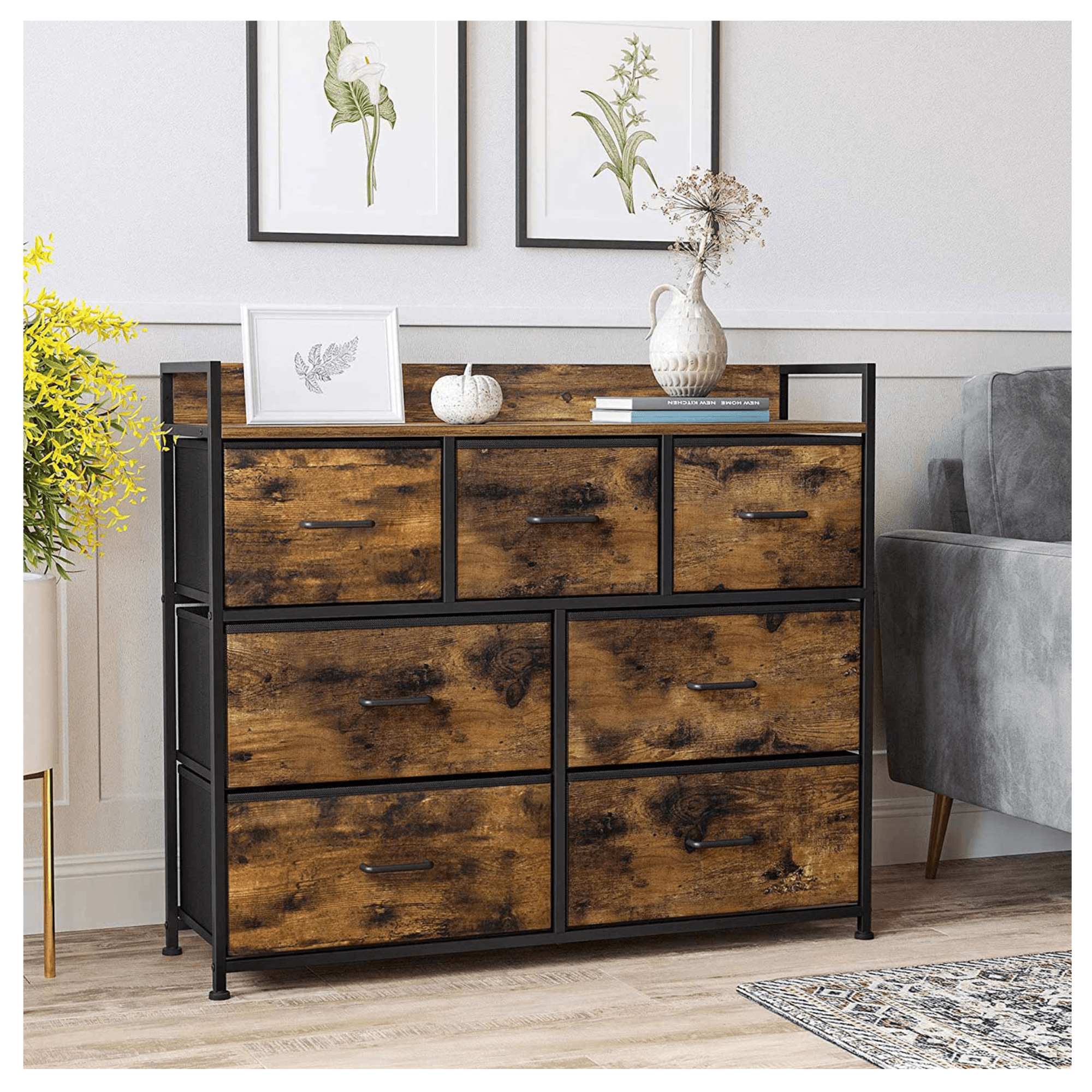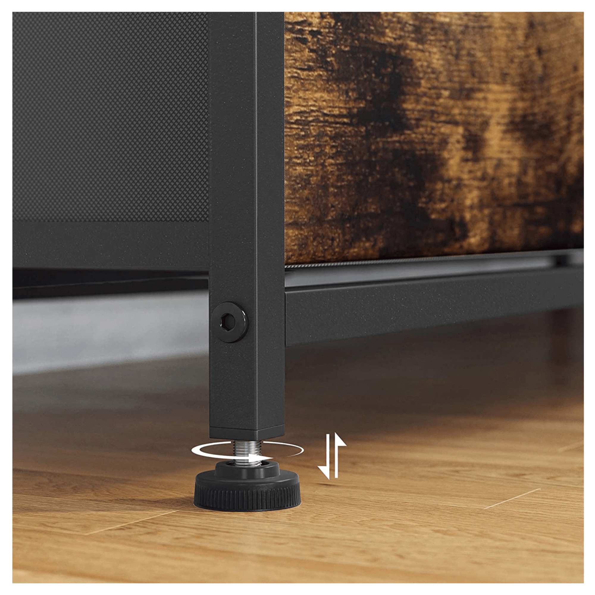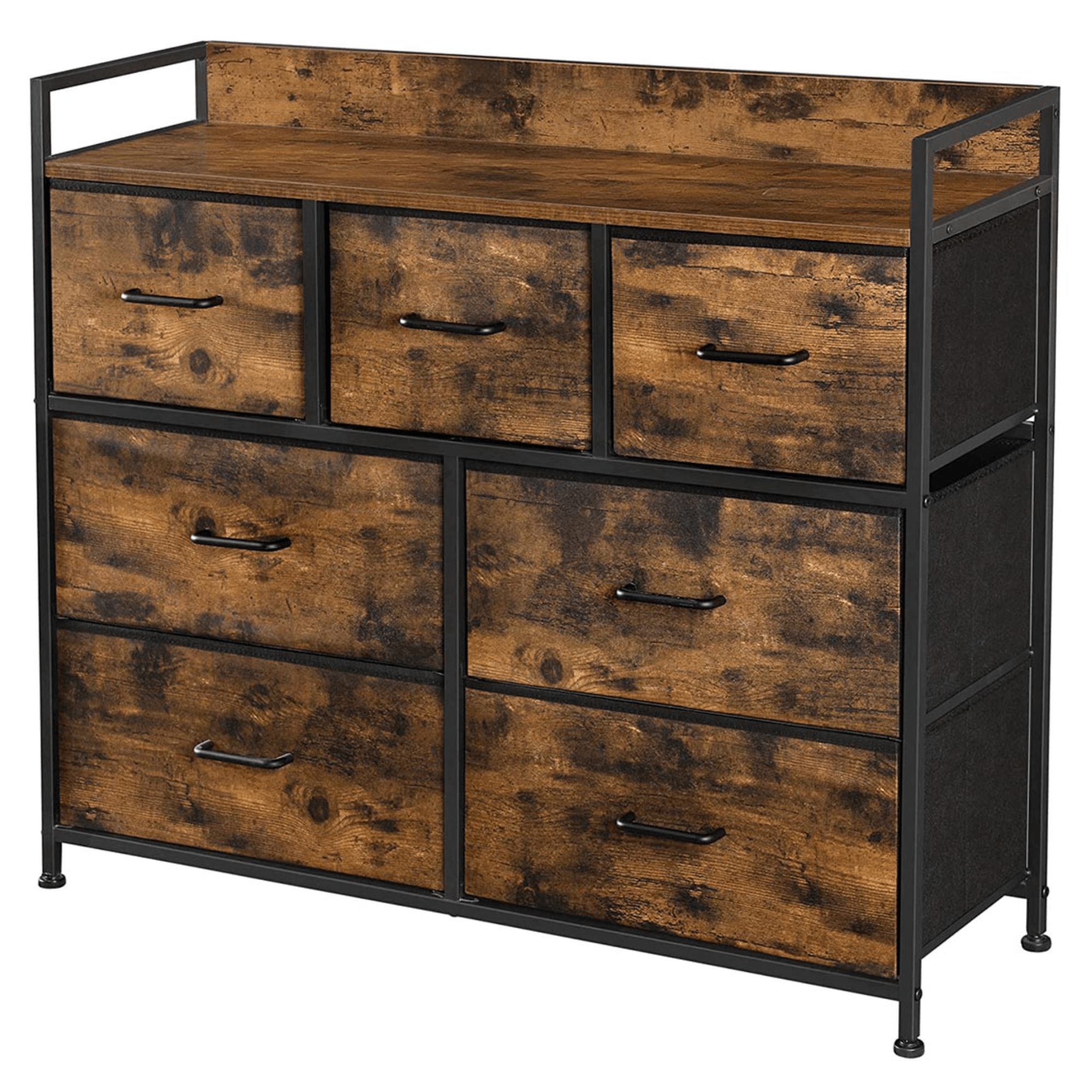 Komoda NURMES V kombinuje drevovláknité dosky v rustikálnej hnedej farbe, čierny kov a netkanú textíliu. Spolu vytvárajú zaujímavý vzhľad s industriálnym nádychom a komoda tak ľahko zapadne do moderných či industriálne ladených interiérov.