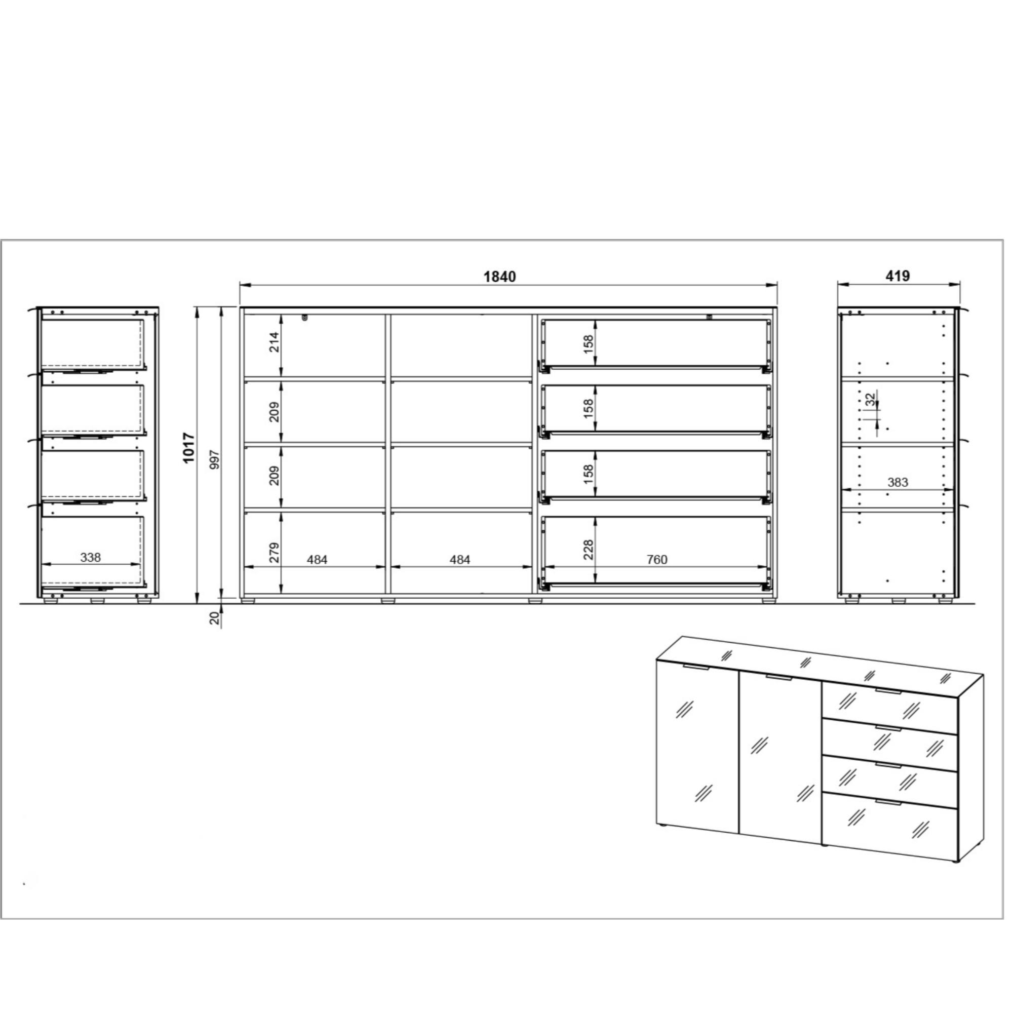 Jej súčasťou je 6 nastaviteľných políc ukrytých za dvierkami a 4 zásuvky. Vďaka tomu komoda poskytuje dostatok úložného priestoru na všetky predmety, ktorým vo vašej domácnosti potrebujete nájsť stále miesto.