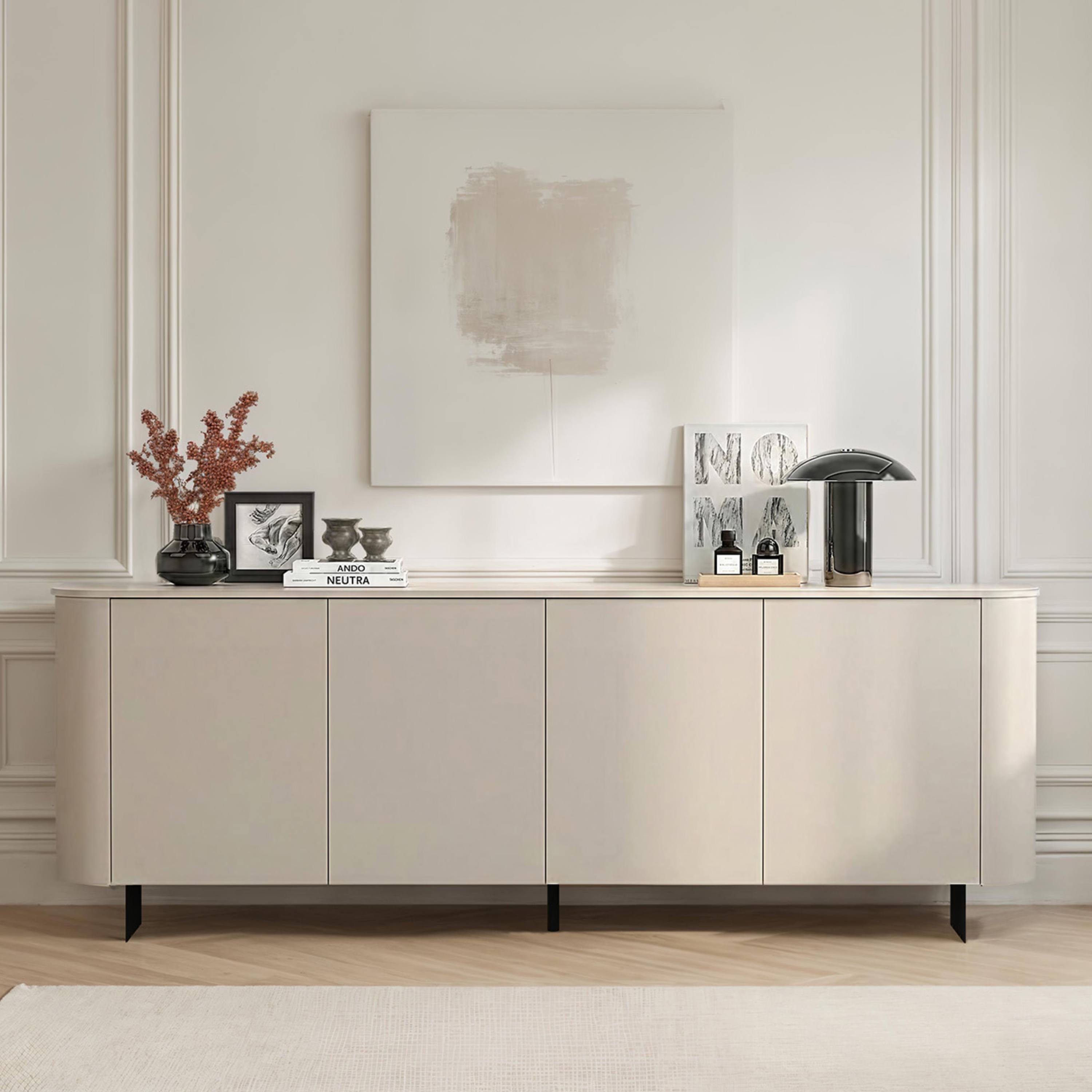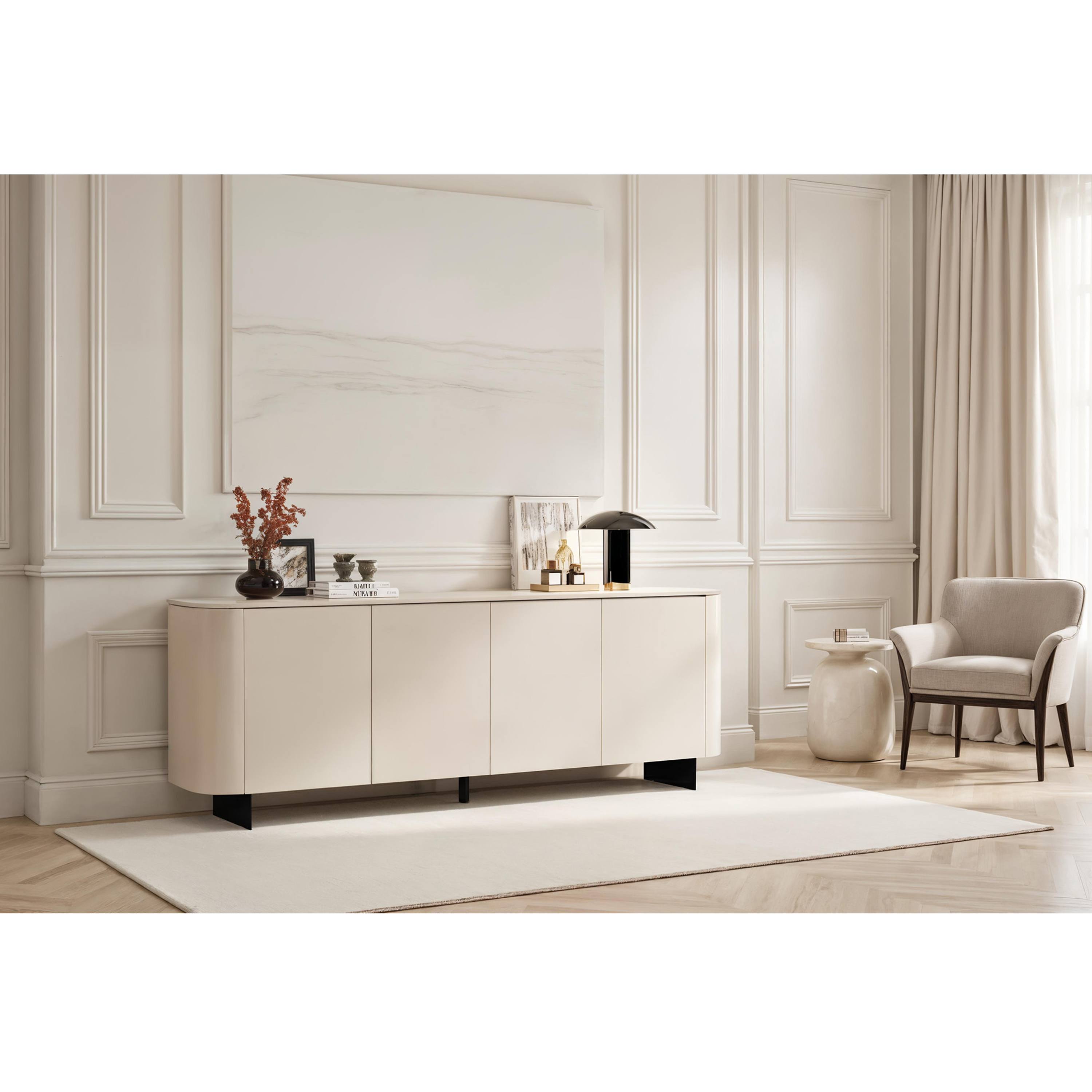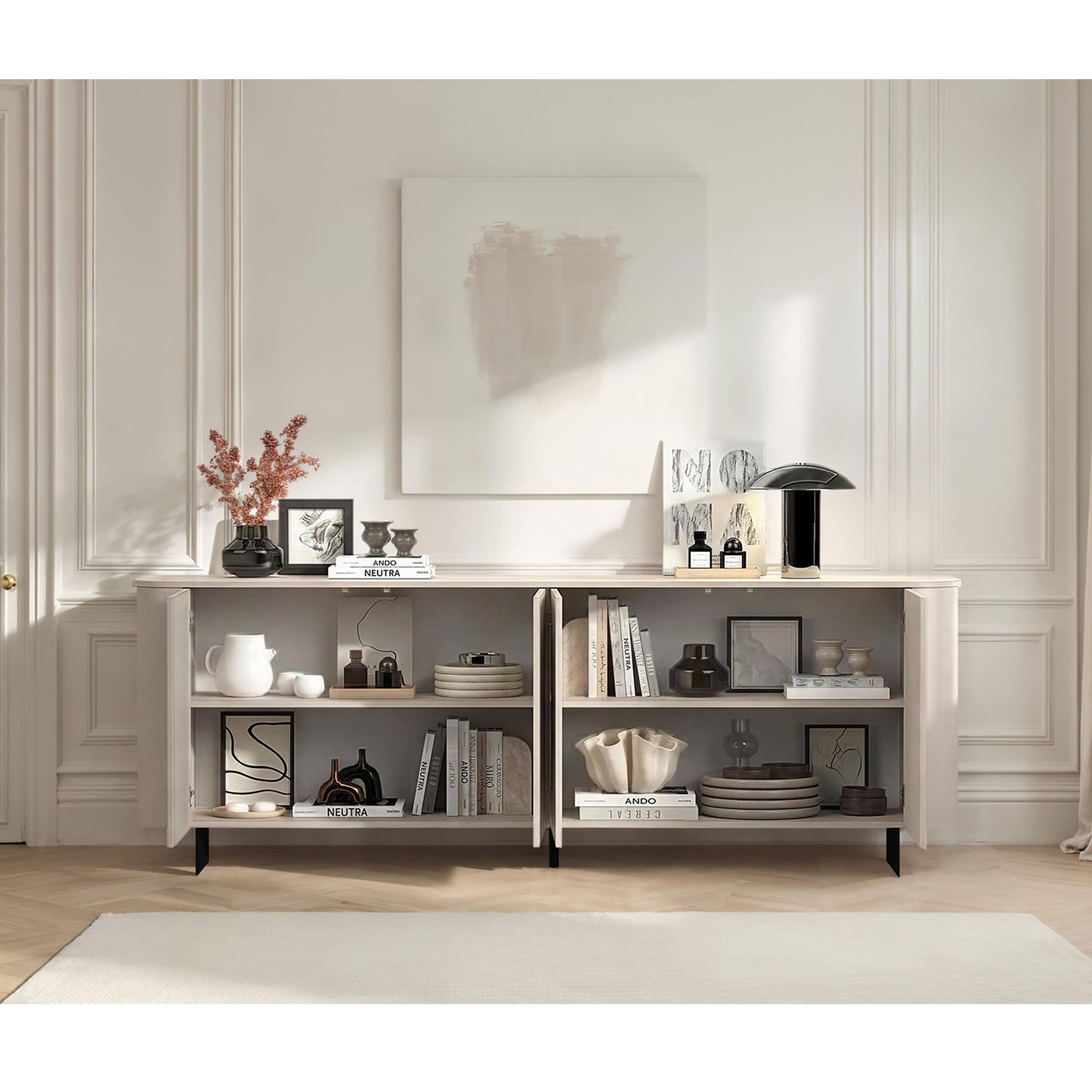 Za každým párom otočných dverí sa ukrýva veľkorysý úložný priestor s vloženou policou pre prehľadné usporiadanie najrôznejších predmetov. Dvierka sú riešené v bezúchytovom vyhotovení, čo podčiarkuje minimalistický vzhľad celku a zaisťuje pohodlné otváranie. Široká horná doska ponúka ideálne miesto na vystavenie dekorácií, kníh alebo ďalších štýlových prvkov.