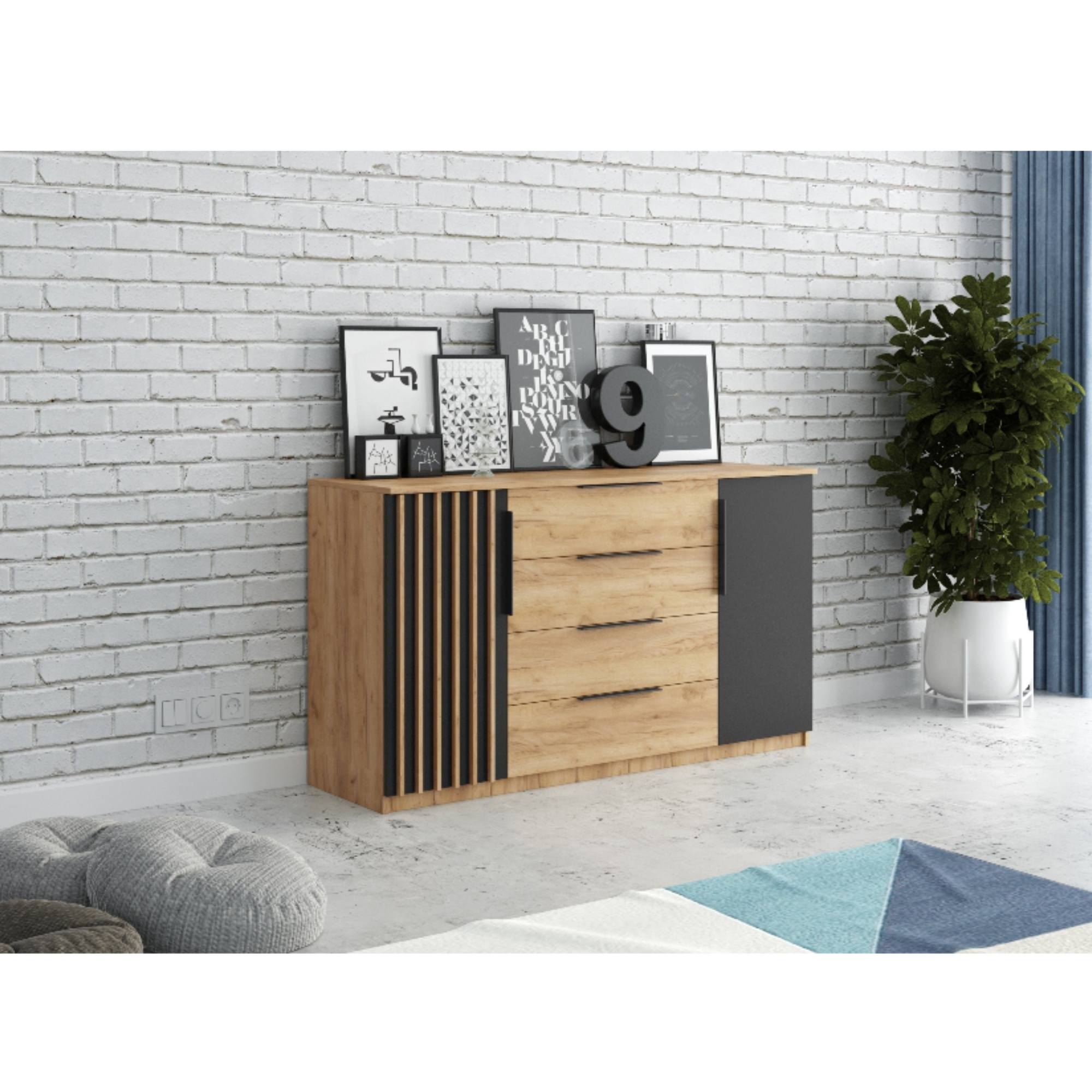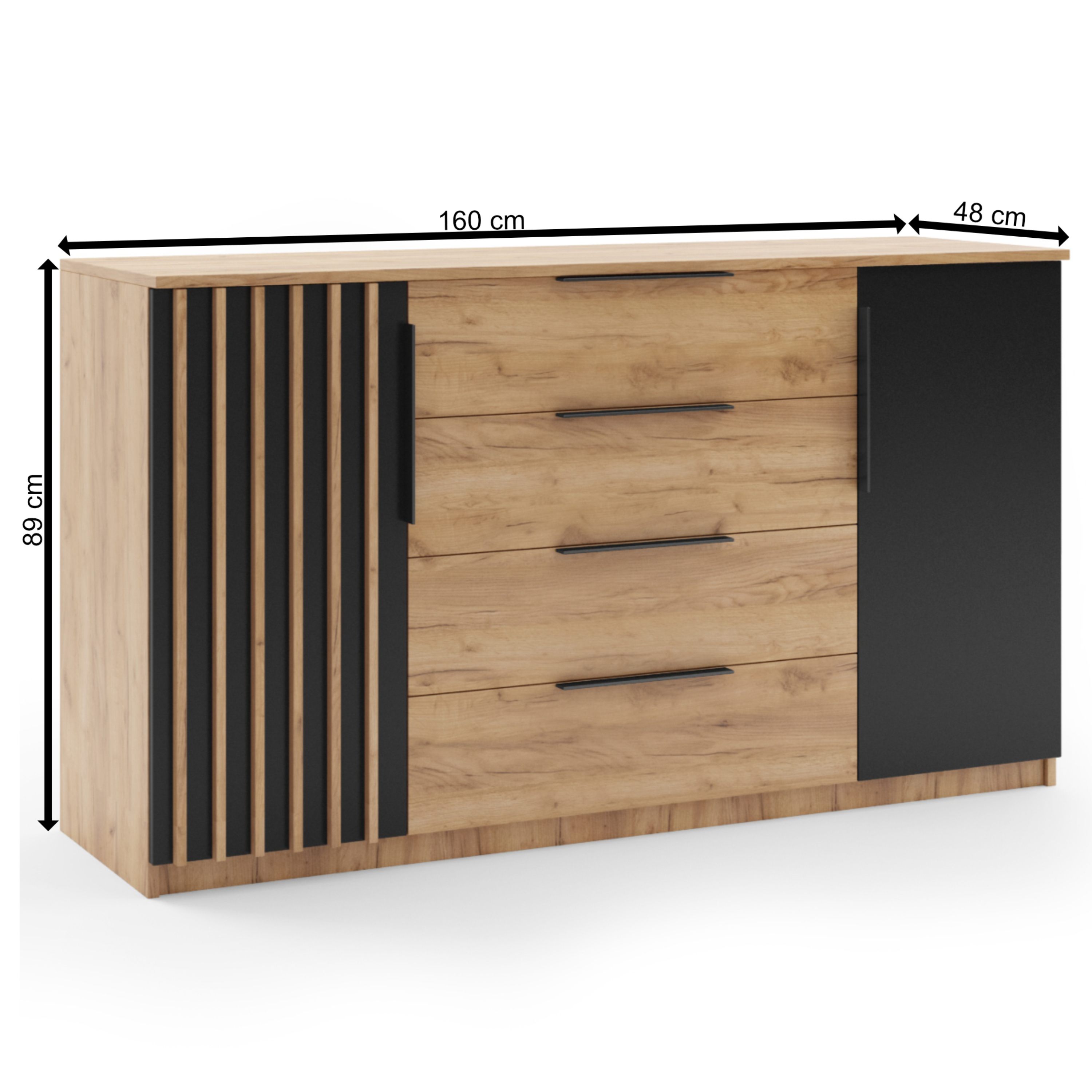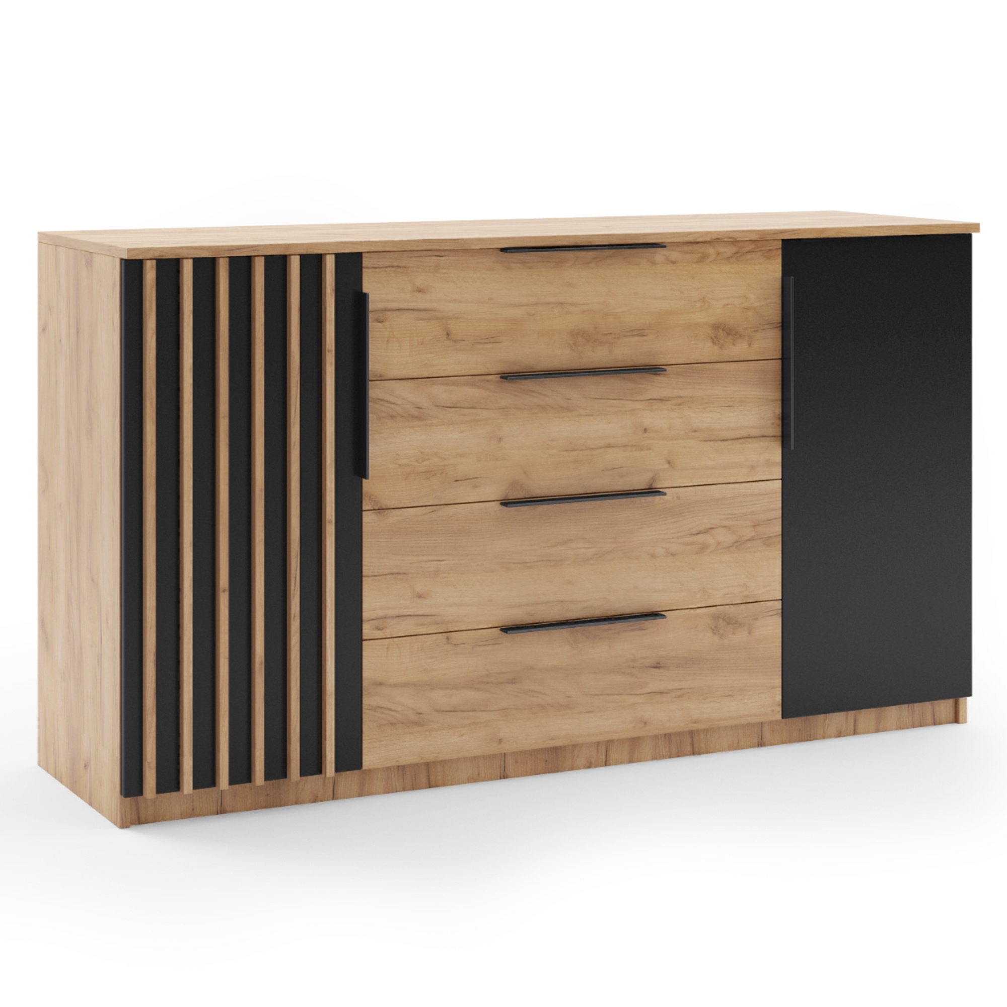 Komoda PATRICK III vyhotovená v modernom dizajne a ozdobená štýlovými lamelami vám ponúka dostatočný úložný priestor na všetky potrebné predmety.