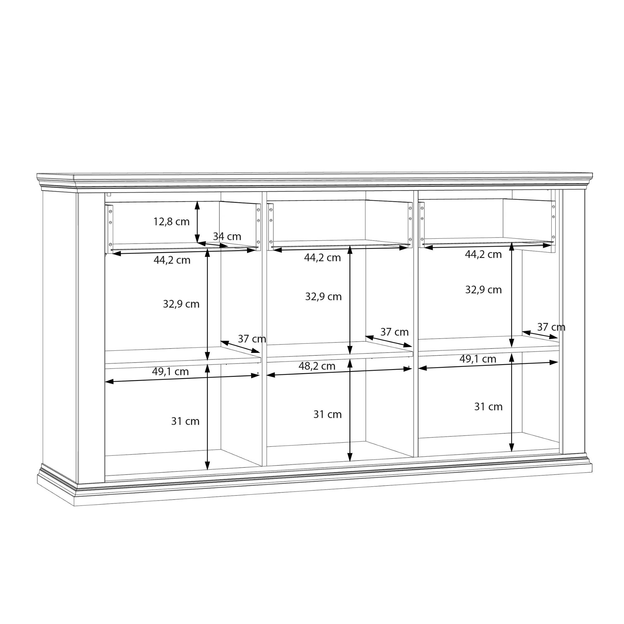 Za jej dvierkami nájdete 3 vložené police. Okrem nich sú súčasťou komody aj 3 zásuvky, ktoré sú ako stvorené na uloženie rôznych drobností. Aby sa s dvierkami a zásuvkami lepšie manipulovalo, sú vybavené rúčkami.