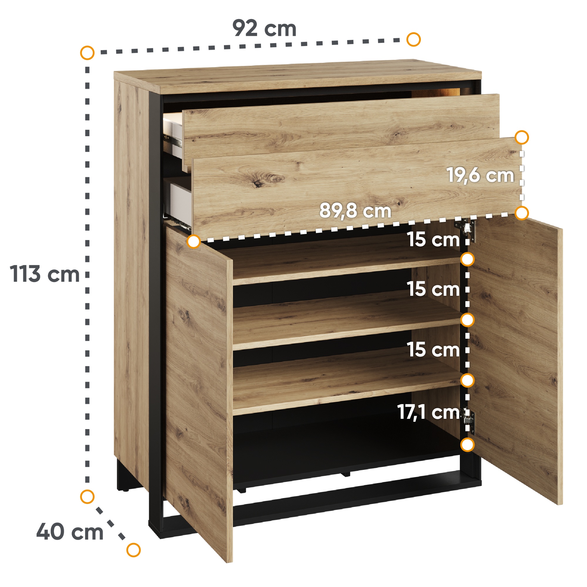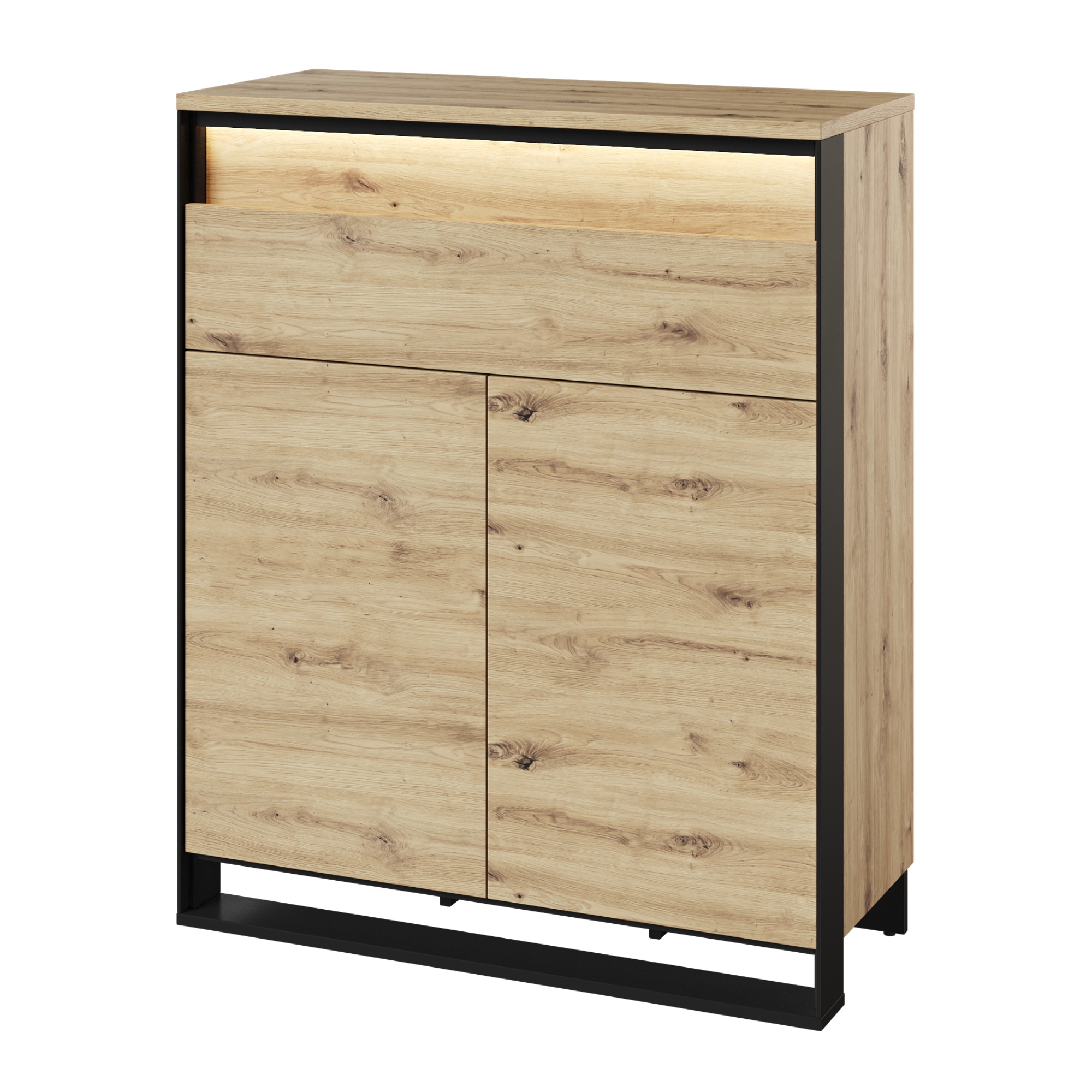 Dostatočný úložný priestor zaisťuje spodná, dvierkami uzatvárateľná sekcia s tromi policami. Horná oblasť disponuje dvoma zásuvkami. Bezrúčkové vyhotovenie zvýrazňuje čistý a moderný dizajn. Pomyselnou čerešničkou na torte je LED podsvietenie, ktoré zútulní temné večery.