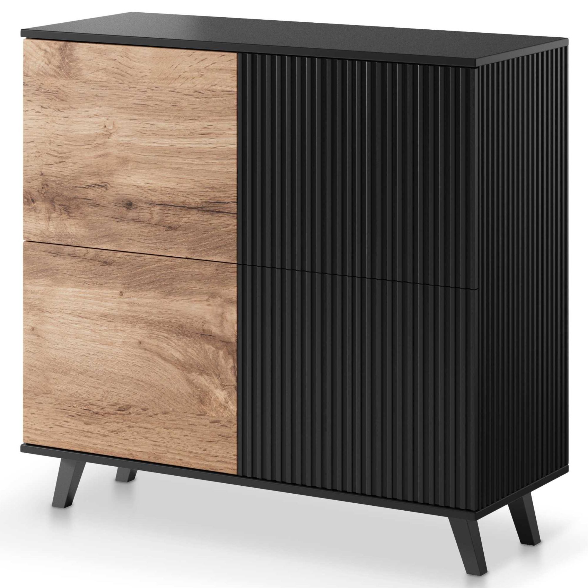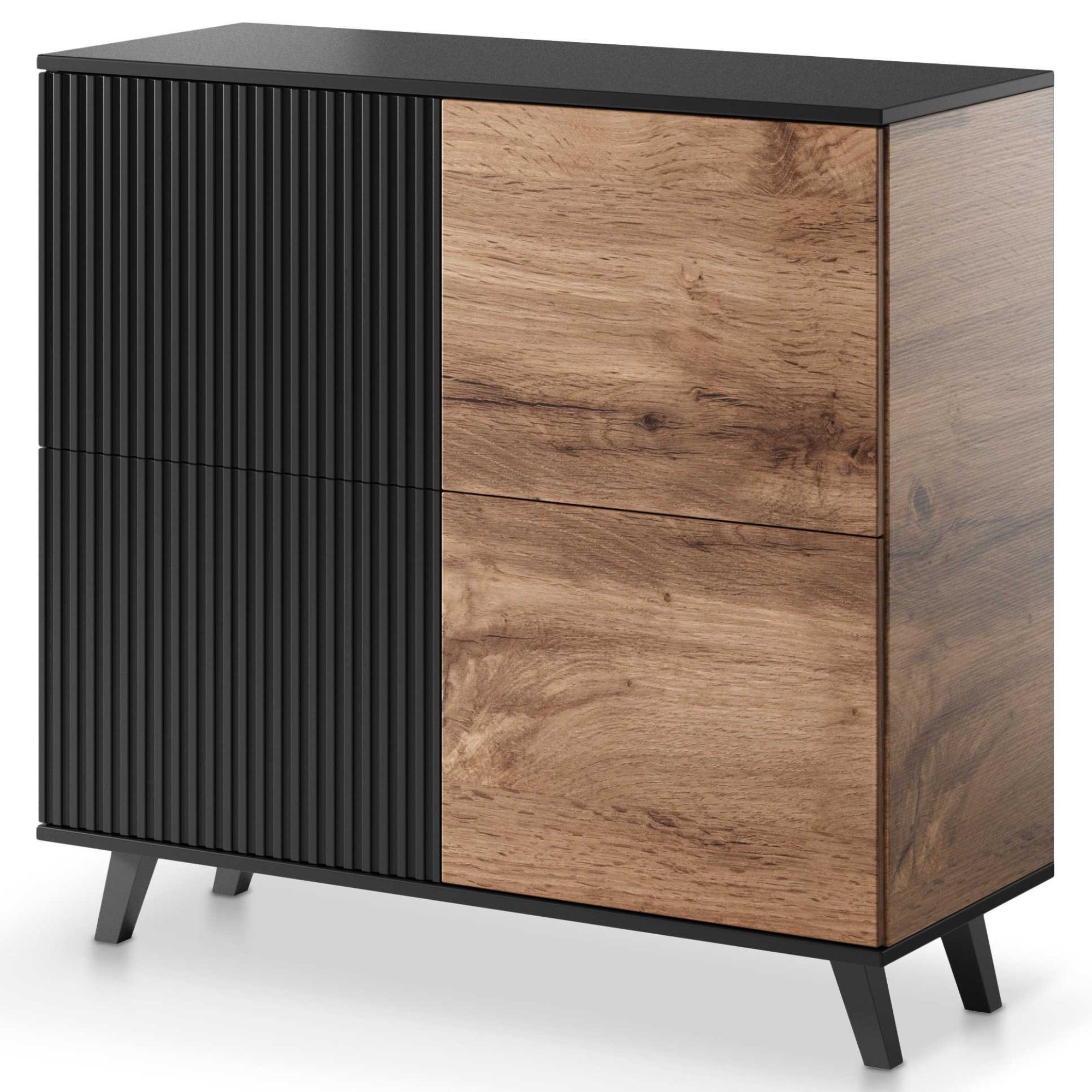 Komoda RONDUM predstavuje praktický úložný priestor na všetky predmety, ktoré si prajete mať ihneď po ruke. Kombinácia čiernej farby korpusu s prednými plochami z dyhovaného dreva zaručene zapadne do všetkých moderných interiérov. Vnútri dvierok nájdete plno priestoru na uloženie všetkého potrebného. Montáž dvierok je možná na ľavú alebo pravú stranu.