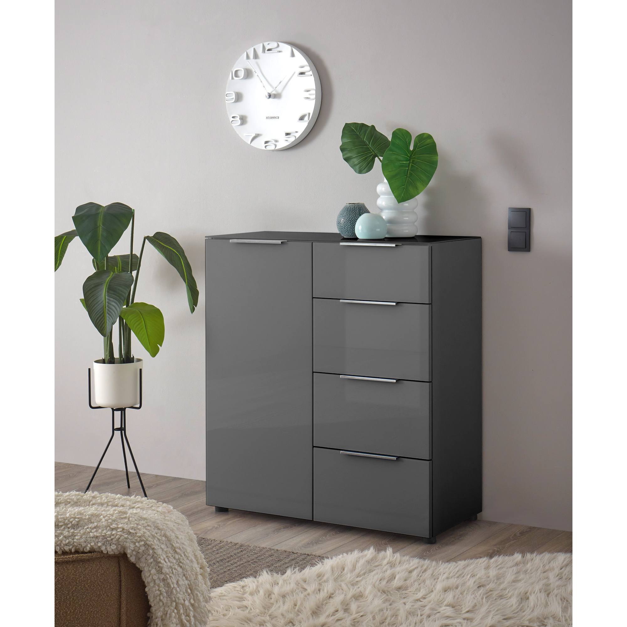 V komode celkom nájdete štyri zásuvky a dve police schované za praktickými dvierkami. Ich manipuláciu vám uľahčí systém dovierania SOFT CLOSE a decentné kovové rúčky. Laminovaný drevený materiál sa ľahko udržuje.