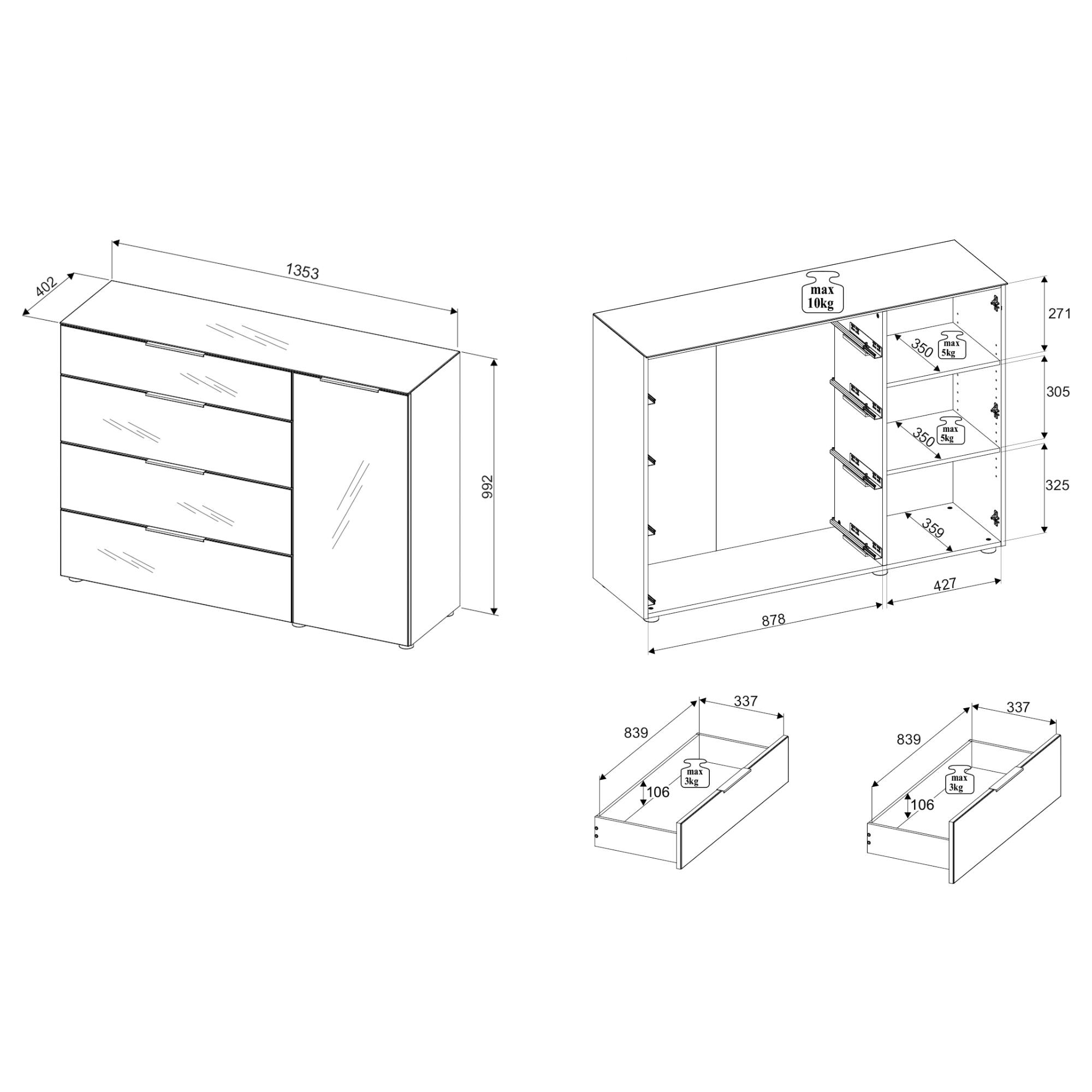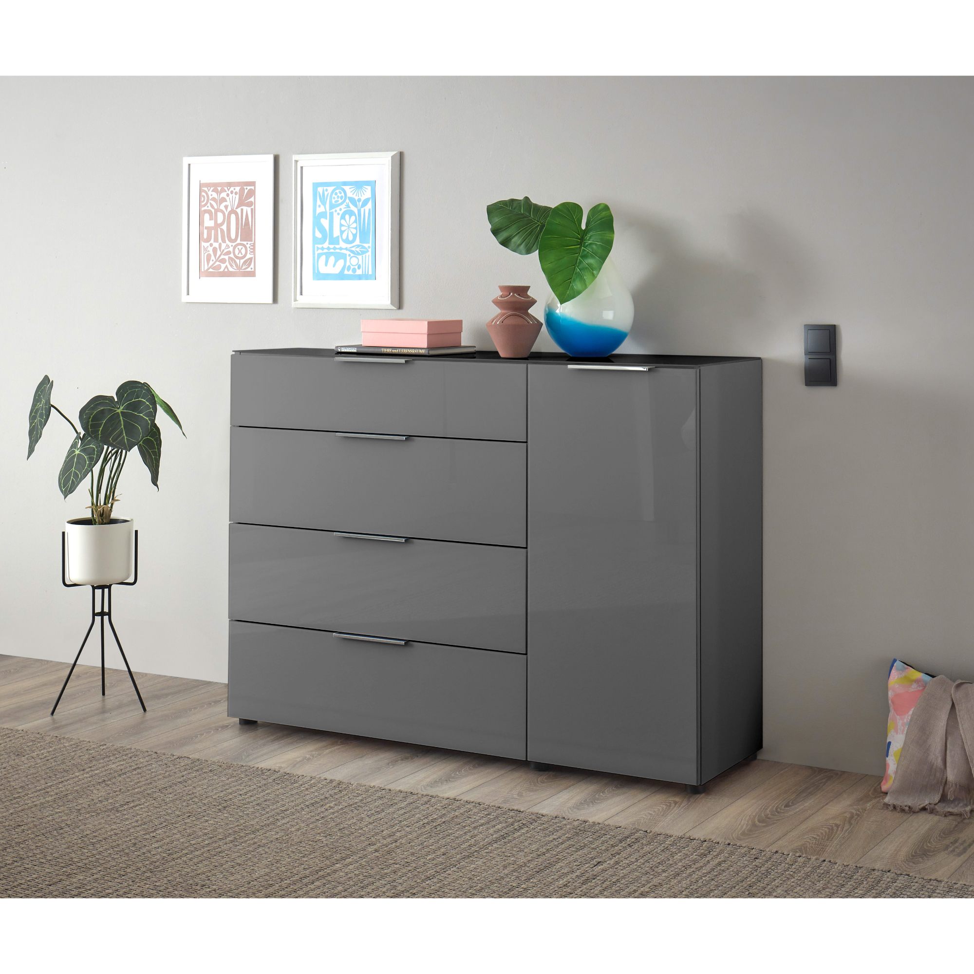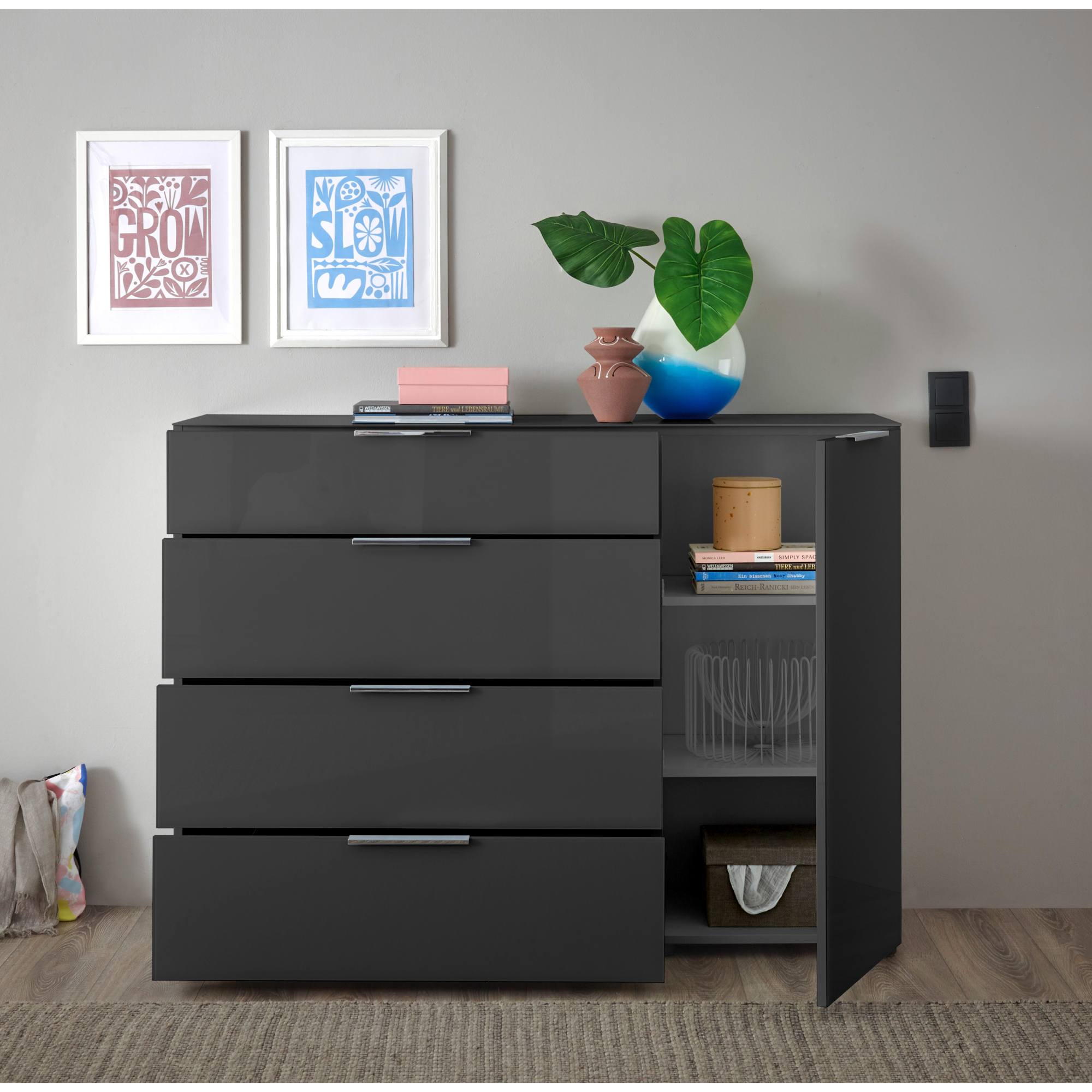 V komode celkom nájdete štyri zásuvky a dve police schované za praktickými dvierkami. Ich manipuláciu vám uľahčí systém dovierania SOFT CLOSE a decentné kovové rúčky. Laminovaný drevený materiál sa ľahko udržuje.