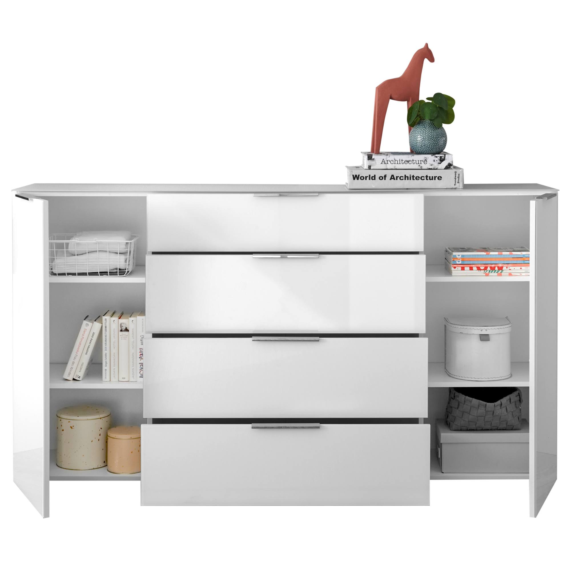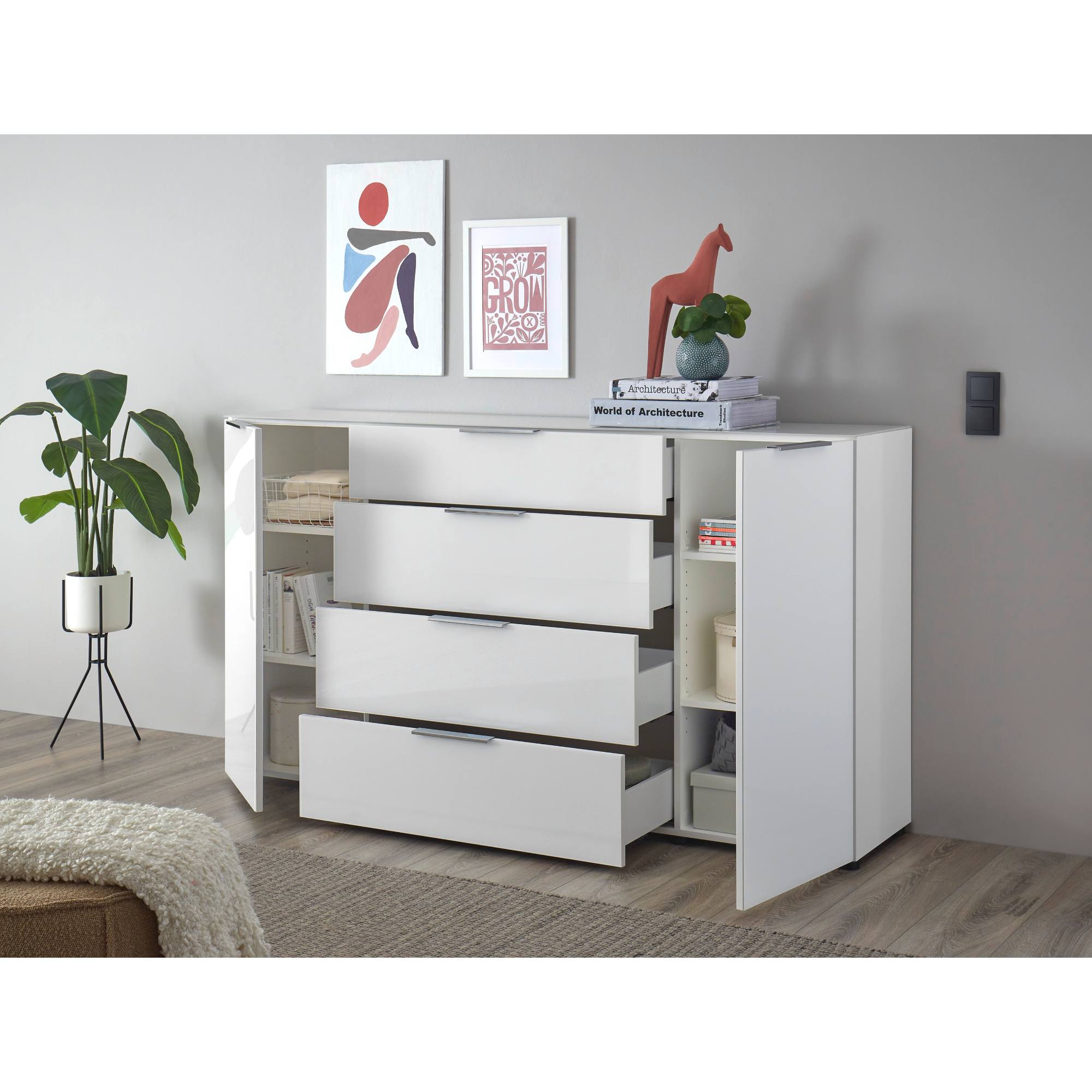 V komode celkom nájdete štyri zásuvky a štyri police schované za praktickými dvierkami. Ich manipuláciu vám uľahčí systém dovierania SOFT CLOSE a decentné kovové rúčky. Laminovaný drevený materiál sa ľahko udržuje.