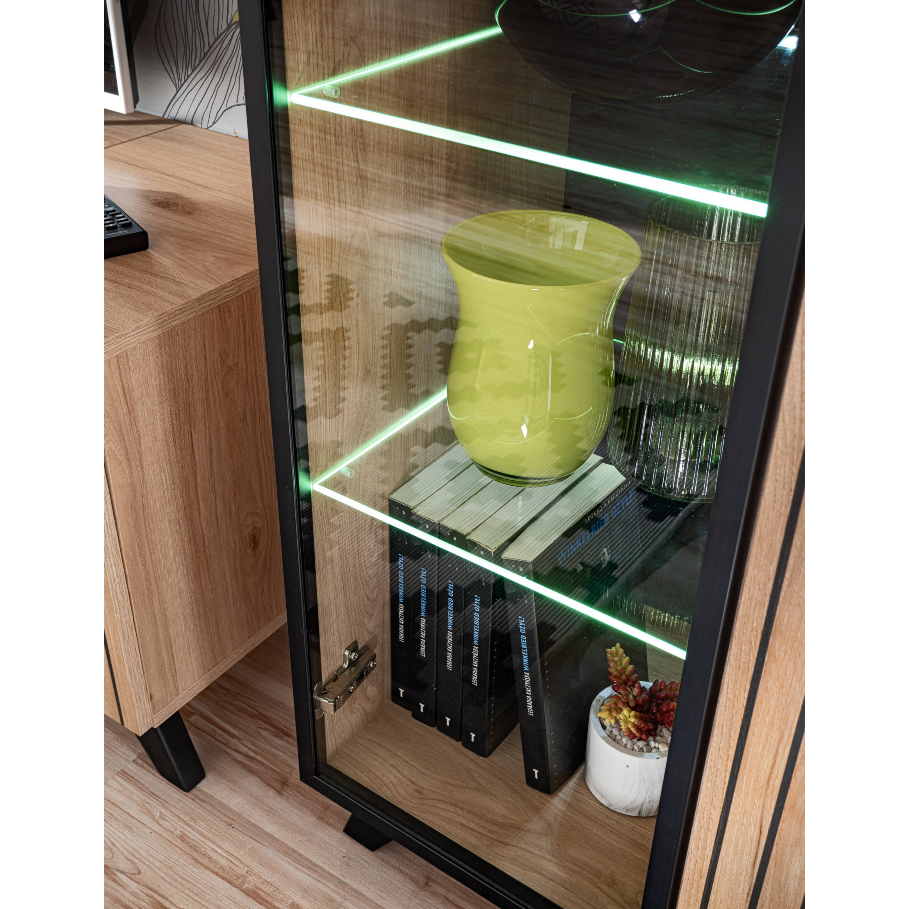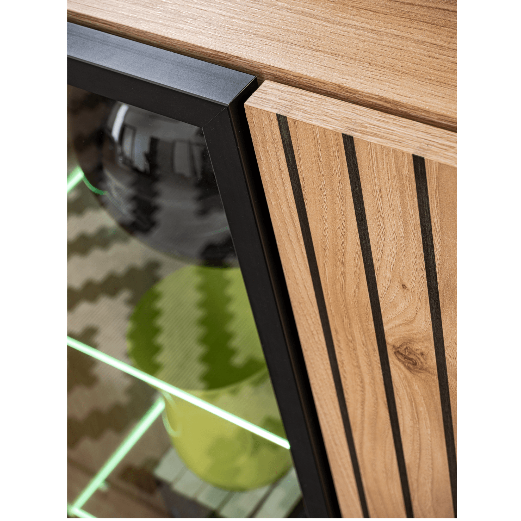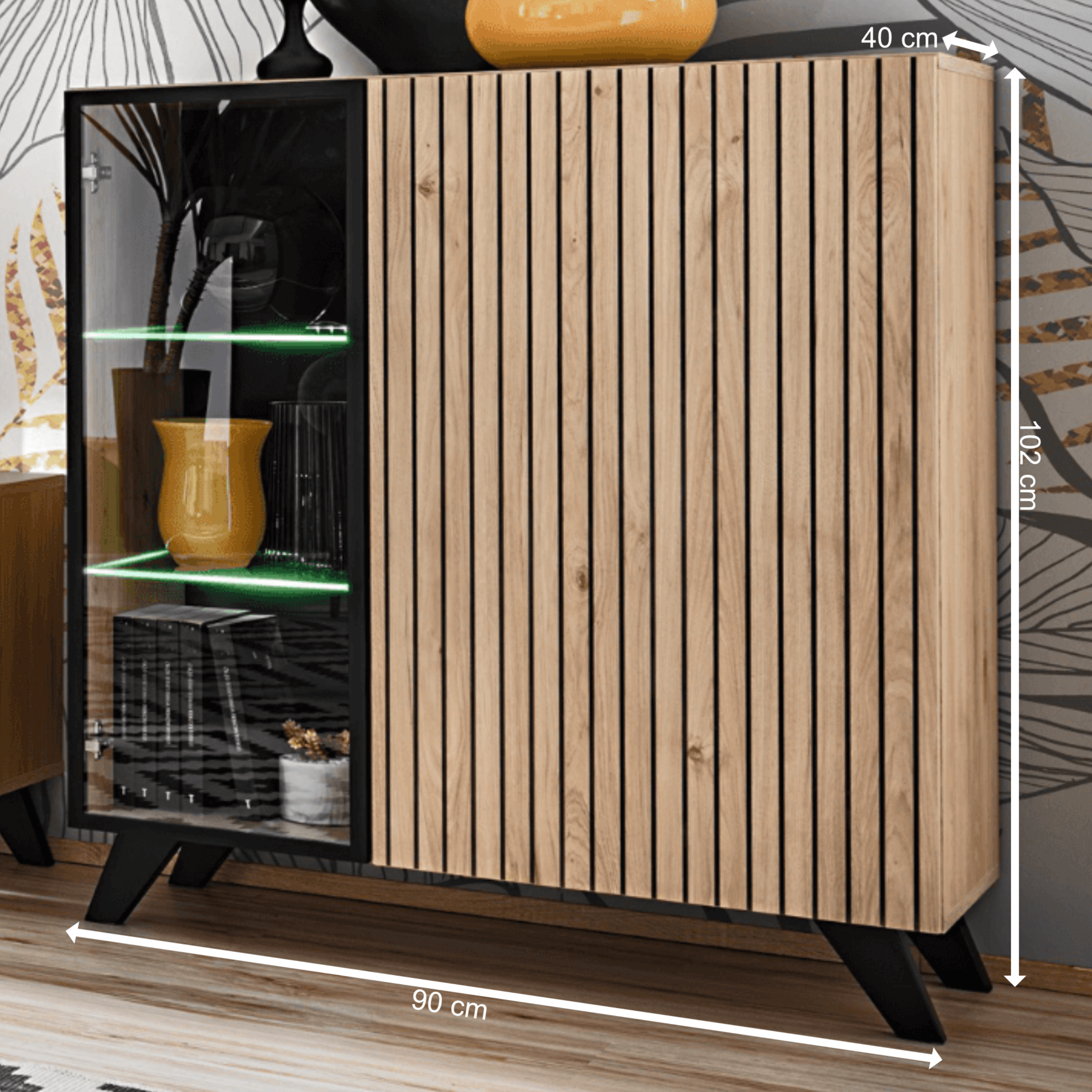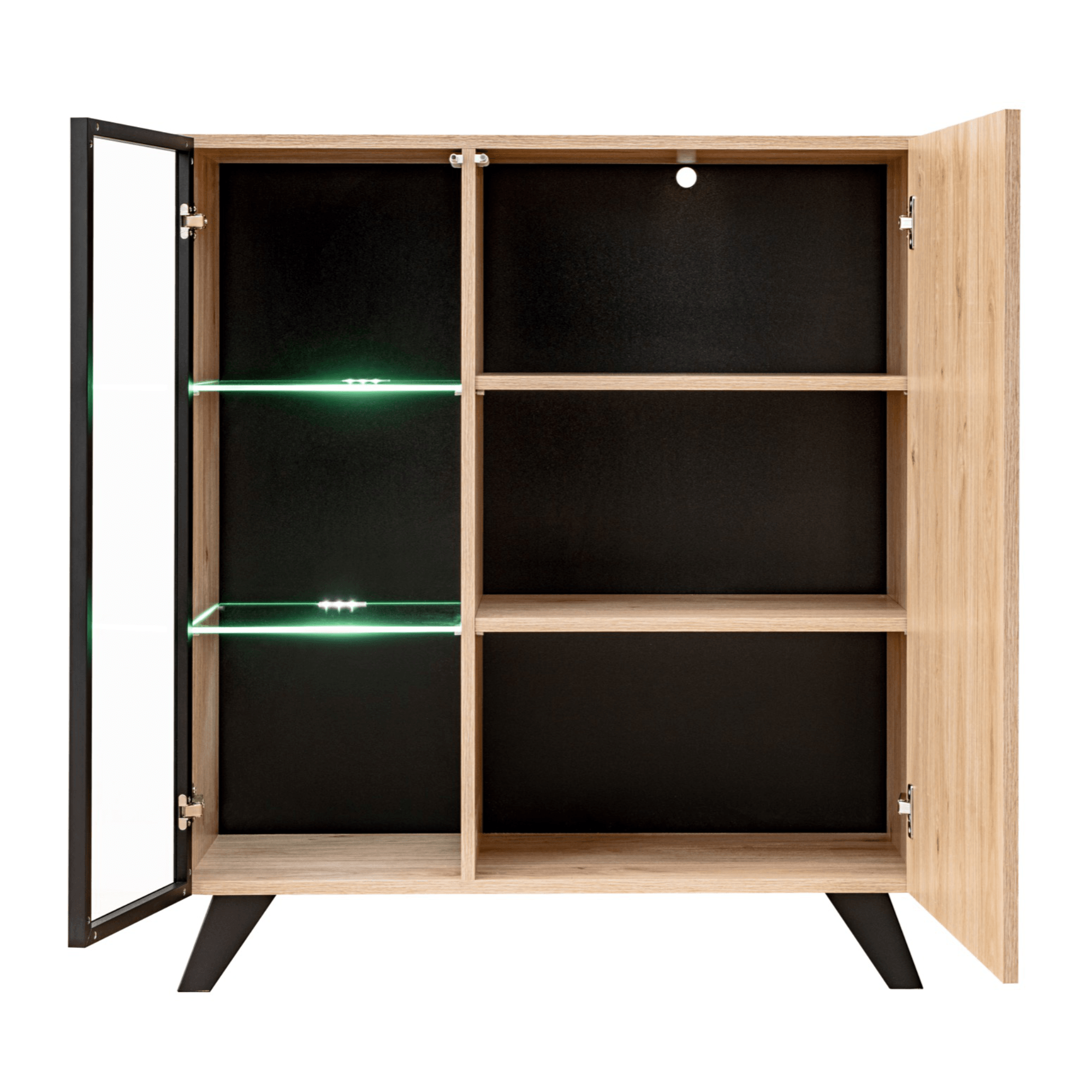 Komoda je vyrobená z laminovaného dreveného materiálu, pre ktorý je typická jednoduchá udržiavateľnosť aj dlhá životnosť. Ladená je do dreveného dekora svetlého prírodného odtieňa, predná plocha disponuje dekoratívnym mriežkovaním v kontrastnom čiernom vyhotovení. Bohatý úložný priestor je členený do dvoch oddielov krytých dvierkami – naľavo presklené s hliníkovým rámom, za tými sa nachádzajú dve sklenené police a praktické LED podsvietenie, ktoré zvýrazňuje štýl komody a zútulňuje interiér, pravá strana disponuje klasickými dvierkami, za ktorými sú ďalšie dve police z lamina. Dvierka sú bezrúčkové – stačí stlačiť a úložný priestor sa otvorí. Komoda stojí na drevených nohách.