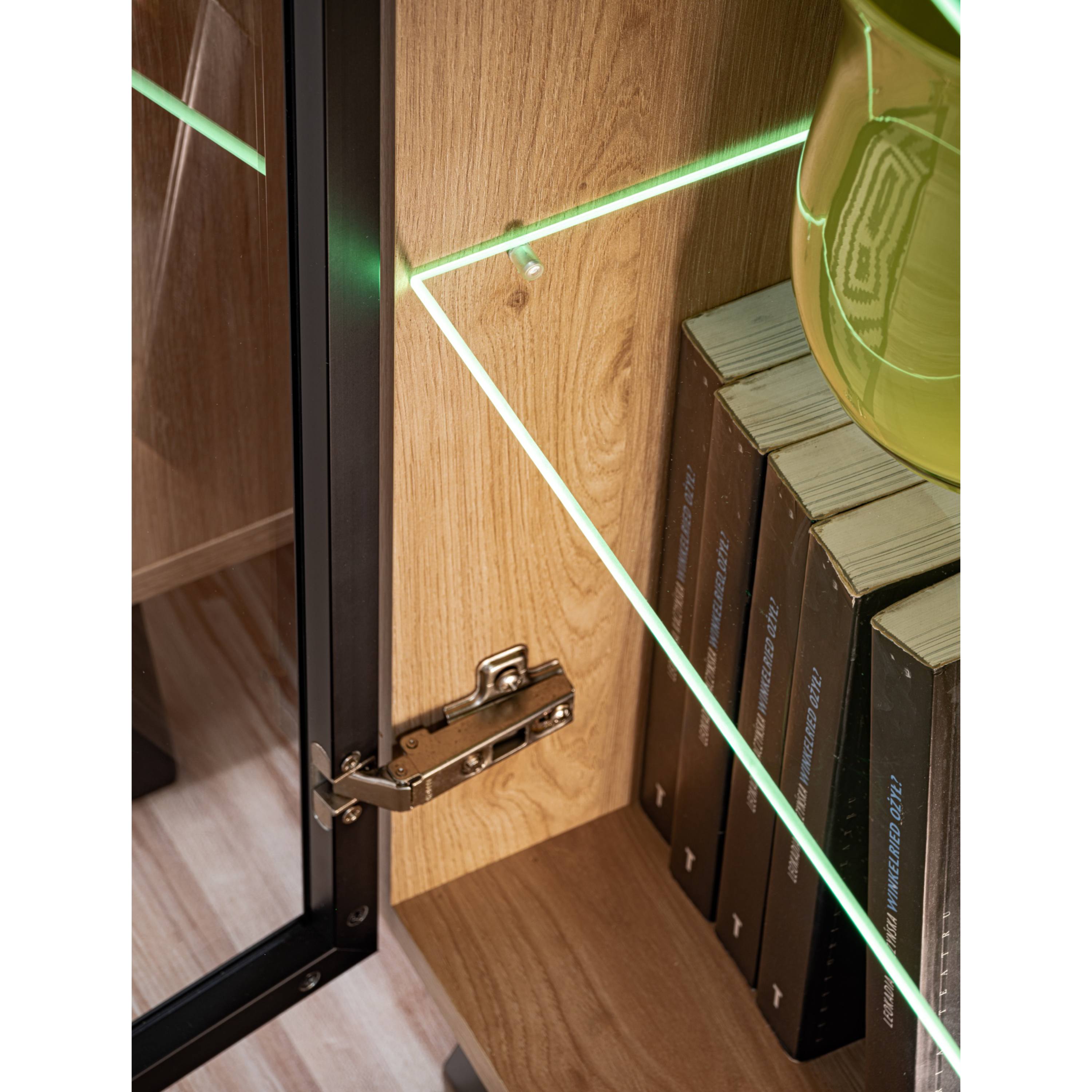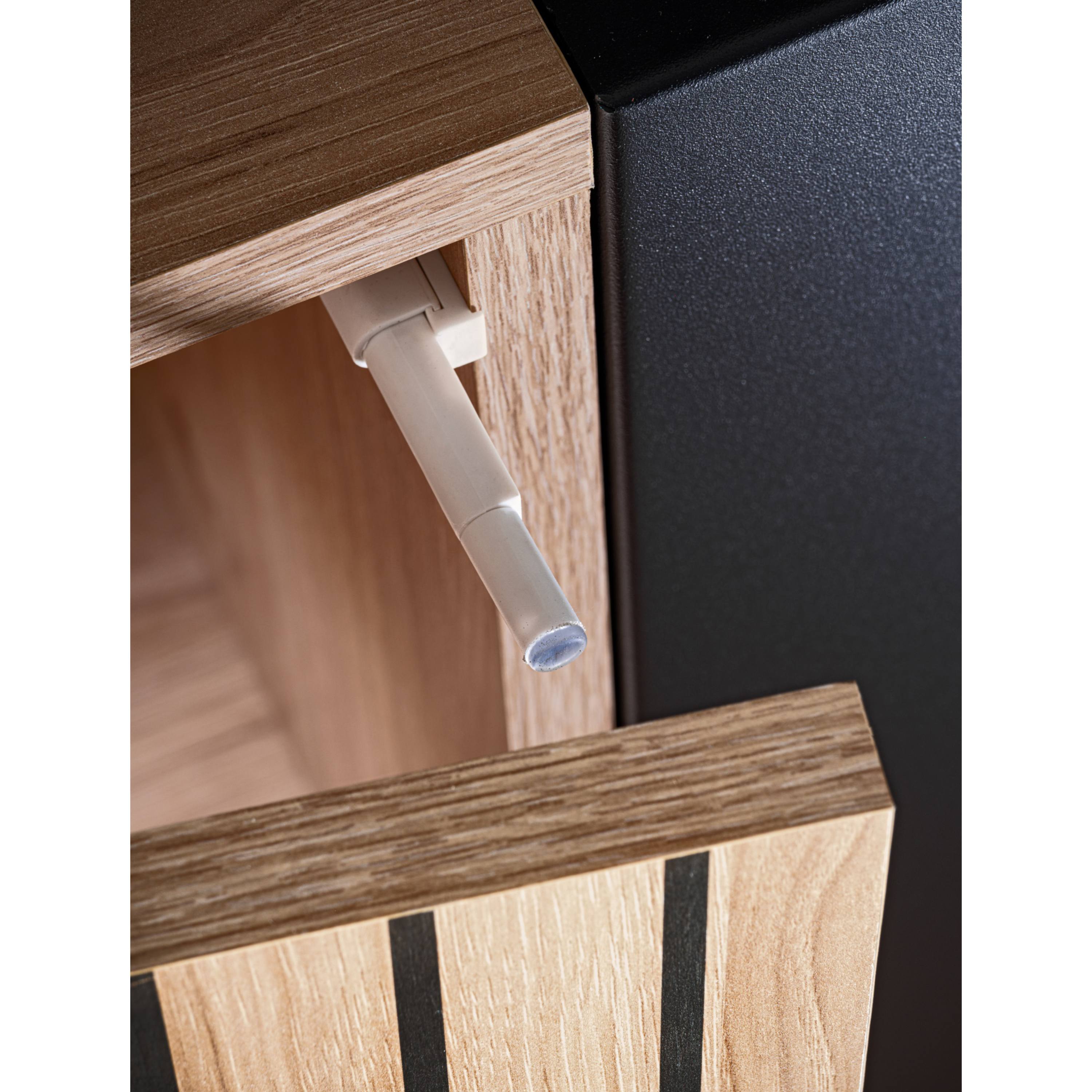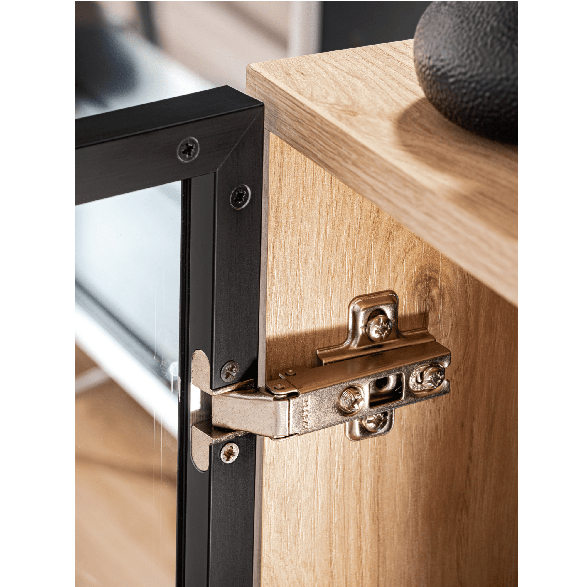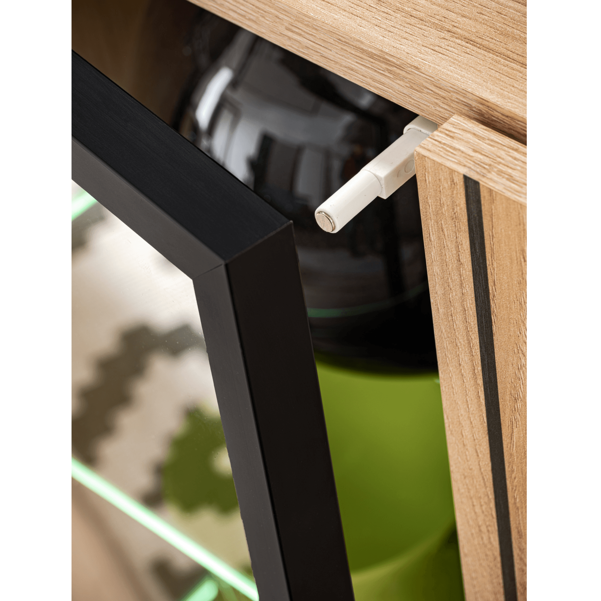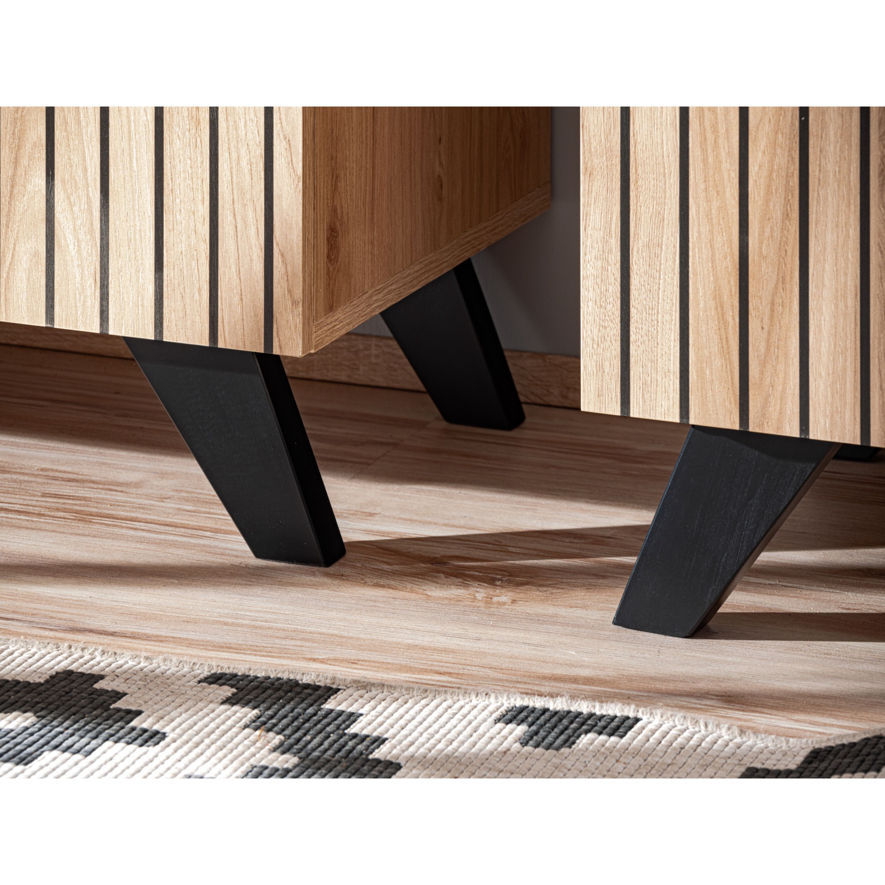 Komoda je vyrobená z laminovaného dreveného materiálu, pre ktorý je typická jednoduchá udržiavateľnosť aj dlhá životnosť. Ladená je do dreveného dekora svetlého prírodného odtieňa, predná plocha disponuje dekoratívnym mriežkovaním v kontrastnom čiernom vyhotovení. Bohatý úložný priestor je členený do dvoch oddielov krytých dvierkami – naľavo presklené s hliníkovým rámom, za tými sa nachádzajú dve sklenené police a praktické LED podsvietenie, ktoré zvýrazňuje štýl komody a zútulňuje interiér, pravá strana disponuje klasickými dvierkami, za ktorými sú ďalšie dve police z lamina. Dvierka sú bezrúčkové – stačí stlačiť a úložný priestor sa otvorí. Komoda stojí na drevených nohách.