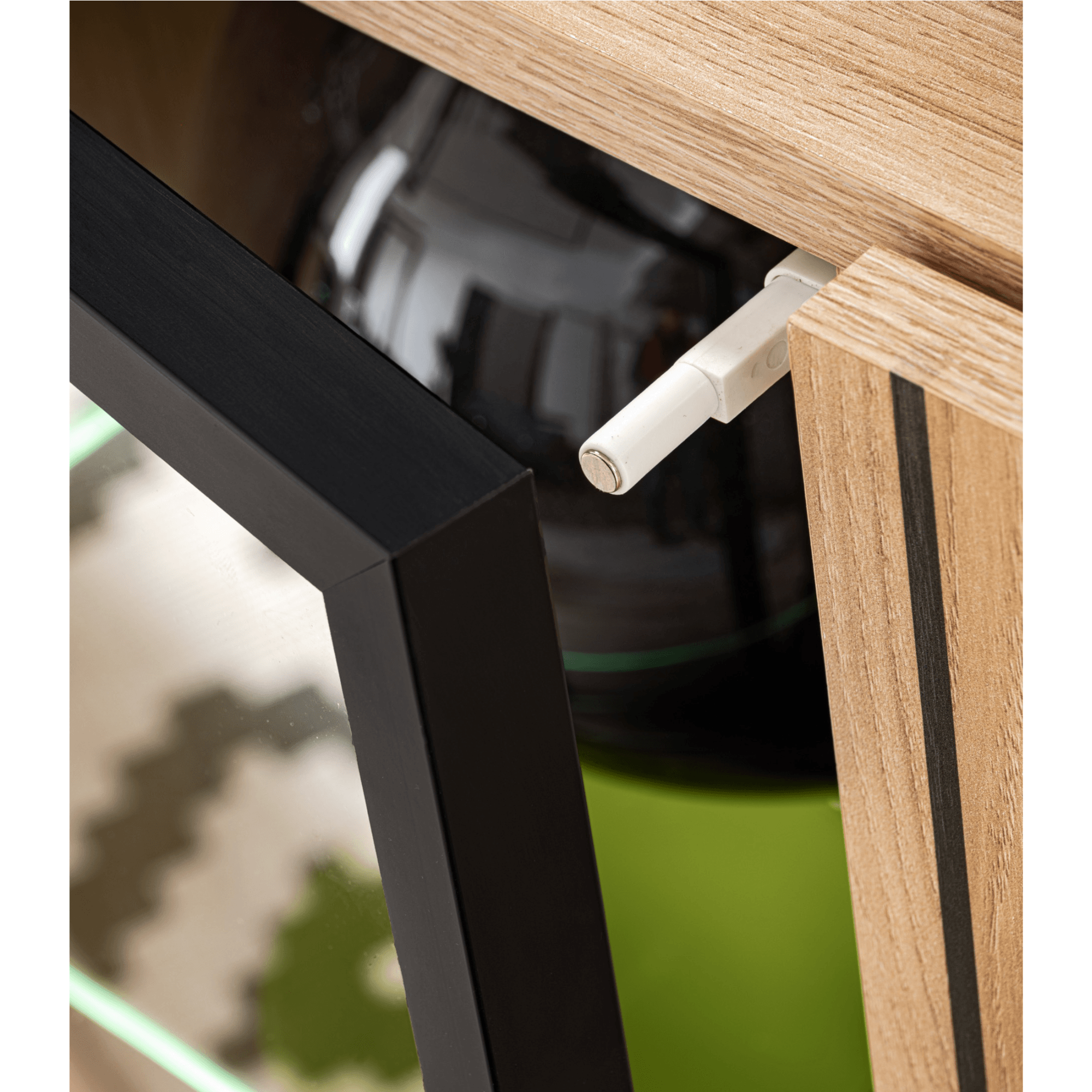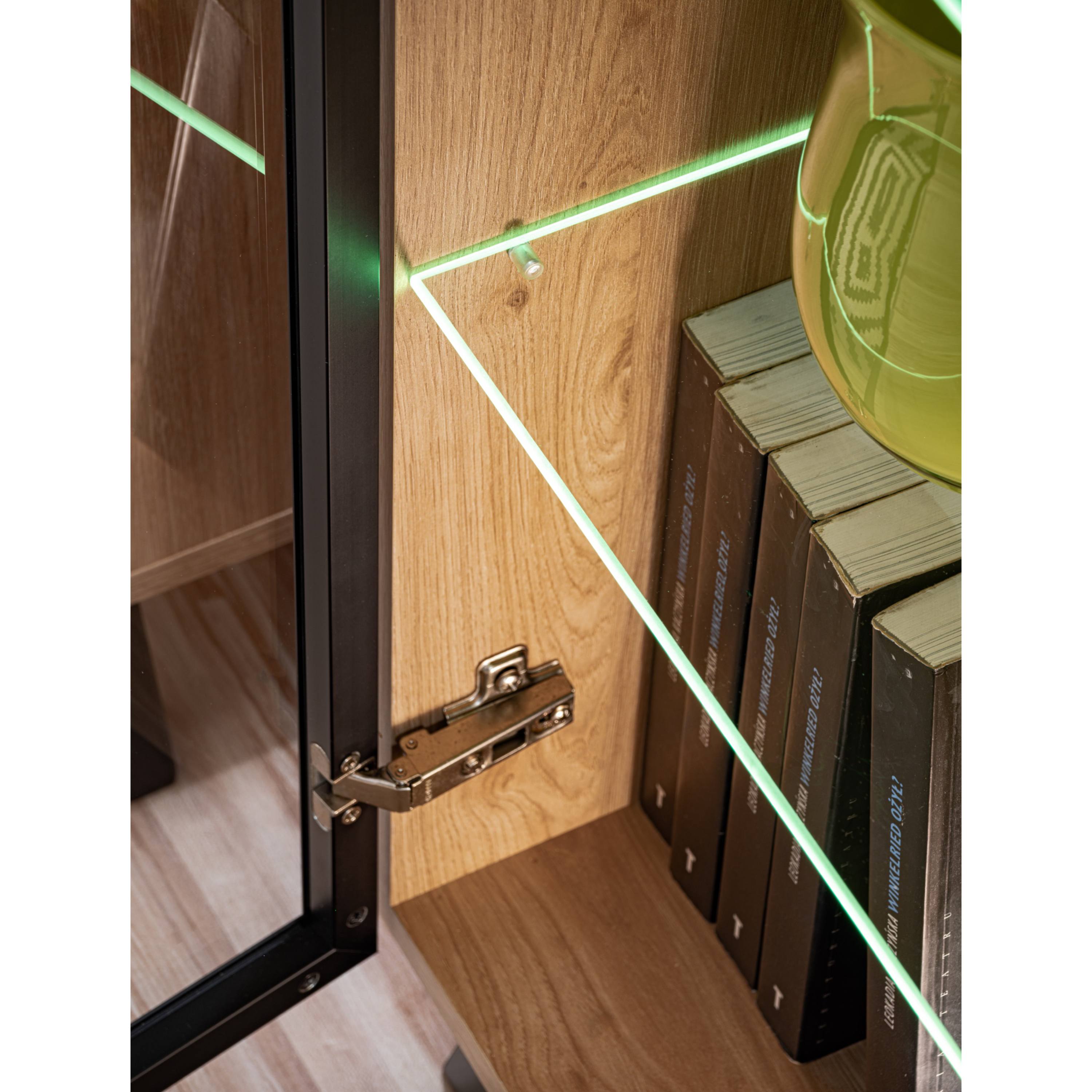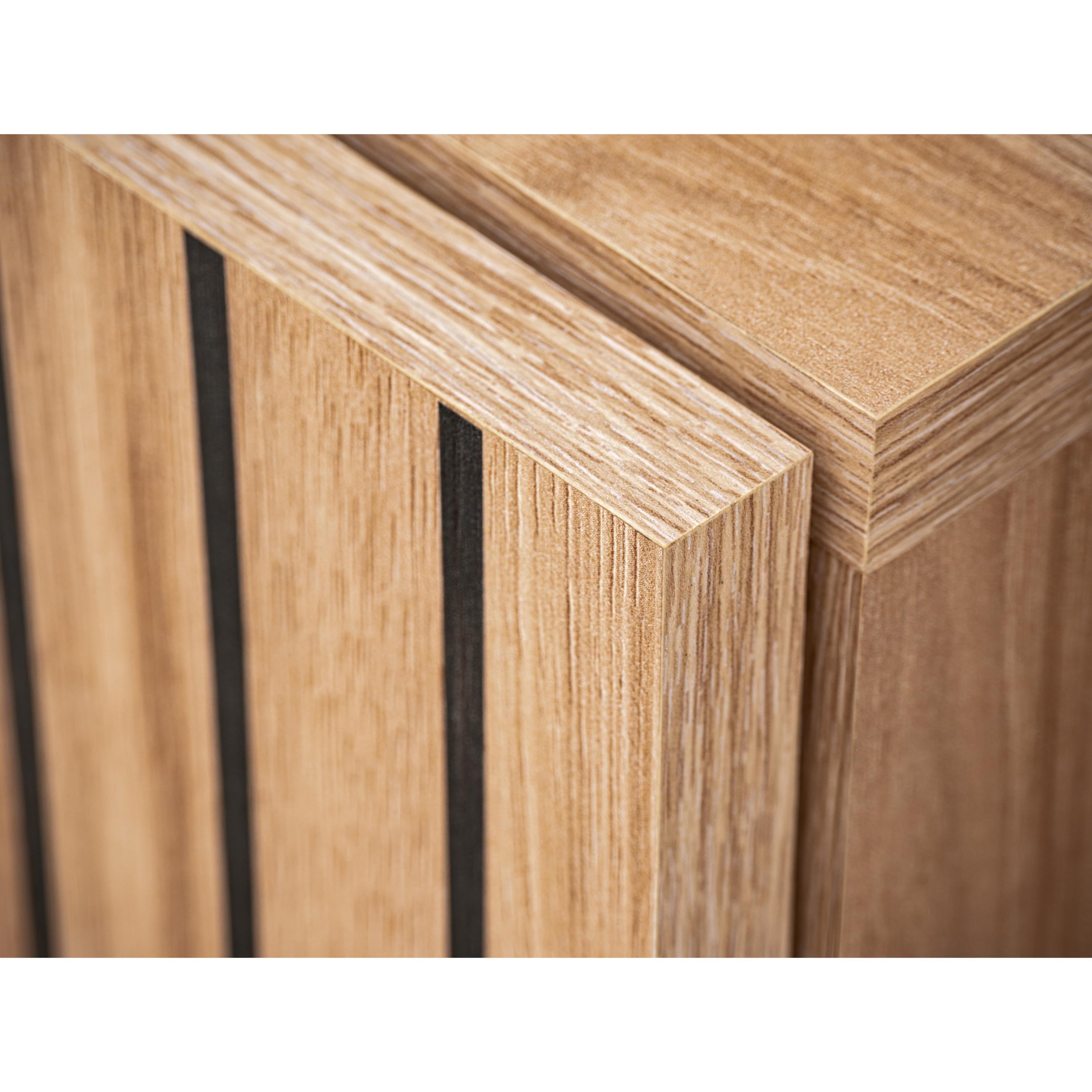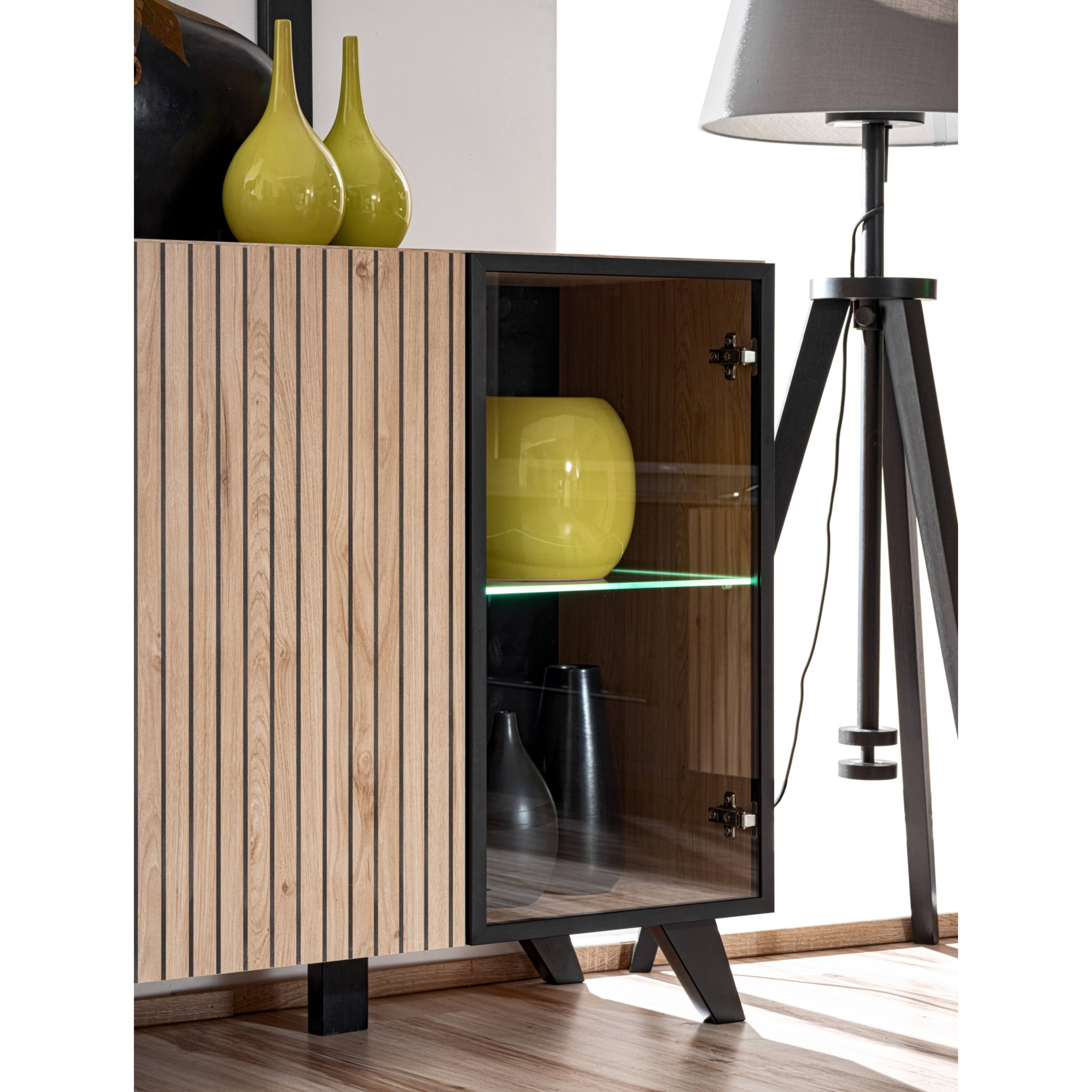 Komoda je vyrobená z laminovaného dreveného materiálu, pre ktorý je typická jednoduchá udržiavateľnosť aj dlhá životnosť. Ladená je do dreveného dekora svetlého prírodného odtieňa, predná plocha disponuje dekoratívnym mriežkovaním v kontrastnom čiernom vyhotovení. Bohatý úložný priestor je členený do troch oddielov krytých dvierkami – naľavo aj napravo presklené s hliníkovým rámom, za nimi sa nachádza sklenená polica a praktické LED podsvietenie, ktoré zvýrazňuje štýl komody a zútulňuje interiér, centrálny priestor disponuje klasickými dvierkami, za ktorými je polica z lamina. Dvierka sú bezrúčkové – stačí stlačiť a úložný priestor sa otvorí. Komoda stojí na drevených nohách.