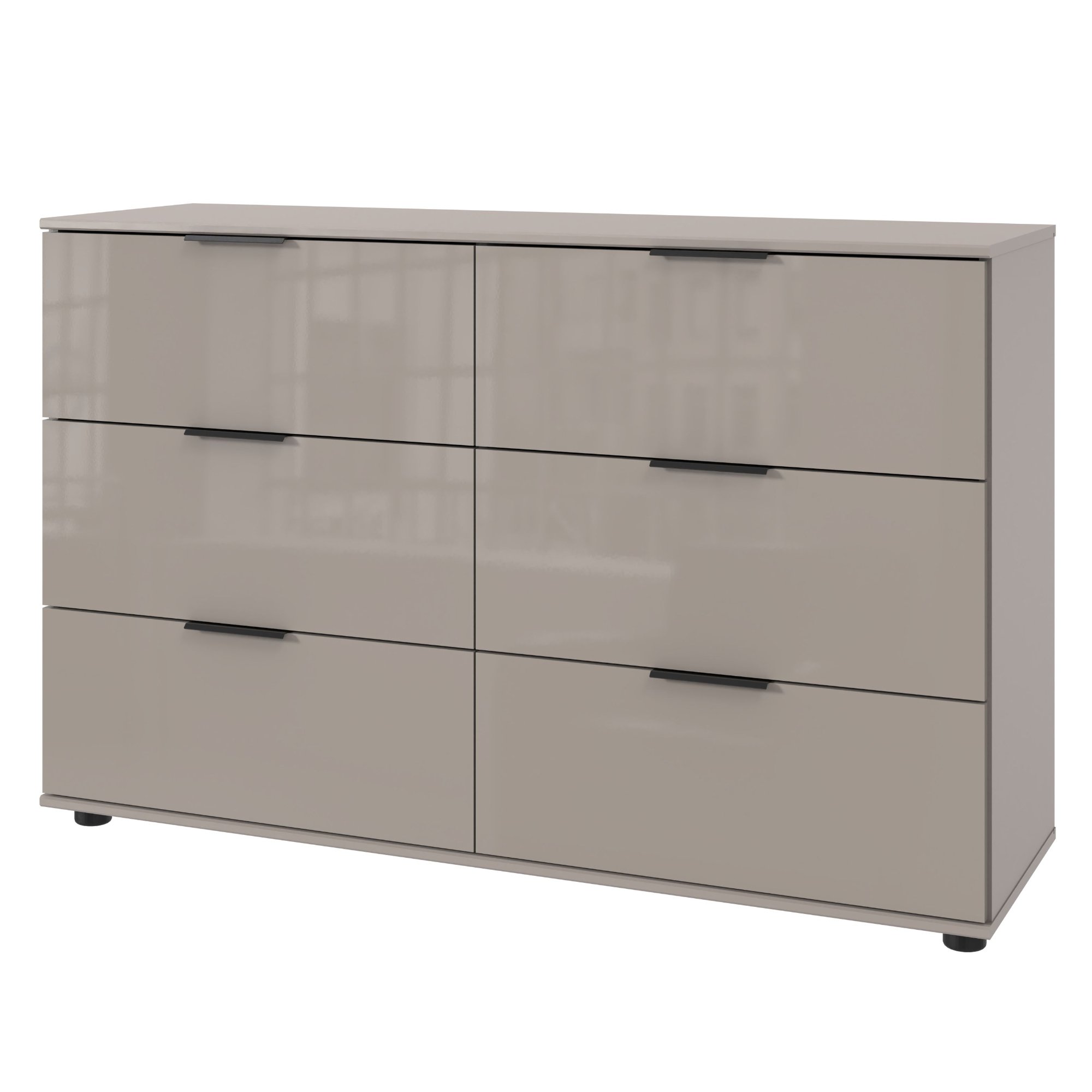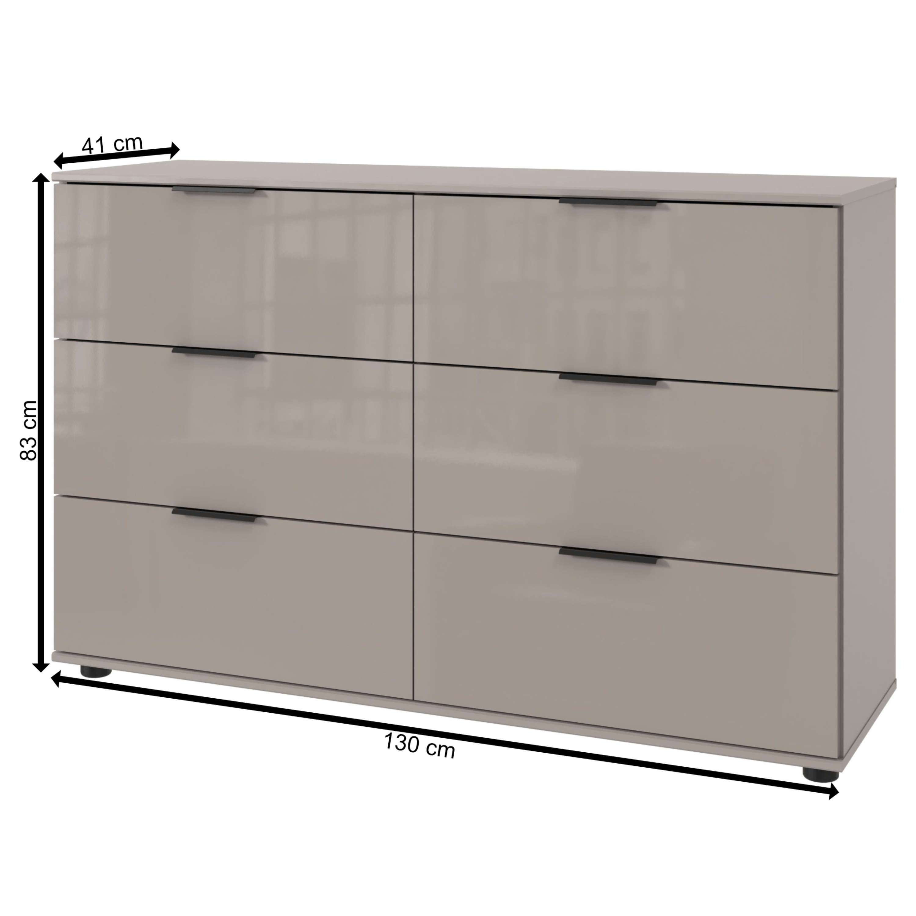 Predná strana komody je potiahnutá sklom. Komoda disponuje 6 praktickými zásuvkami, ktoré sú ideálne na uskladnenie drobností.