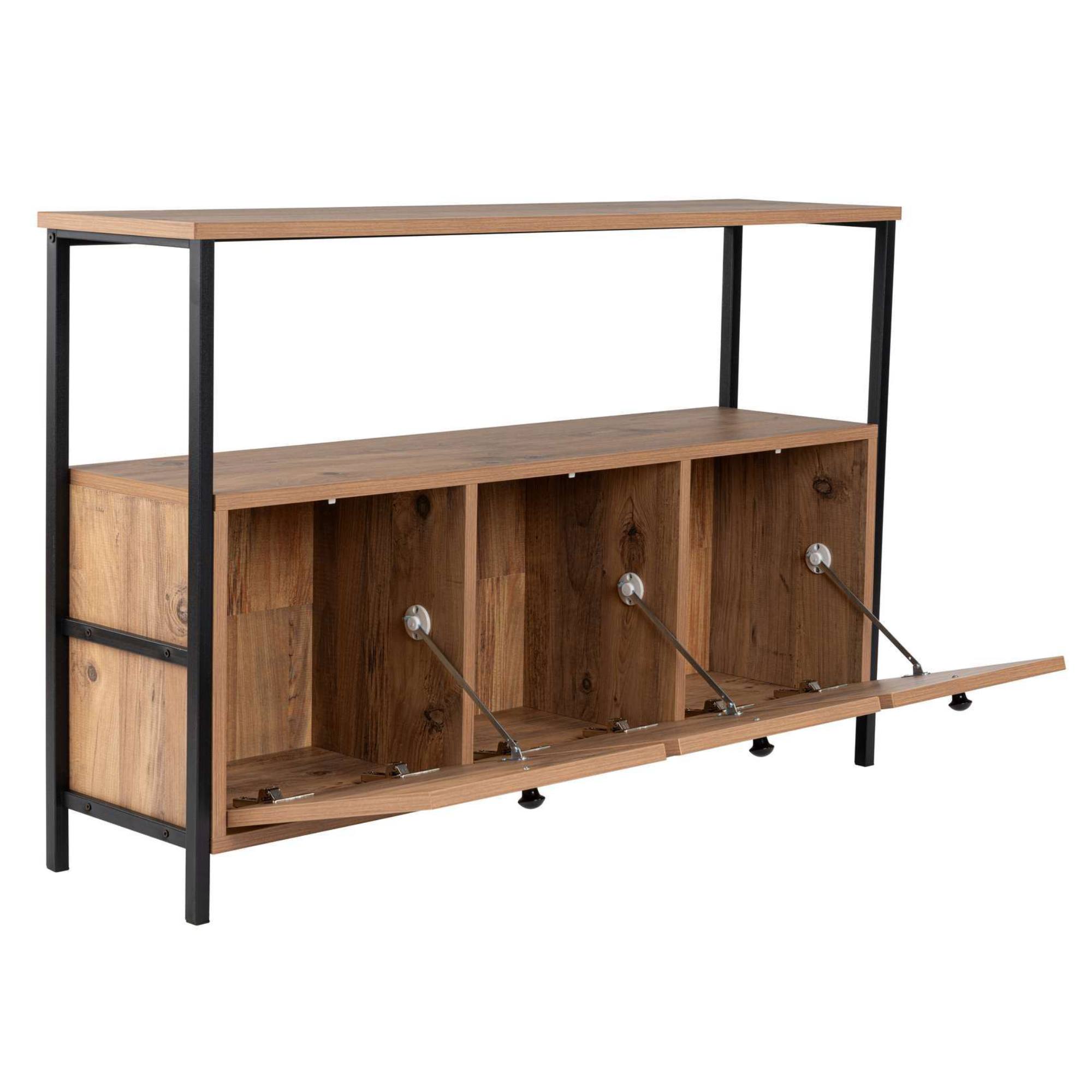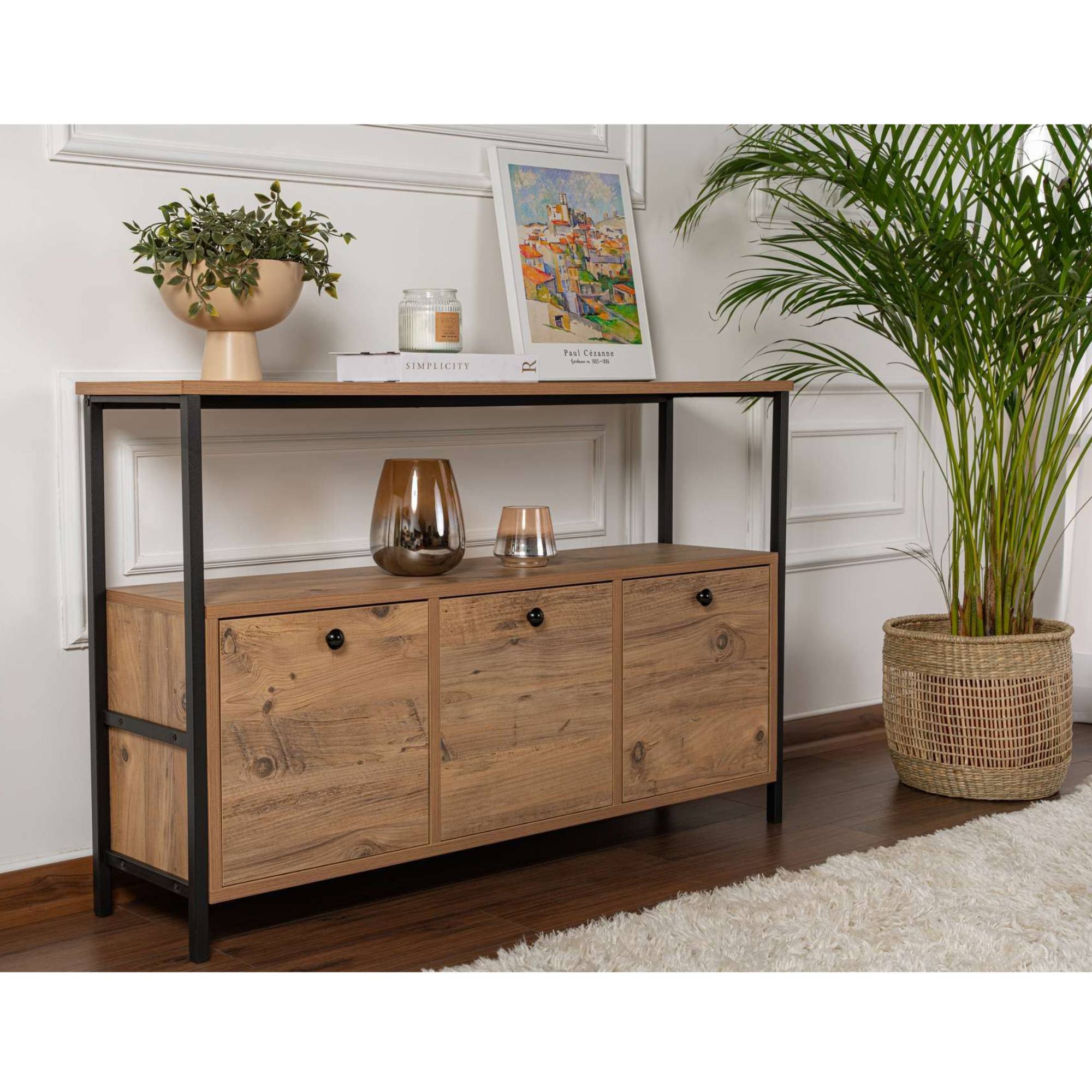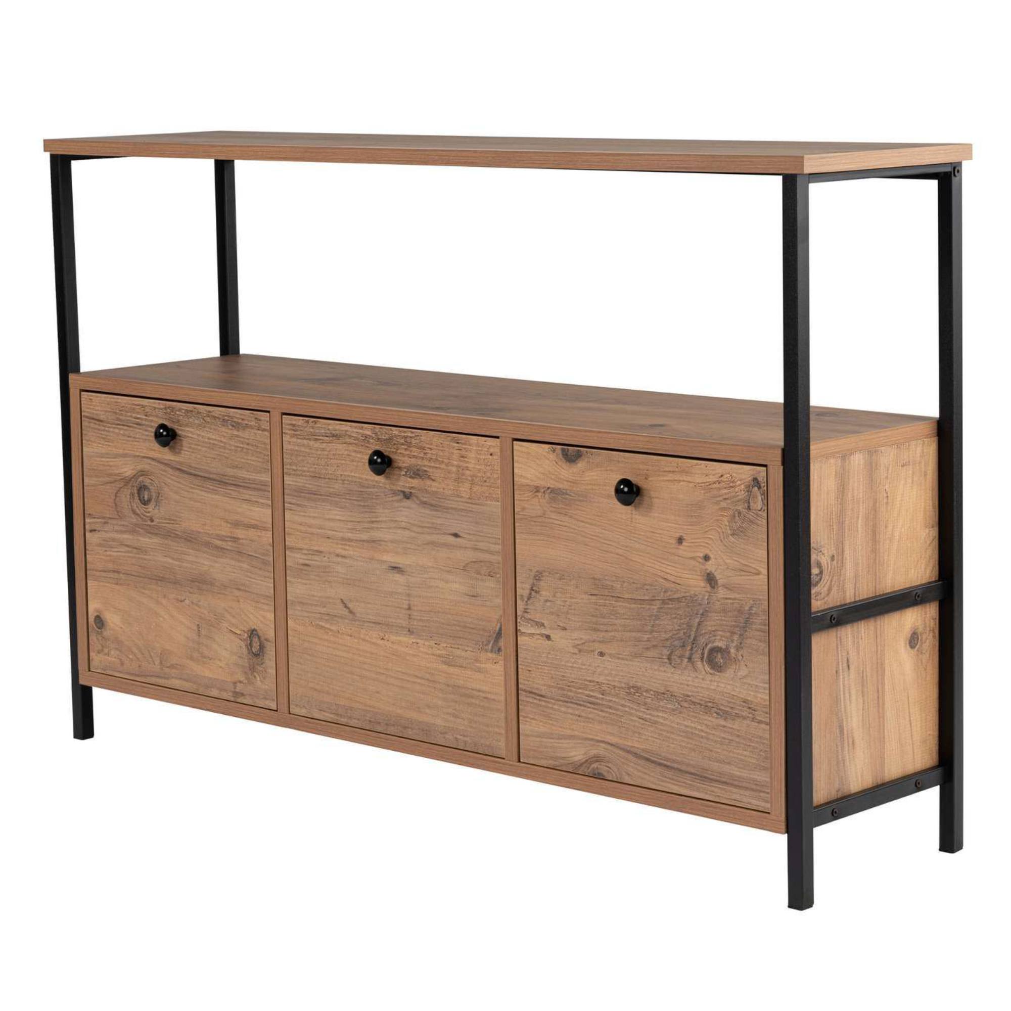 Komoda SOLACE vyhotovená v industriálnom dizajne ponúka dostatok otvoreného aj uzatvárateľného úložného priestoru.