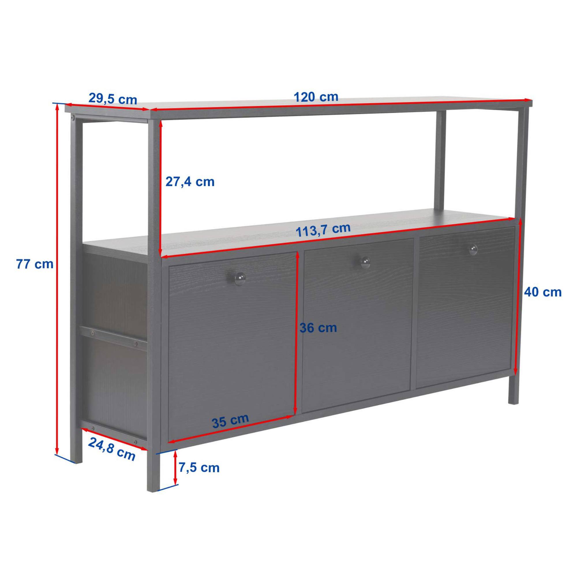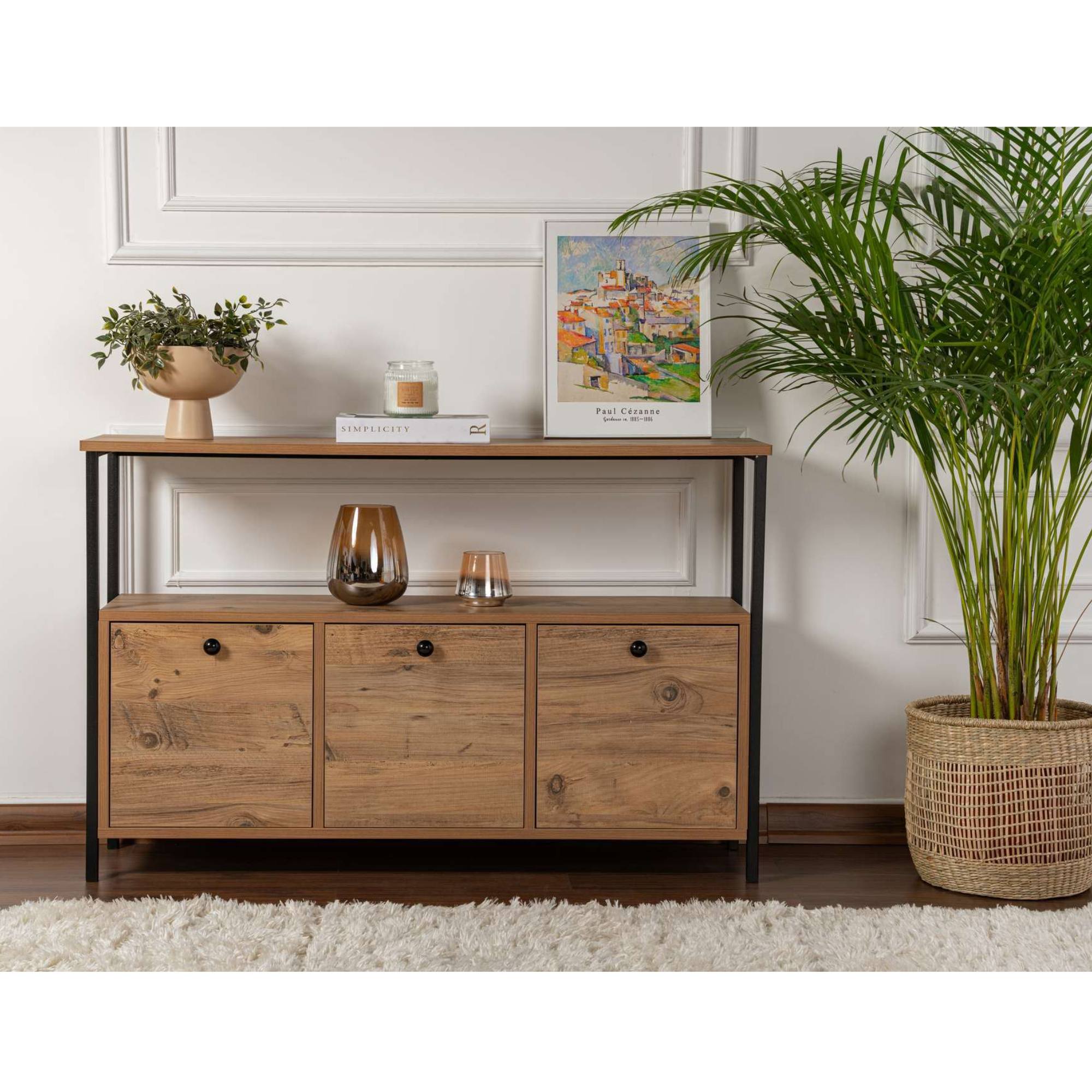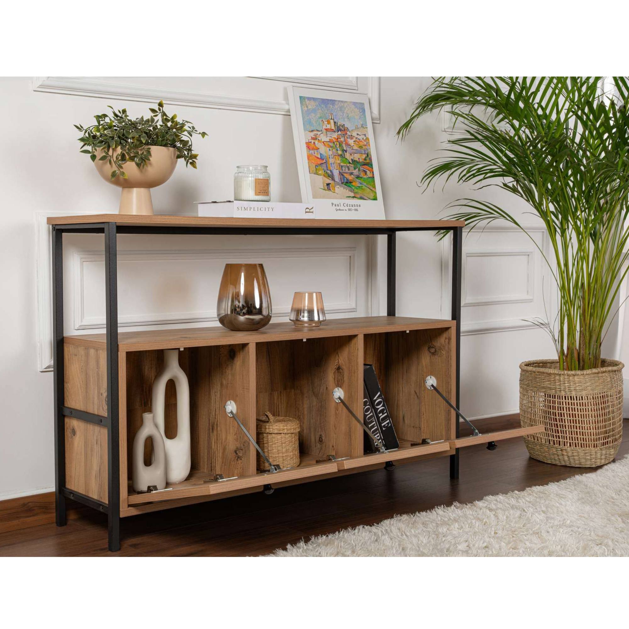 Komoda SOLACE vyhotovená v industriálnom dizajne ponúka dostatok otvoreného aj uzatvárateľného úložného priestoru.