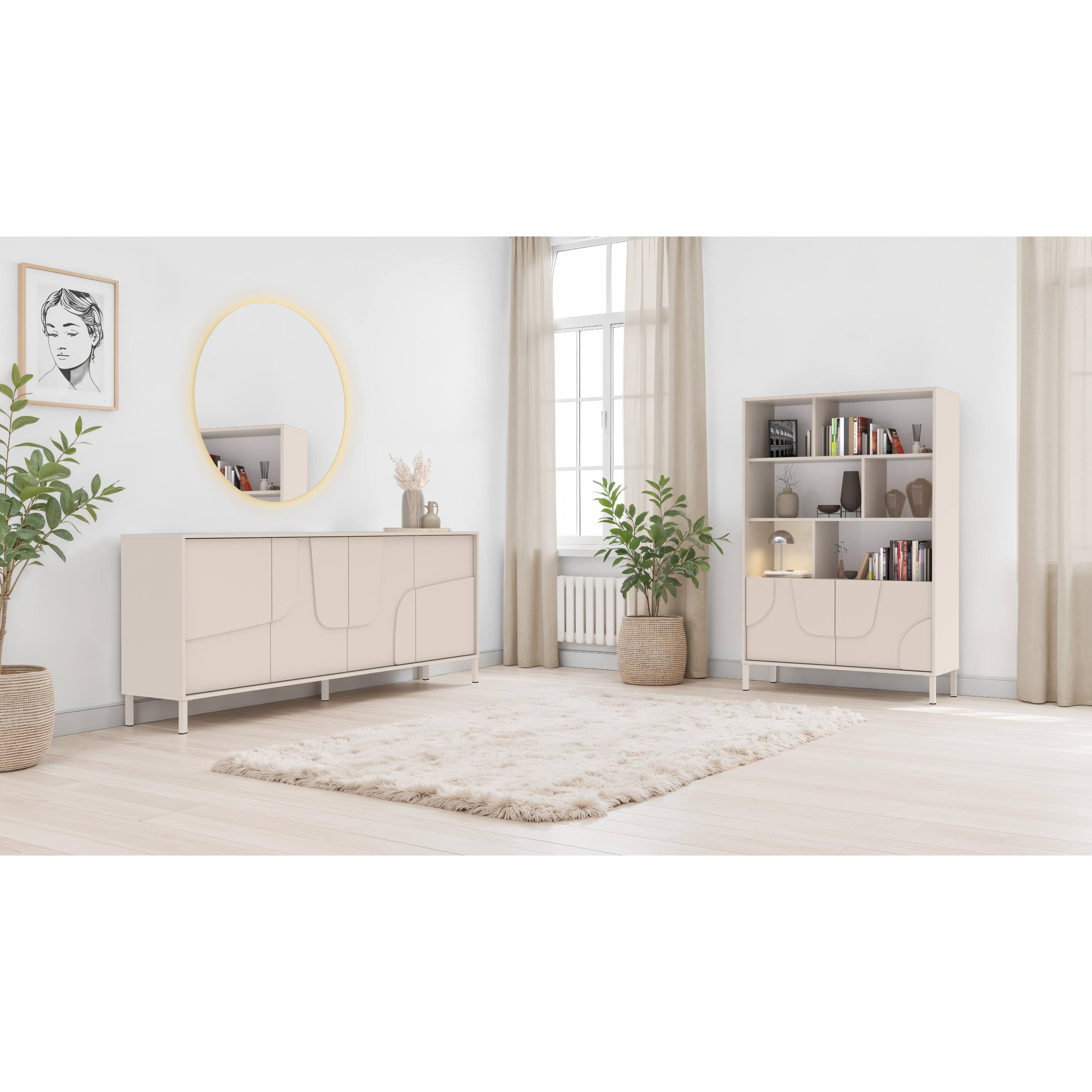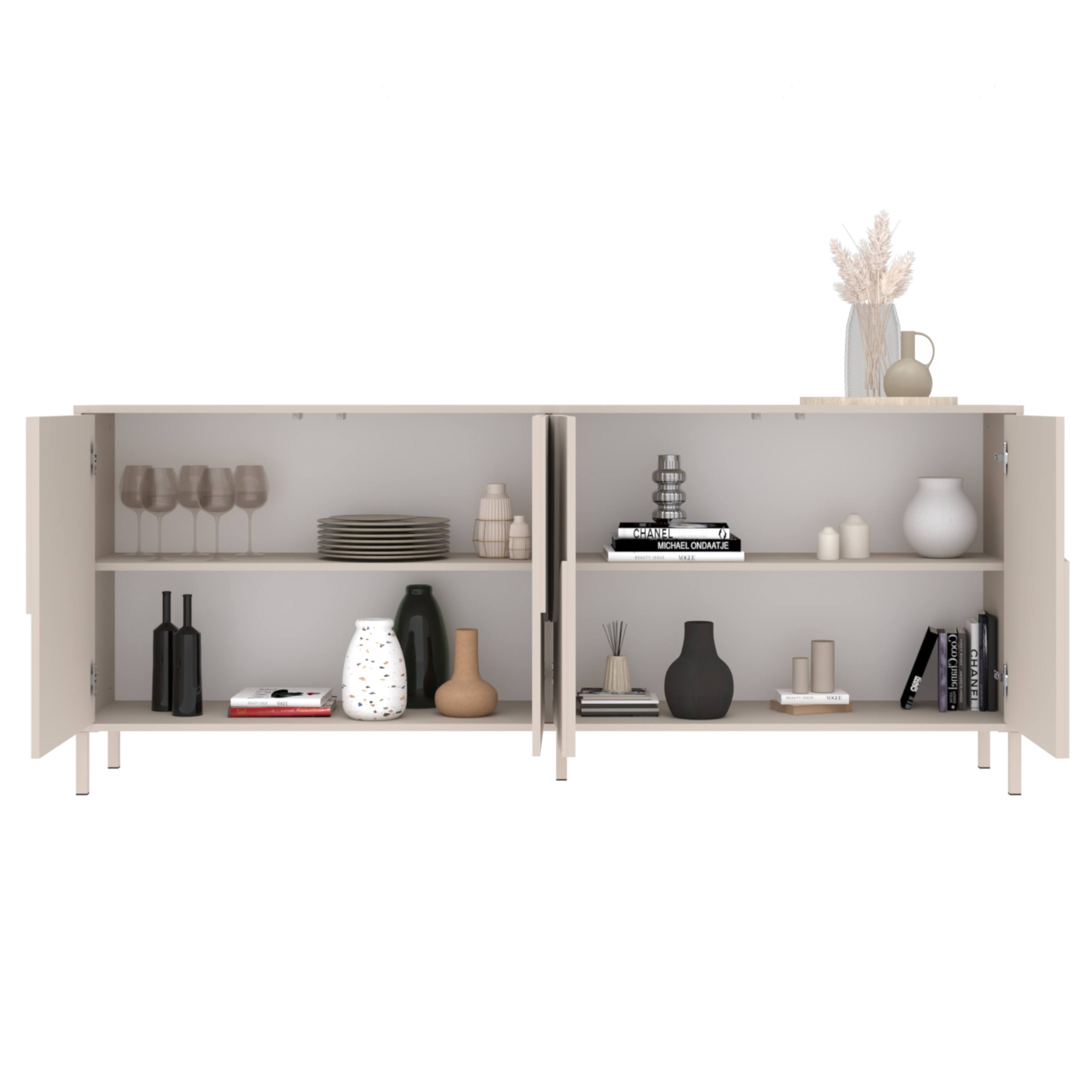 Vyrobená je z laminovaných drevotrieskových dosiek, ktoré sú ľahko udržiavateľné. Ladená je do odtieňa kašmírovej farby, ktorá interiér zútulní. Dostatok úložného priestoru potom nájdete za dvierkami. Komodu je možné doplniť o menšie plastové nožičky alebo o väčšie kovové nožičky, obe varianty sú súčasťou balenia.